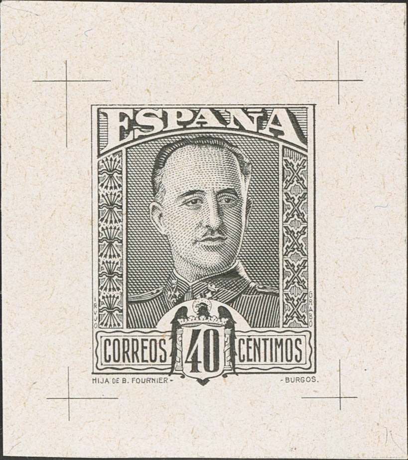 (★)(1940ca). 40 cts con la efigie de Franco de un proyecto no adoptado. PRUEBA LITGRAFICA. MAGNIFICA Y RARISIMA.