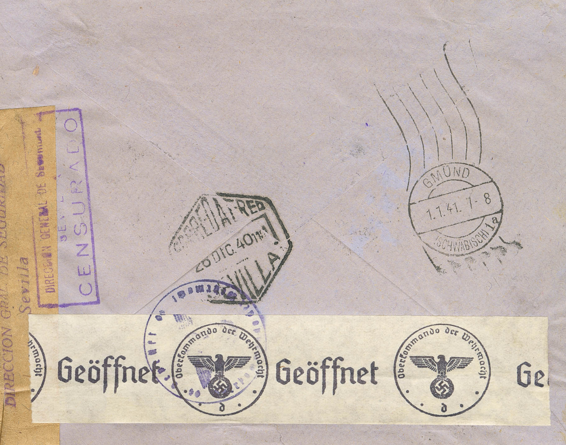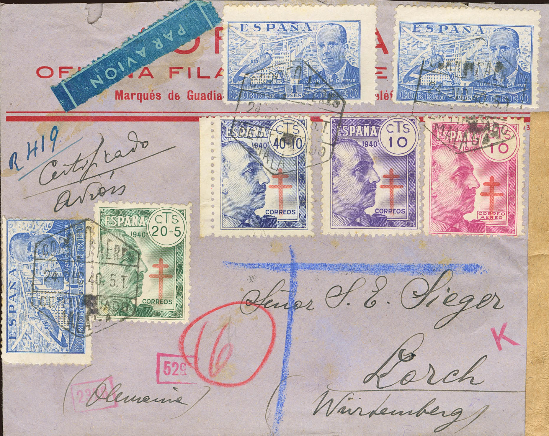 936/39. 1940. Serie completa. Correo Aéreo de MALAGA a LORCH (ALEMANIA). Al dorso tránsito. MAGNIFICA Y ESPECTACULAR.