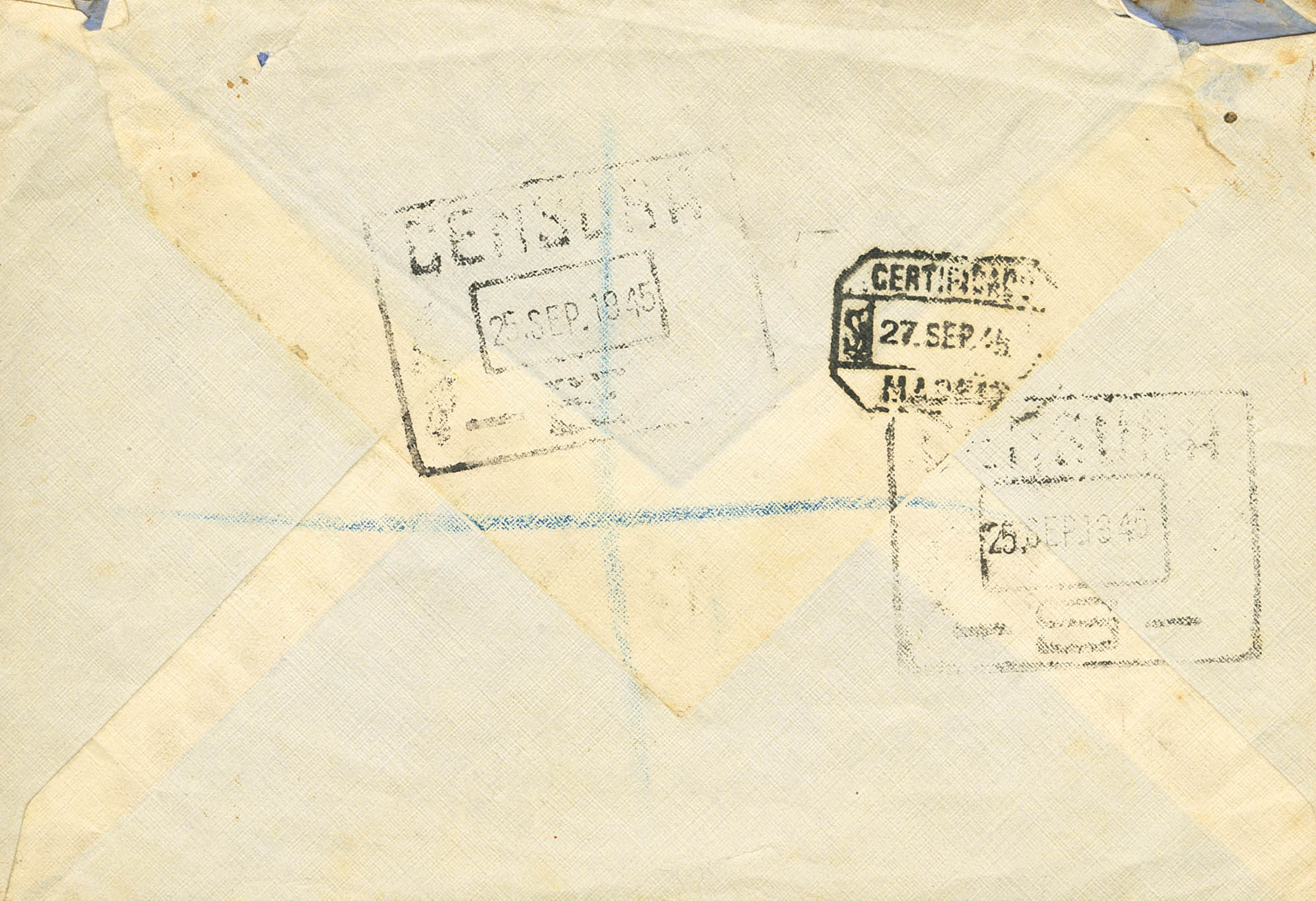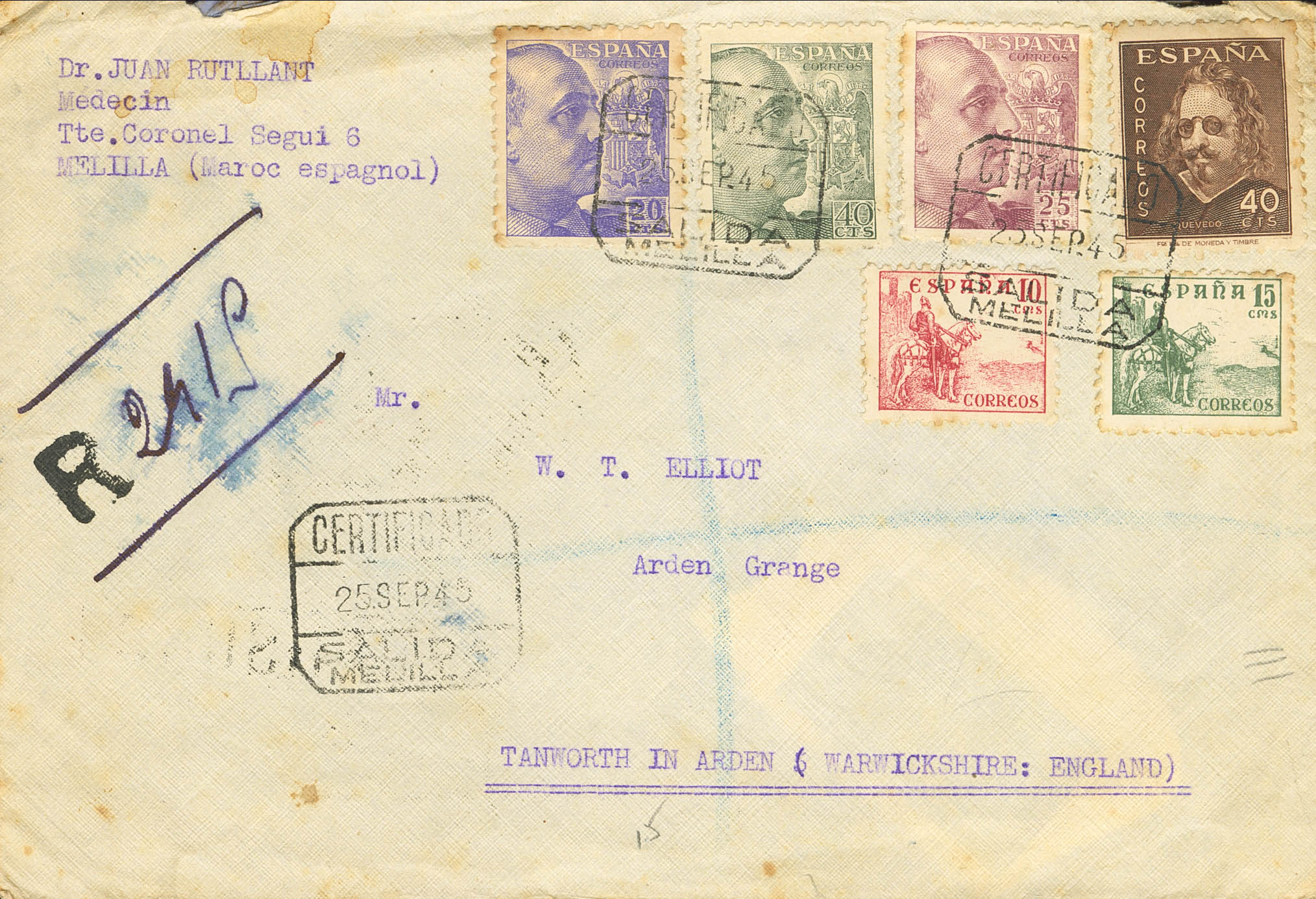 989. 1945. 40 cts castaño y diversas calidades. Certificado de MELILLA a TANWORTH IN ARDEN (REINO UNIDO). Al dorso tránsito. MAGNIFICO.