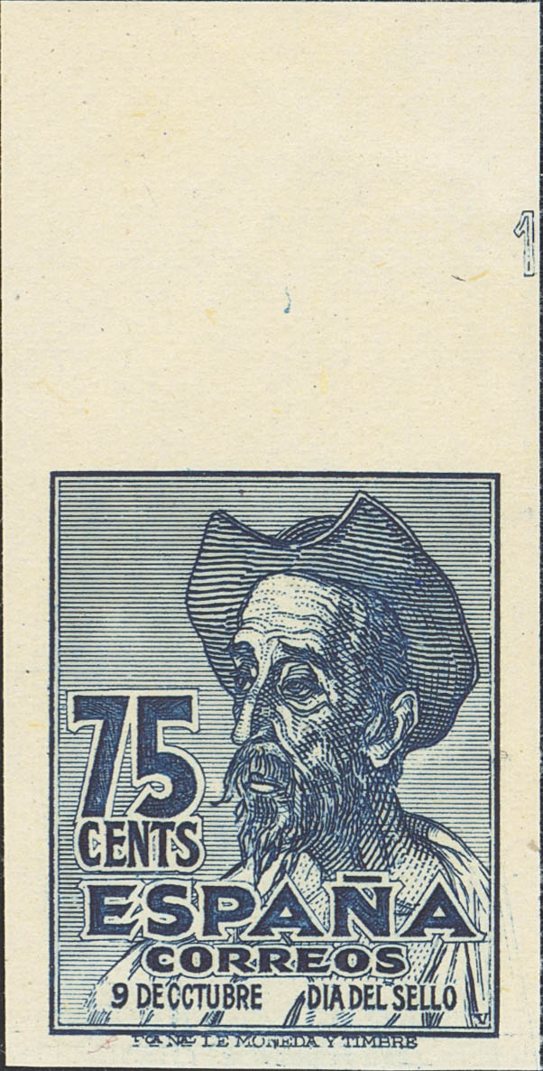 ★★ 1013s. 1947. 75 cts azul, borde de hoja con leyenda. SIN DENTAR. MAGNIFICO Y ESPECTACULAR. Edifil 2025: +90 Euros