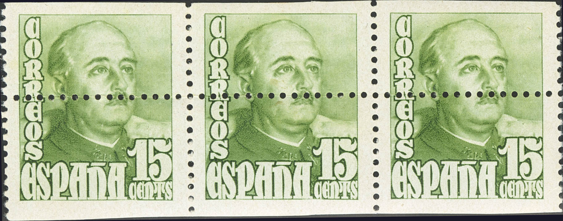 ★★ 1021dh(3). 1948. 15 cts verde, tira de tres. DENTADO HORIZONTAL DESPLAZADO. MAGNIFICA Y RARA.