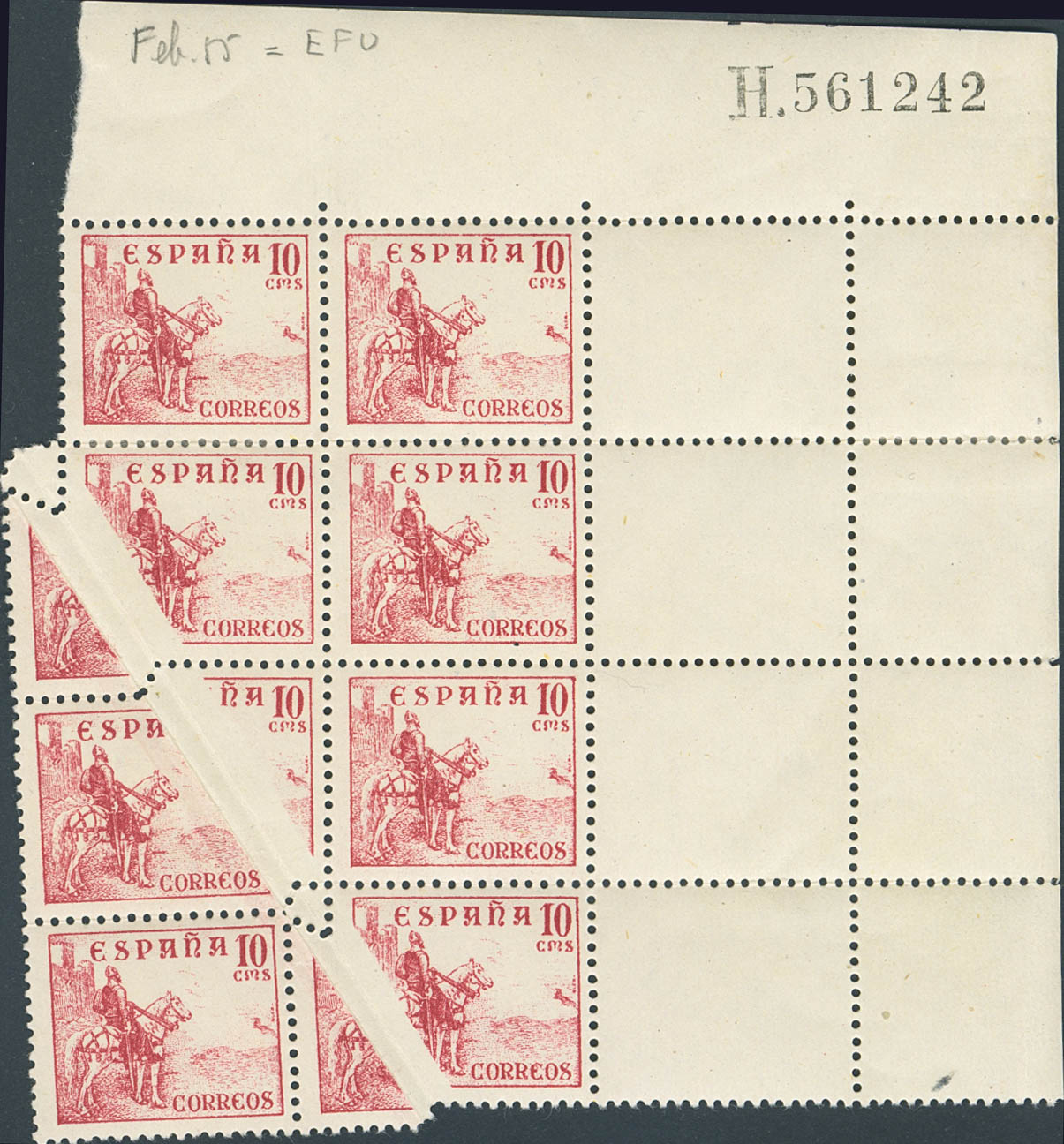 ★★/★ 1045(8). 1949. 10 cts carmín, bloque de ocho. Cuatro sellos variedad FUELLE DIAGONAL DE PAPEL. MAGNIFICO Y RARO.