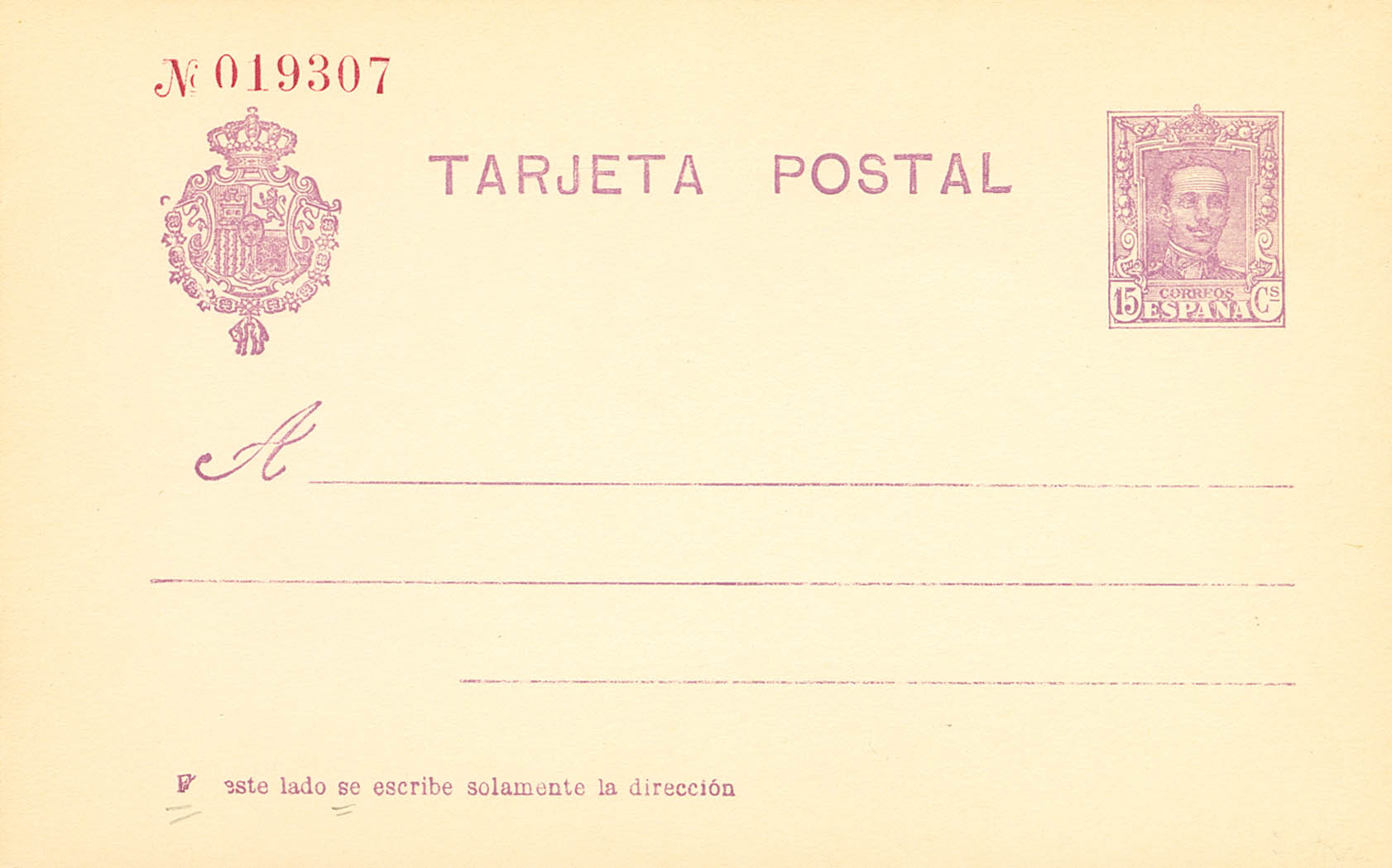 (★) EP57NR. 1925. 15 cts lila sobre Tarjeta Entero Postal. NUMERACION EN ROJO. MAGNIFICA Y RARA. Edifil 2017: 385 Euros
