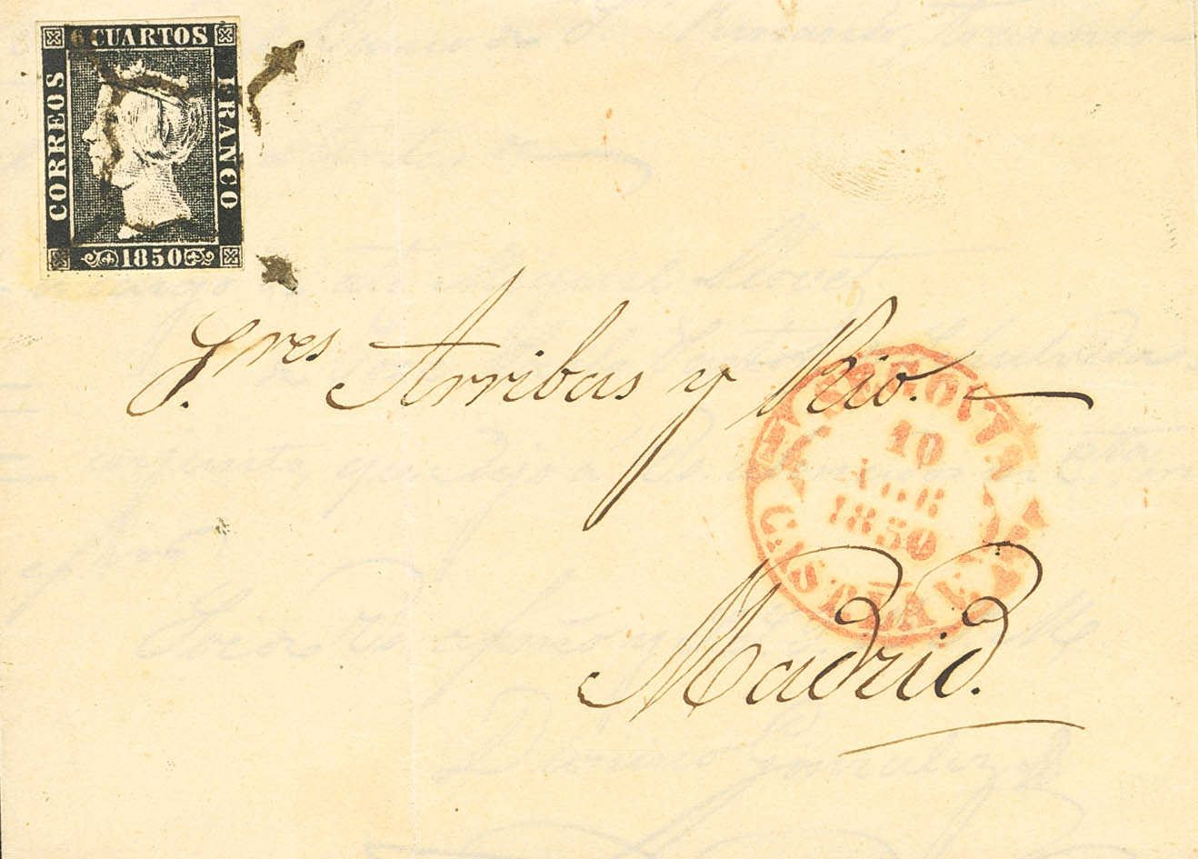 1. 1850. 6 cuartos negro. SEGOVIA a MADRID. En el frente baeza SEGOVIA / CAST.LA.V. MAGNIFICA.