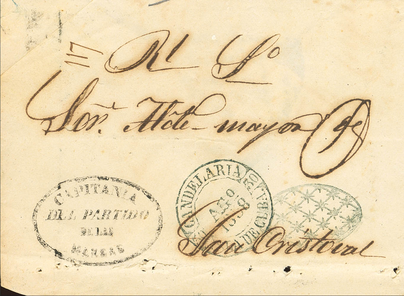 1858. MANGAS a SAN CRISTOBAL. Marca CAPITANIA / DEL PARTIDO / DE LAS / MANGAS, baeza CANDELARIA / ISLA DE CUBA, en azul y PARRILLA COLONIAL, para indicar que la carta circulaba franca. MAGNIFICA Y MUY RARA.