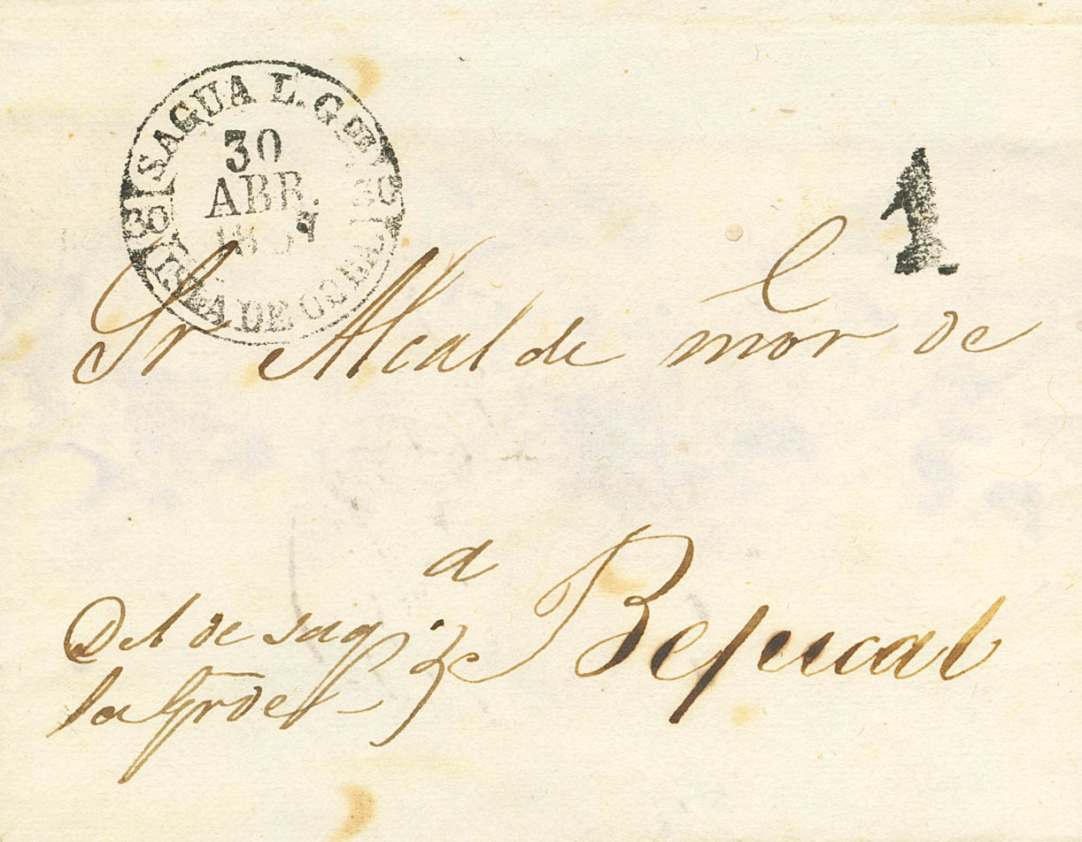 1857. SAGUA LA GRANDE a BEJUCAL. Baeza SAGUA L.GDE, en negro. MAGNIFICA Y MUY RARA.