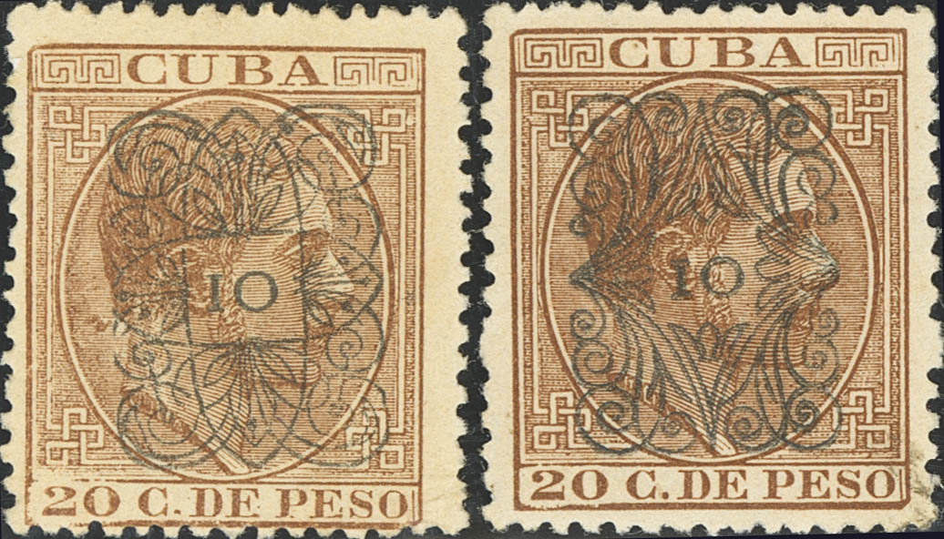 (★) 76hie, 82hie. 1883. 10 cts sobre 20 cts castaño rojo y 10 cts sobre 20 cts castaño rojo. CIFRA "10" EN LUGAR DE "20". MAGNIFICOS Y RAROS. Edifil 2019: 410 Euros