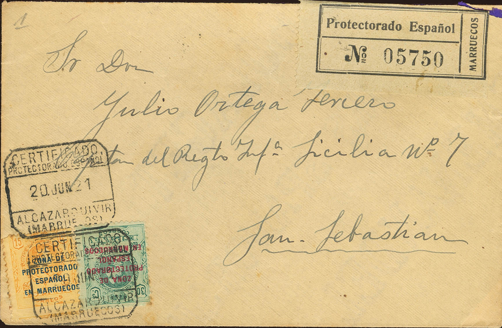 61, 63. 1921. 15 cts amarillo y 30 cts verde. Certificado de ALCAZARQUIVIR a SAN SEBASTIAN. MAGNIFICA.