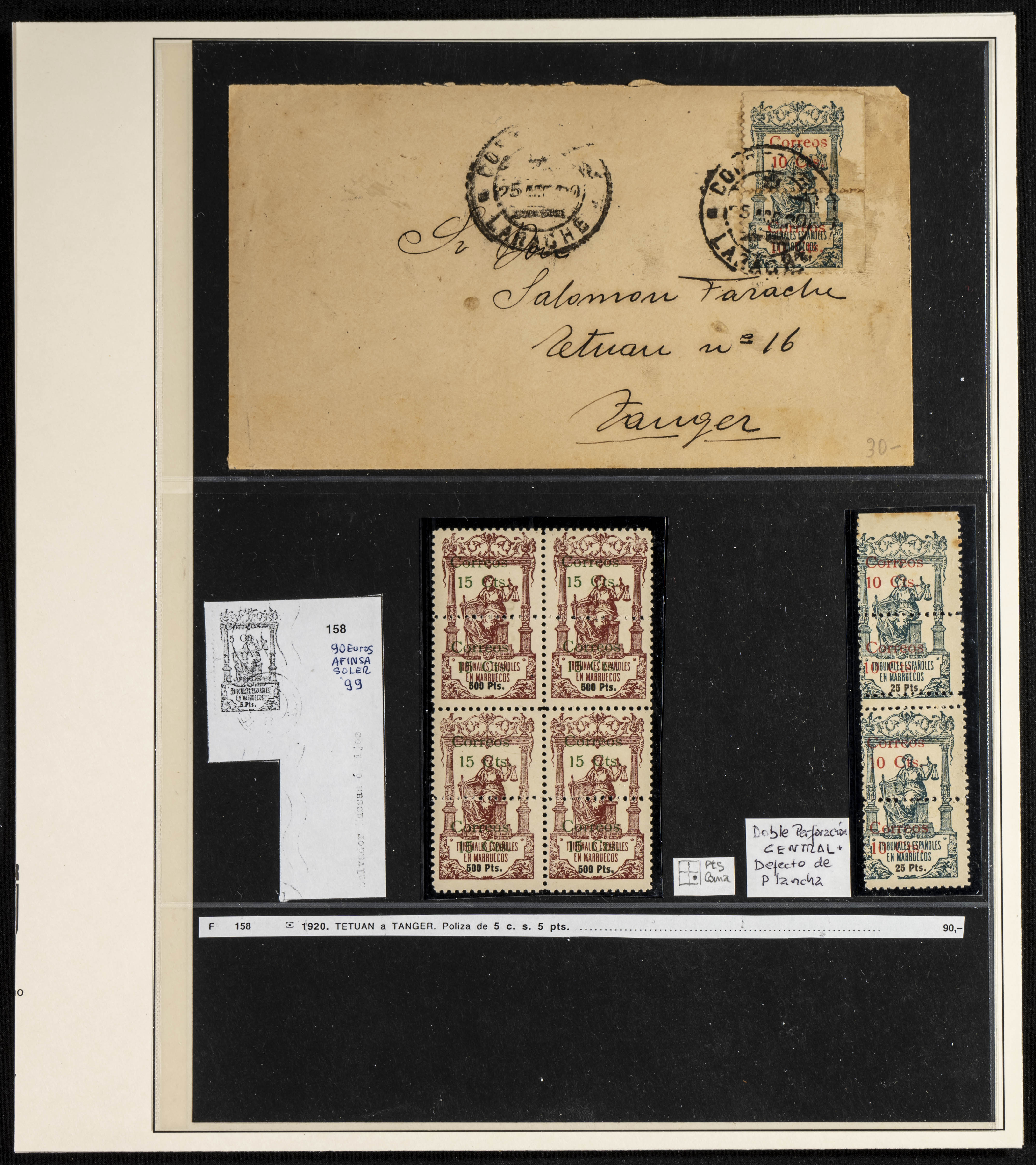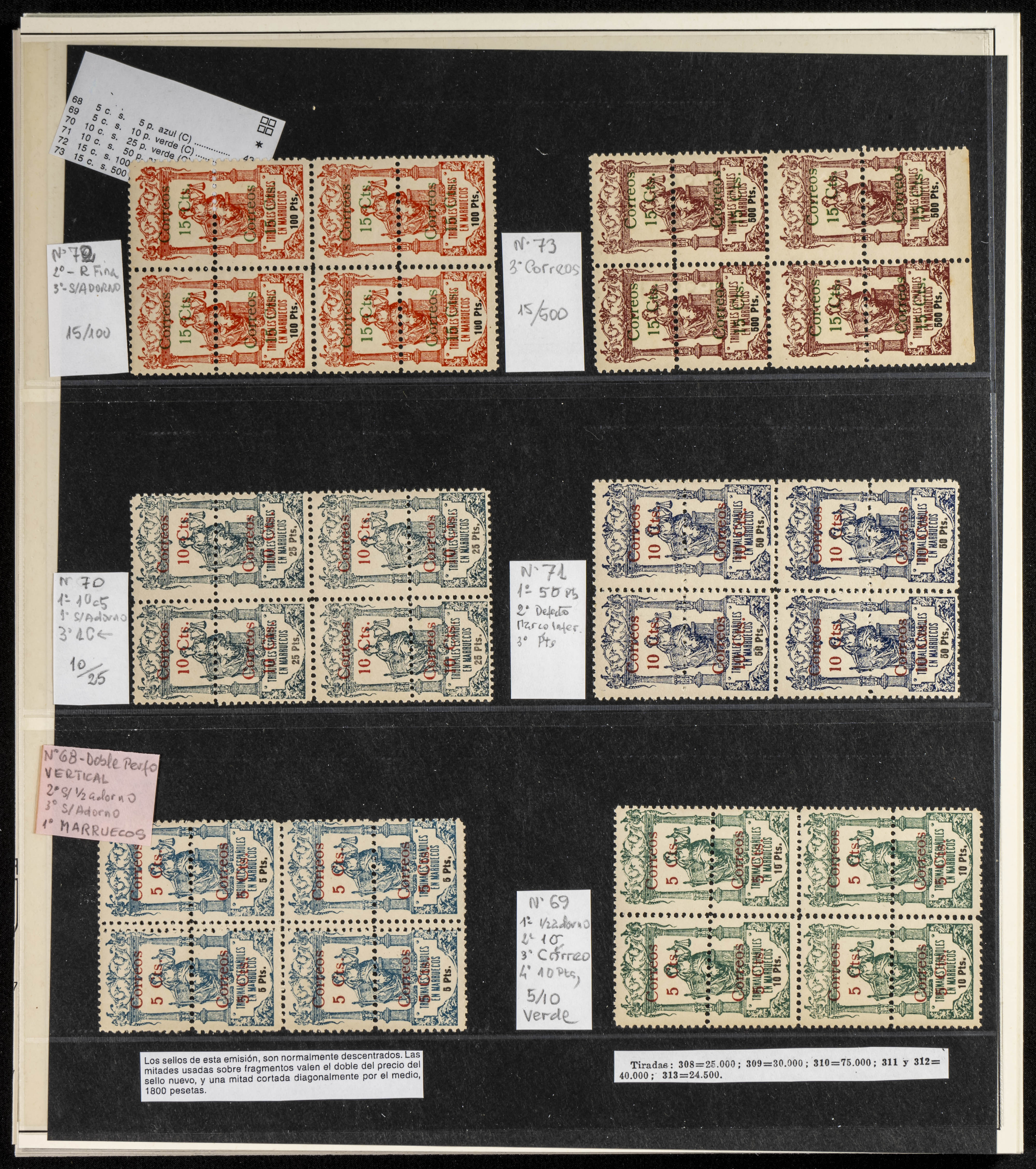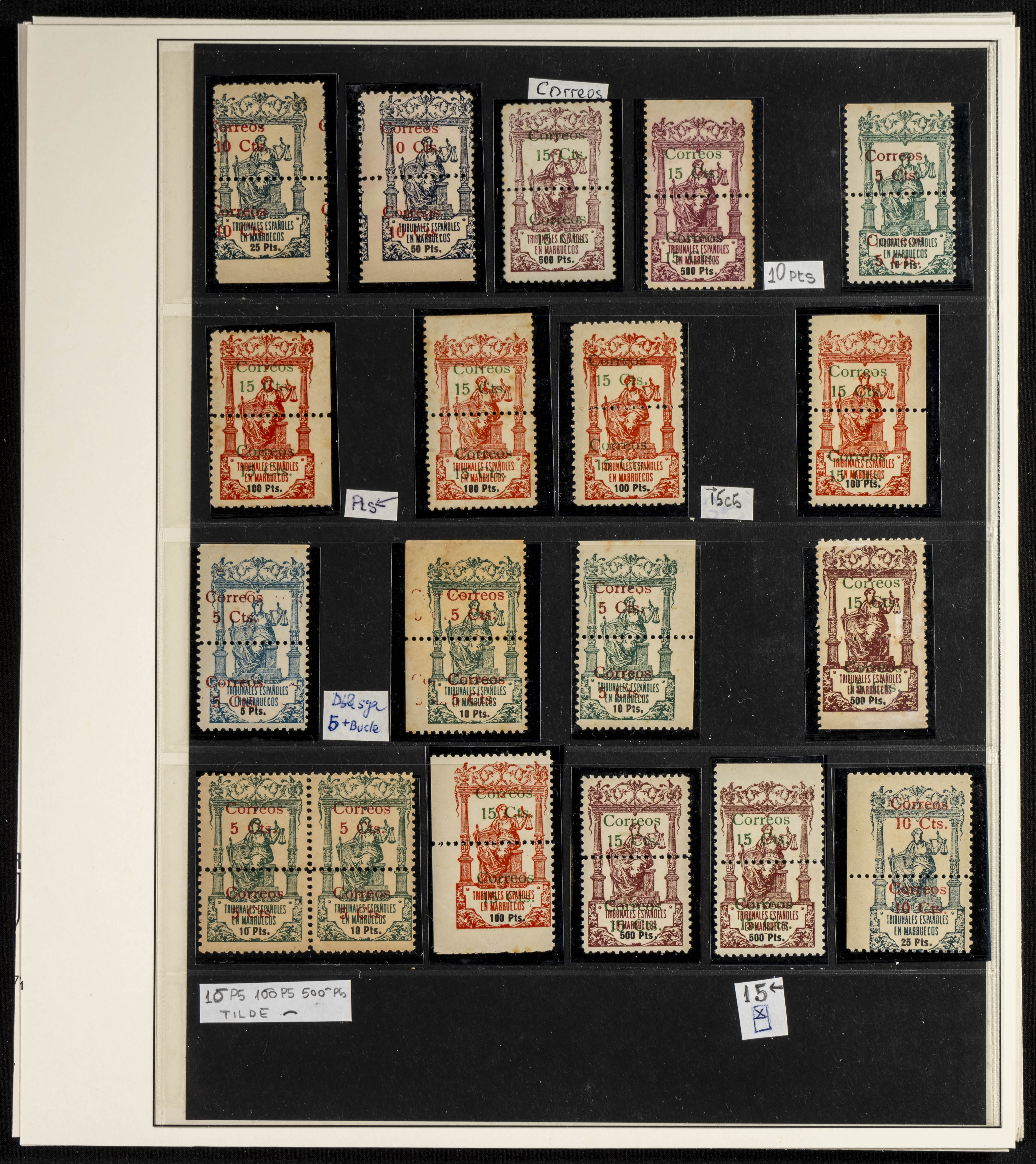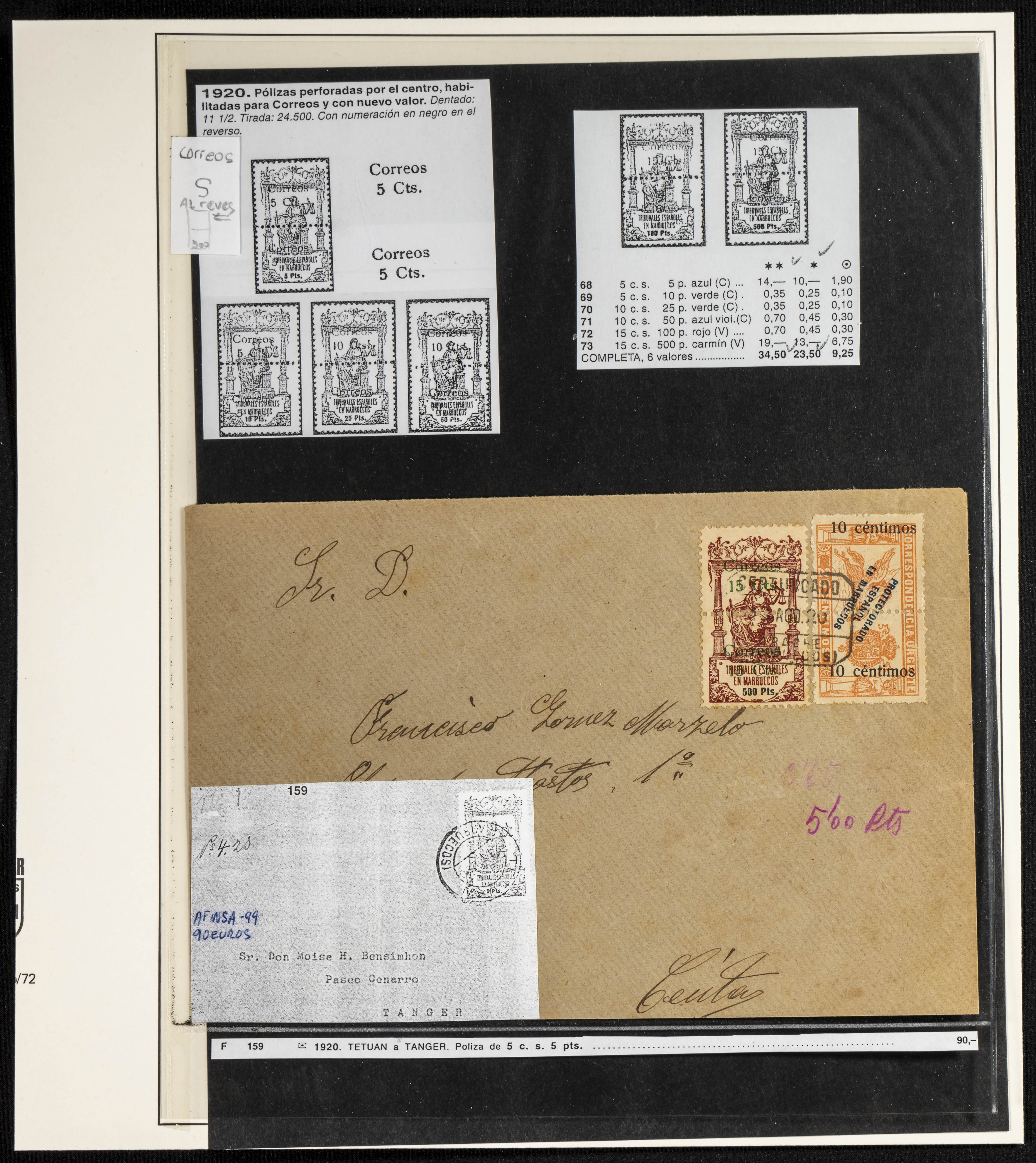 (★)/1920. Interesantísimo conjunto de la emisión de Pólizas habilitadas para correo de 1920 incluyendo bloques, variedades de sobrecarga, de perforación y alguna carta, además de los cambios de color de sobrecarga y dos parejas sin dentado vertical del 5 cts sobre 10 pts verde. MAGNIFICO Y RARO CONJUNTO.