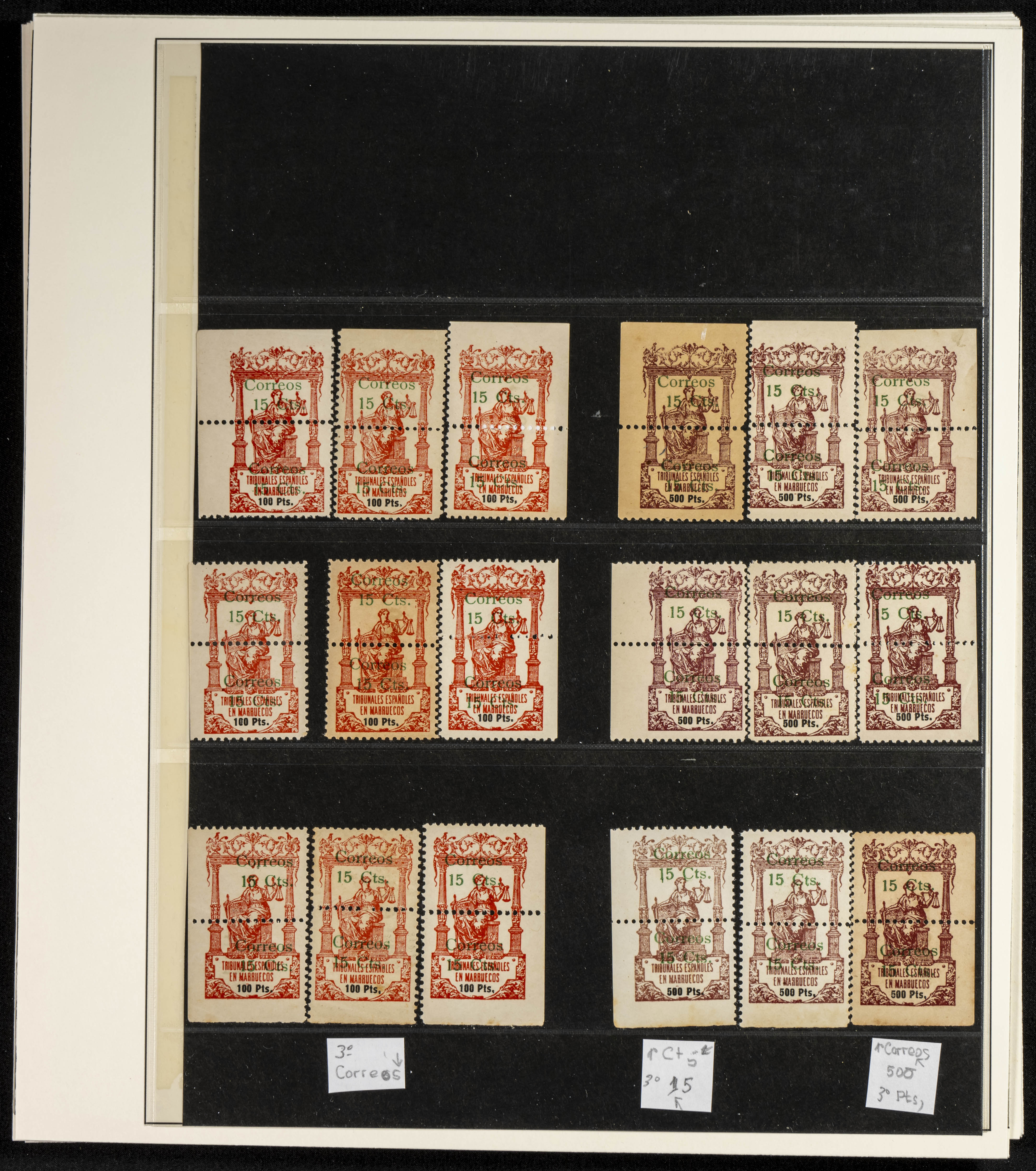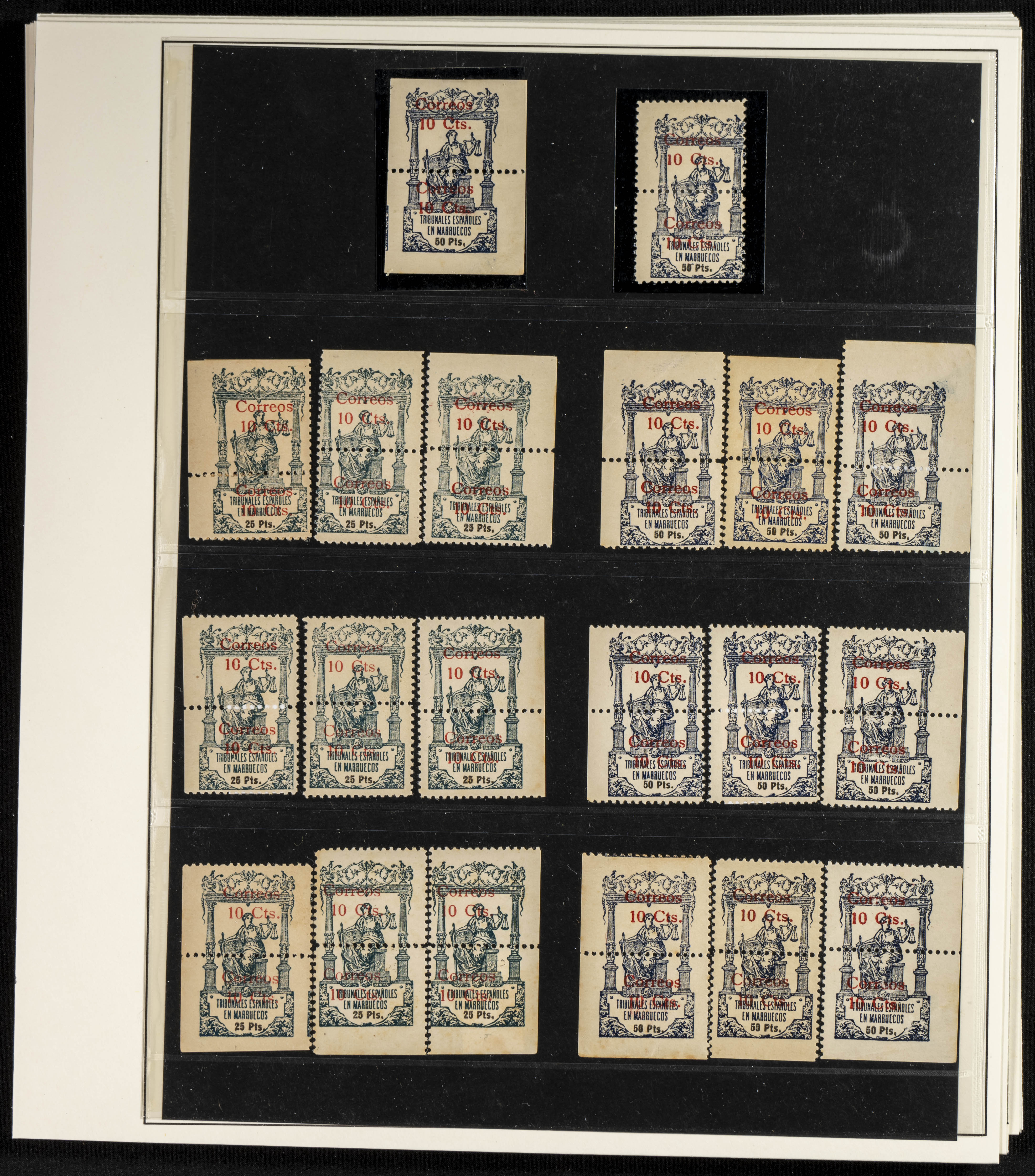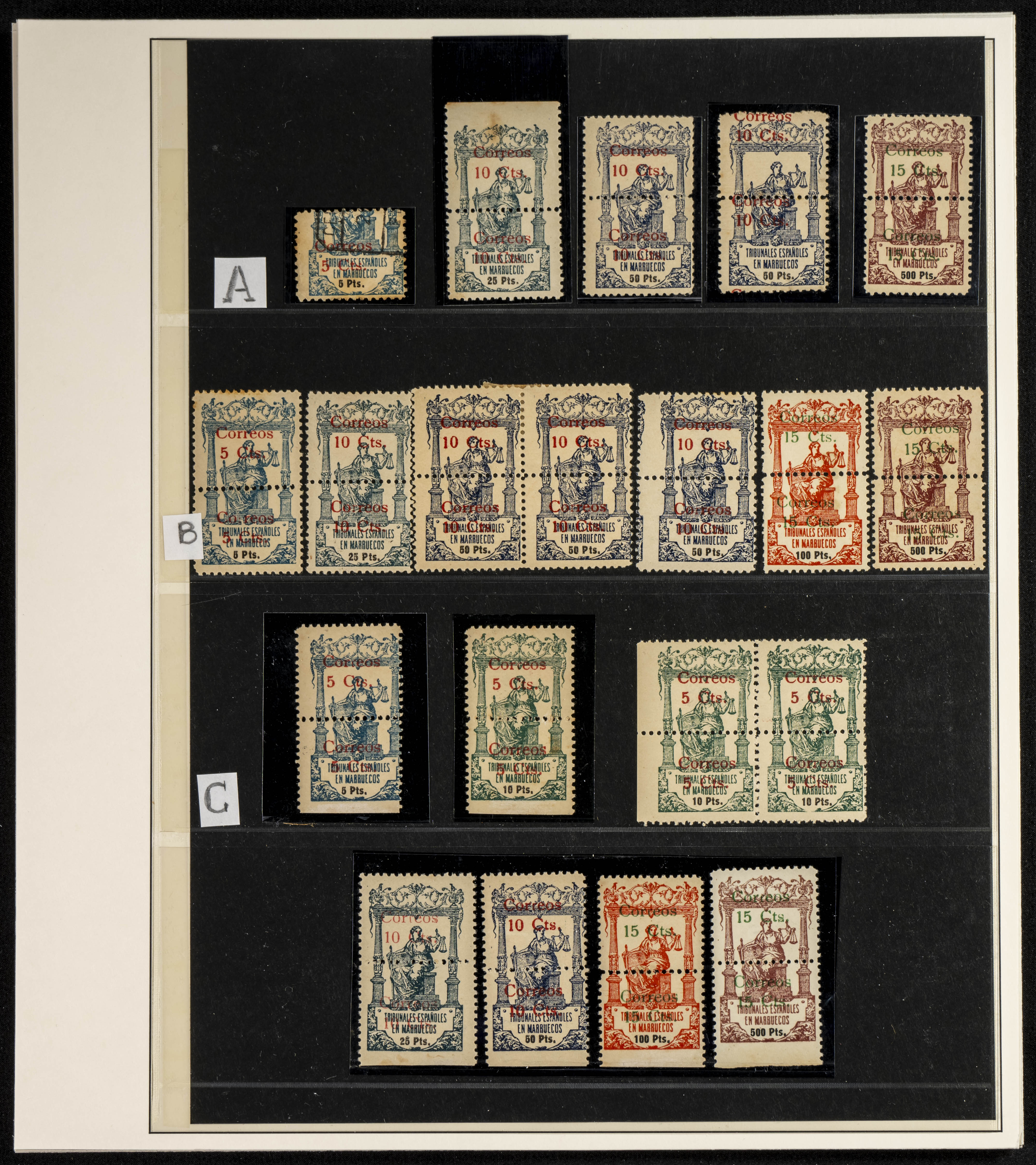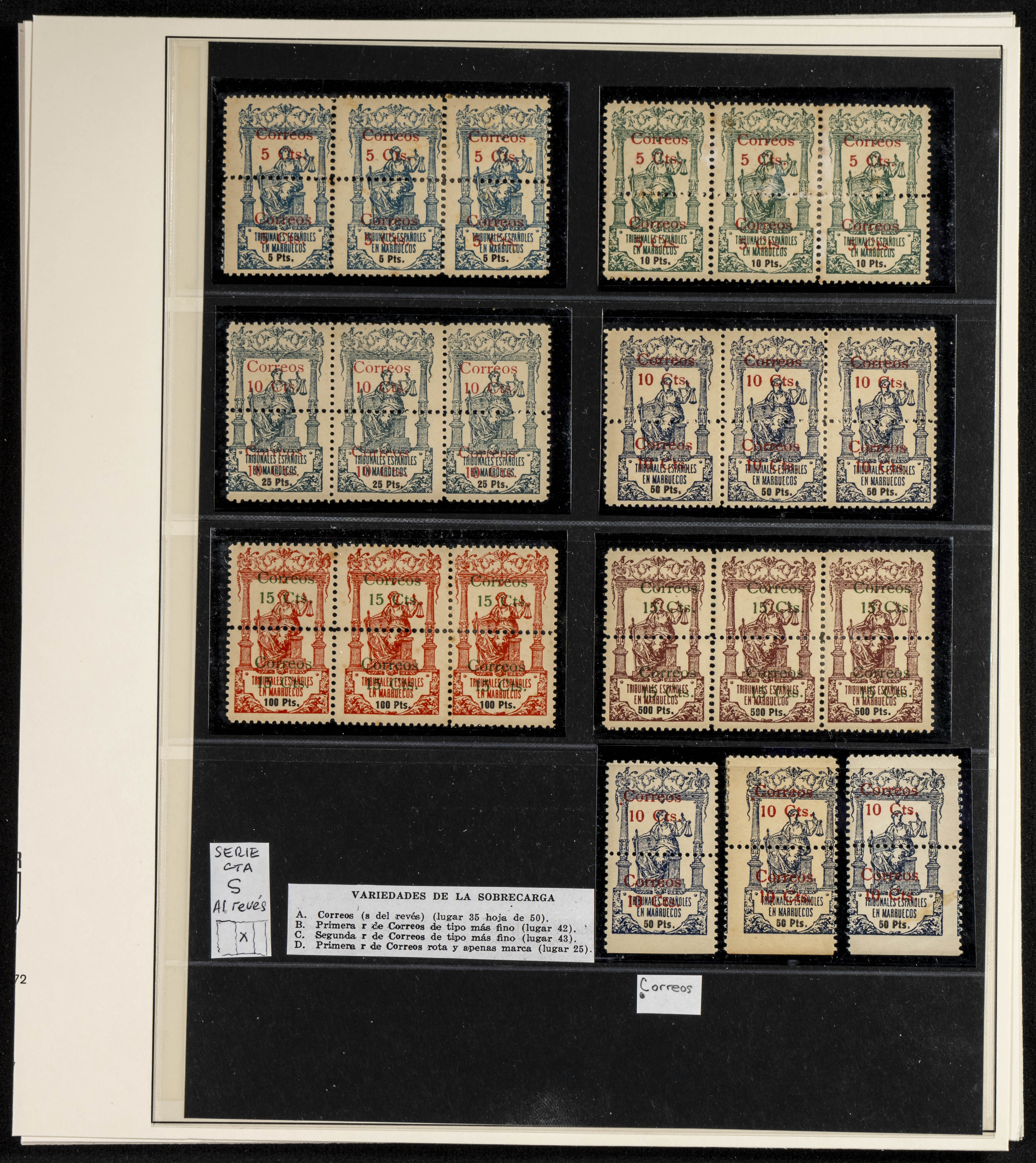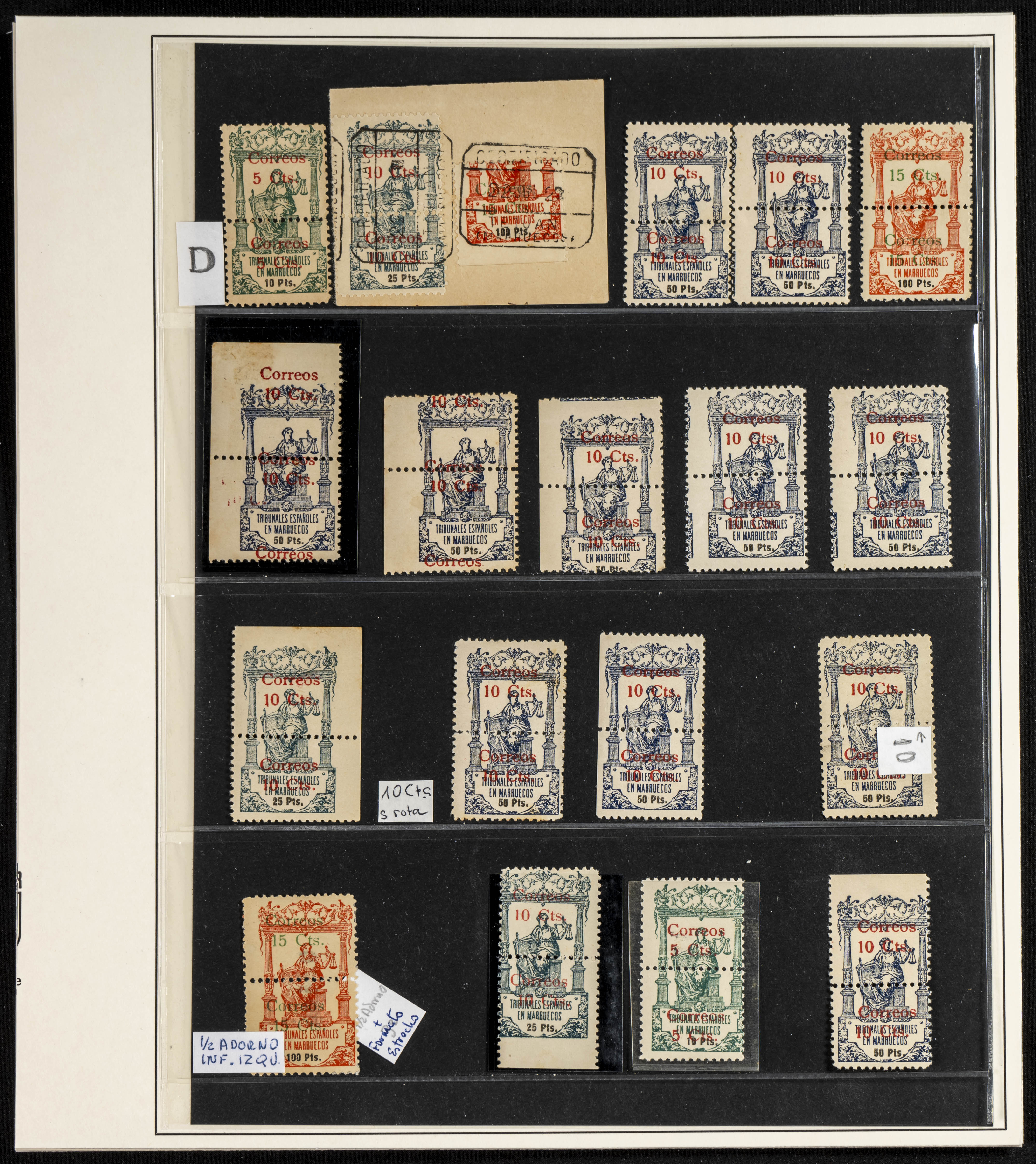 (★)/1920. Interesantísimo conjunto de la emisión de Pólizas habilitadas para correo de 1920 incluyendo bloques, variedades de sobrecarga, de perforación y alguna carta, además de los cambios de color de sobrecarga y dos parejas sin dentado vertical del 5 cts sobre 10 pts verde. MAGNIFICO Y RARO CONJUNTO.
