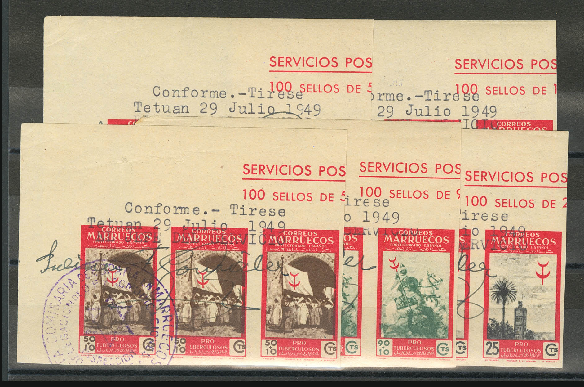 ★★ 307/11s(3). 1949. Serie completa, tira de tres, esquina de pliego. SIN DENTAR e inscripción, firma y marca de aprobación. MAGNIFICA Y RARA.