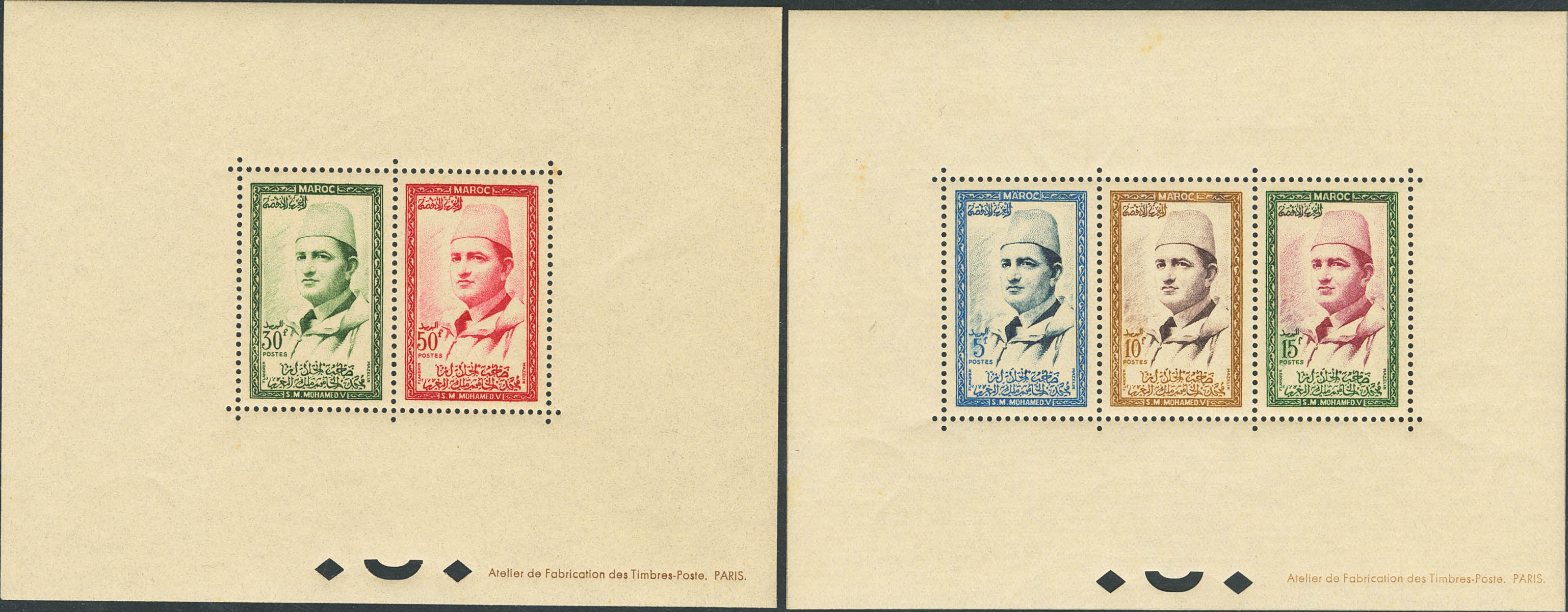 ★★Yvert Yv. 362/64, 366/67. 1956. 5 f, 10 f, 15 f, 30 f y 50 f Zona Francesa. Dos hojitas bloque especiales (conservación habitual). BONITAS Y RARISIMAS, SOLO FUERON EMITIDAS VEINTE JUEGOS.