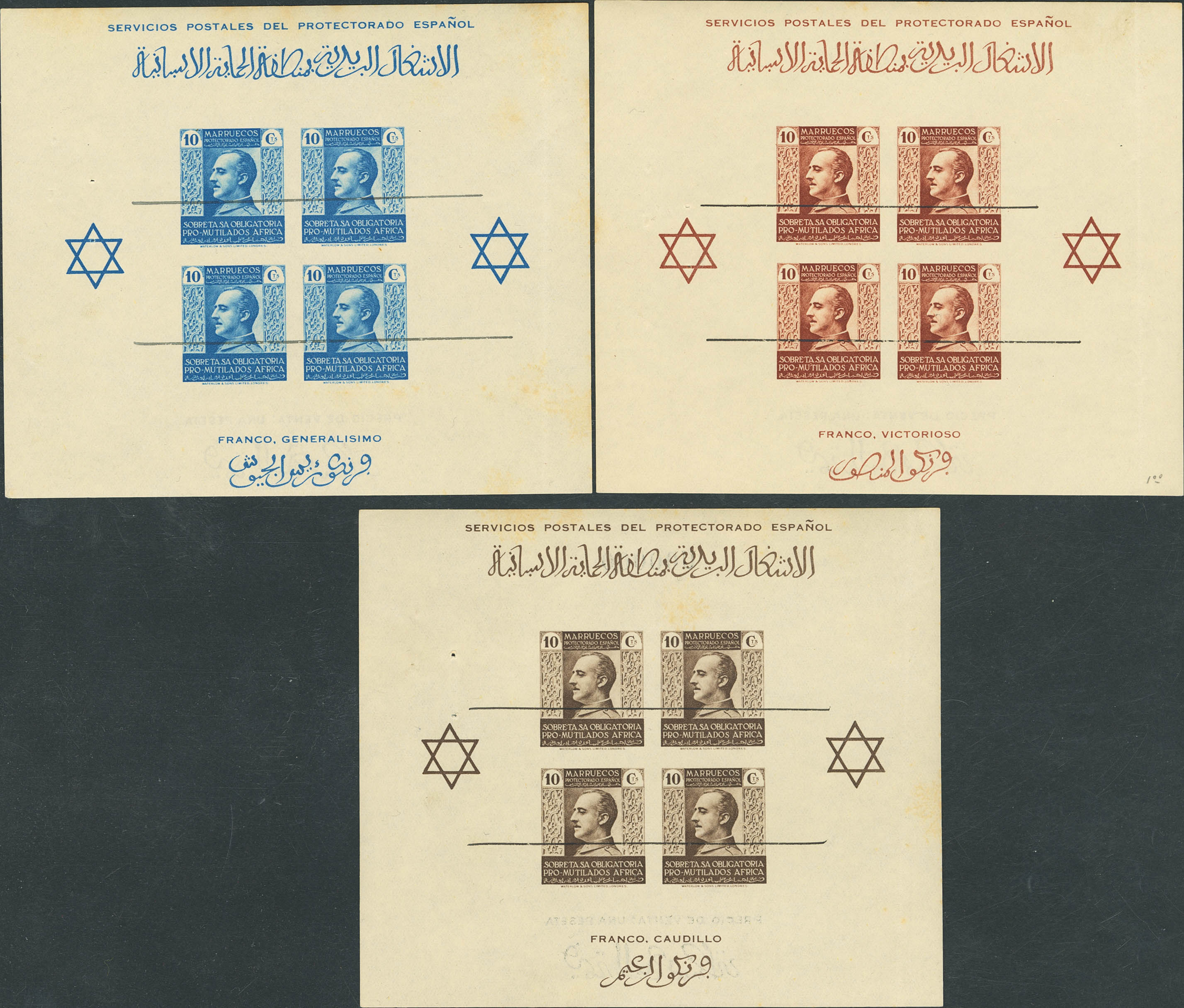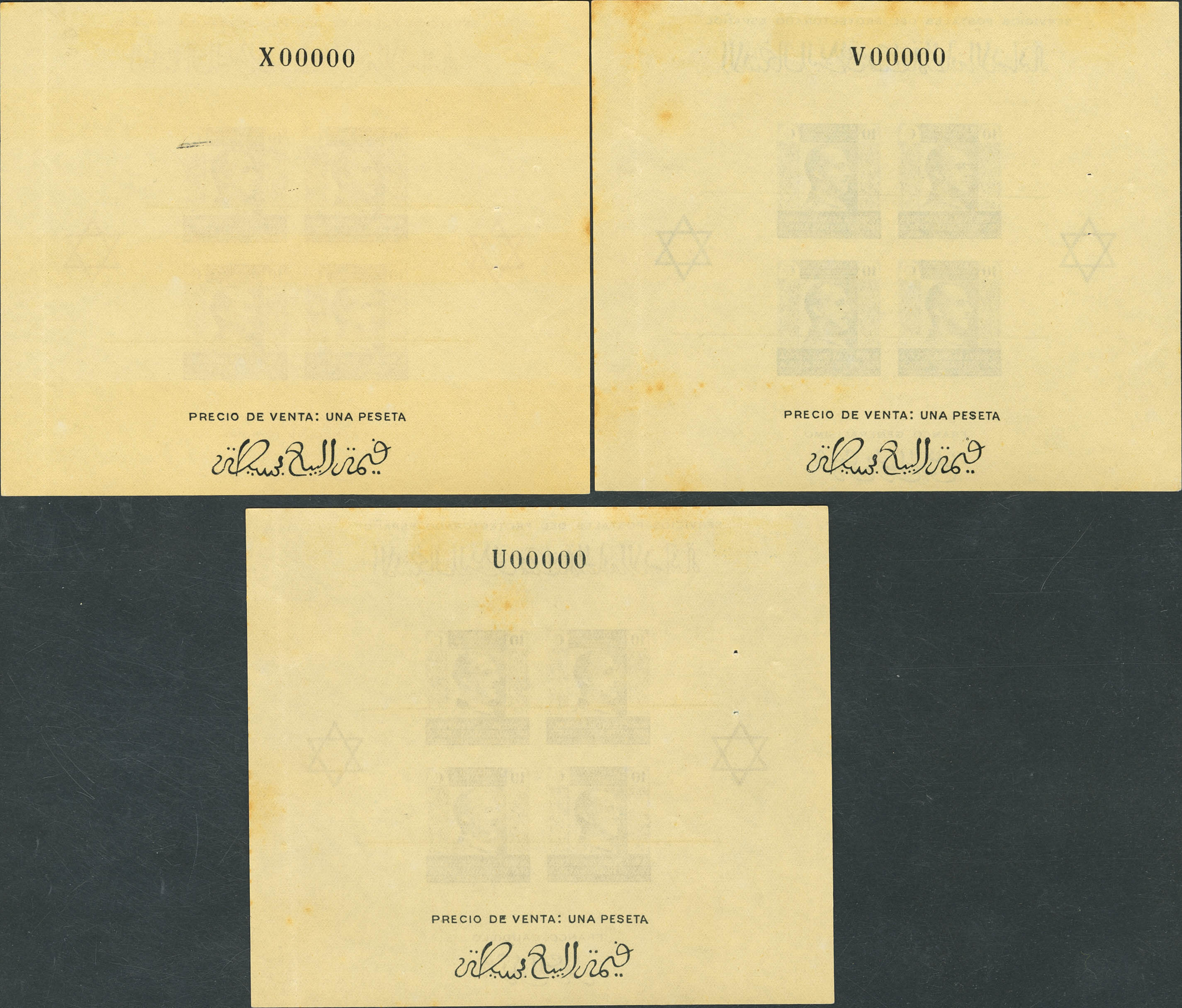 ★ 4/6N. 1938. Hojas bloque (conservación habitual). RAYA DE MUESTRA (al dorso numeraciones U00000, V00000 y X00000). BONITAS Y RARISIMAS.