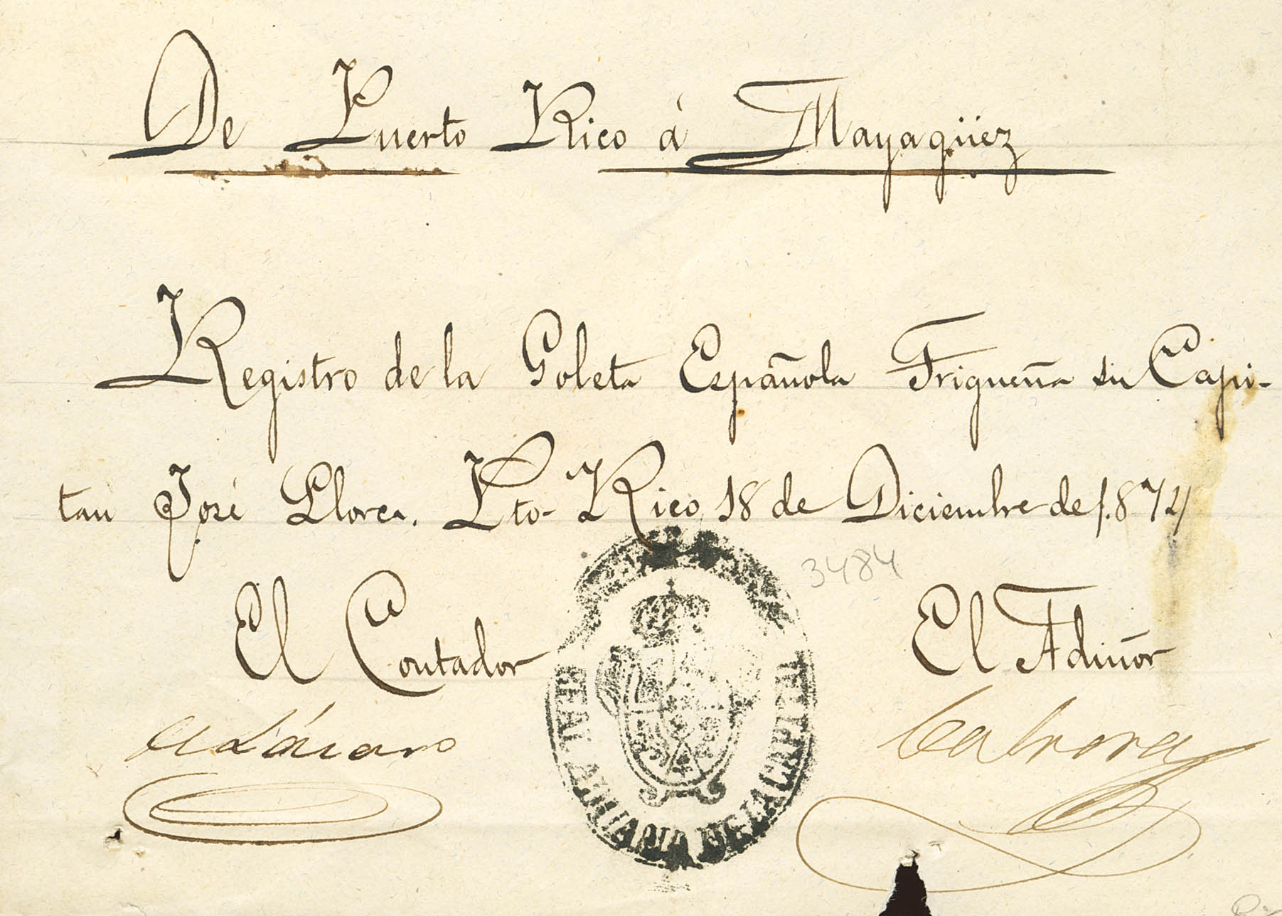 1874. Registro de Embarque de la Goleta "Frigueña" de PUERTO RICO a MAYAGÜEZ. Marca REAL ADUANA DE LA CAPITAL. MAGNIFICO Y RARO.