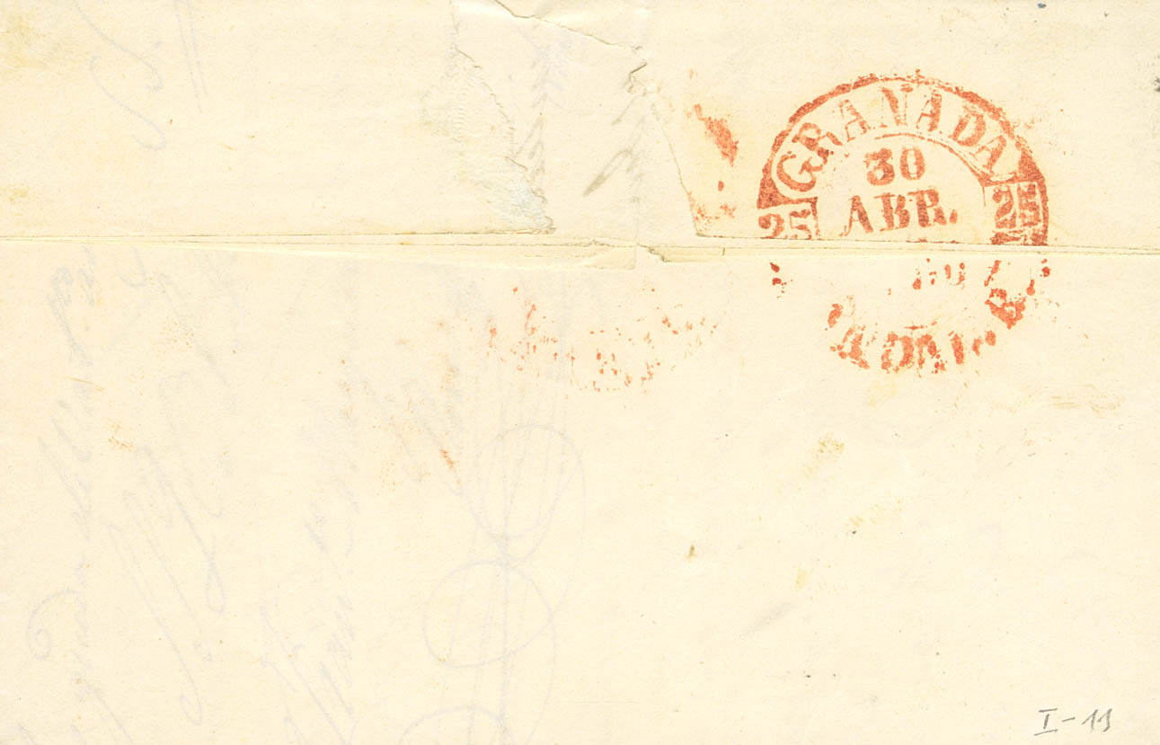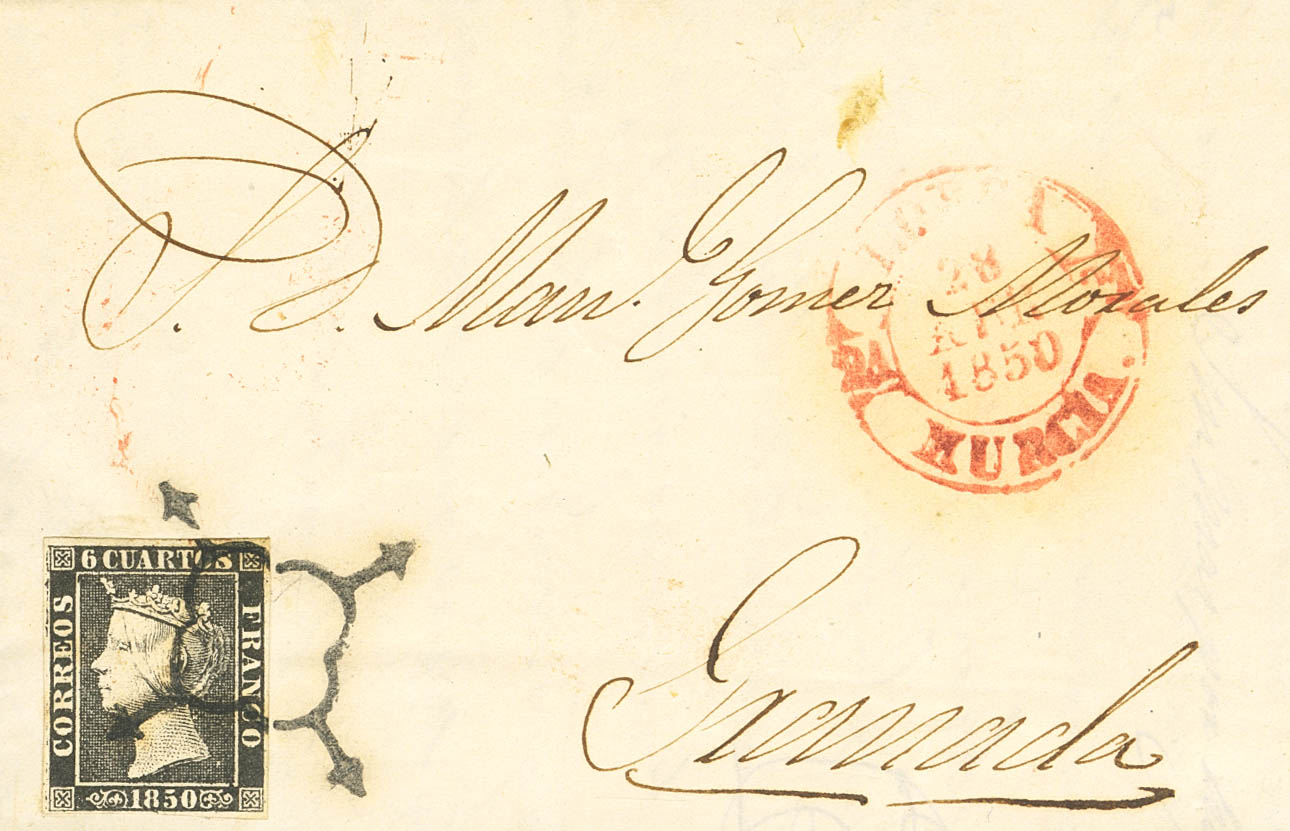 1. 1850. 6 cuartos negro. CUEVAS DE REYLLO (MURCIA) a GRANADA. En el frente baeza LORCA / MURCIA. MAGNIFICA.