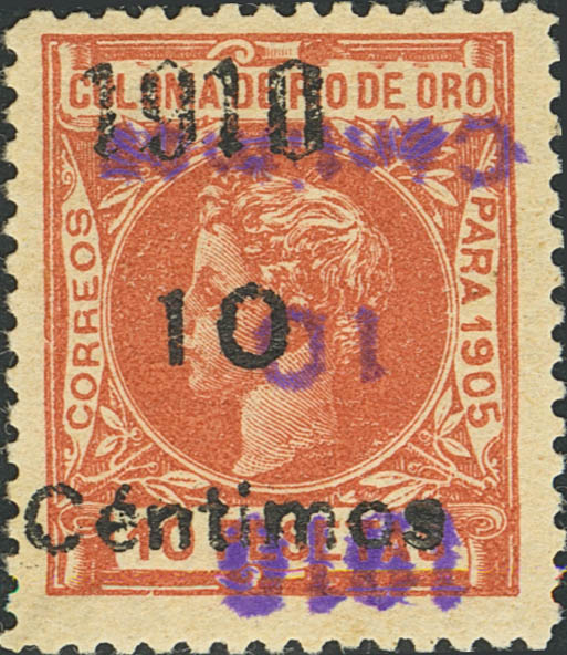 ★ 56hhia. 1910. 10 cts sobre 10 pts rojo. SOBRECARGA DOBLE, UNA INVERTIDA, en negro y violeta. MAGNIFICO Y RARO. Cert. GRAUS. Edifil 2018: 195 Euros