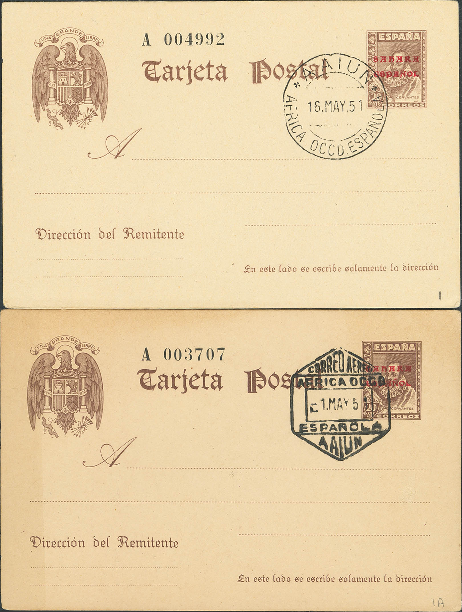 EP1, EP1A. 1941. 20 cts sobre Tarjeta Entero Postal crema y 20 cts sobre Tarjeta Entero Postal anteada, ambas con matasellos AAIUN / AFRICA OCCID ESPAÑOLA y AFRICA OCCD. / ESPAÑOLA / AAIUN, ambos de favor. MAGNIFICAS. Edifil 2018: 330 Euros