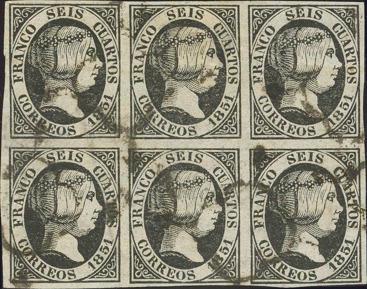 6(6). 1851. 6 cuartos negro, bloque de seis. MAGNIFICO.