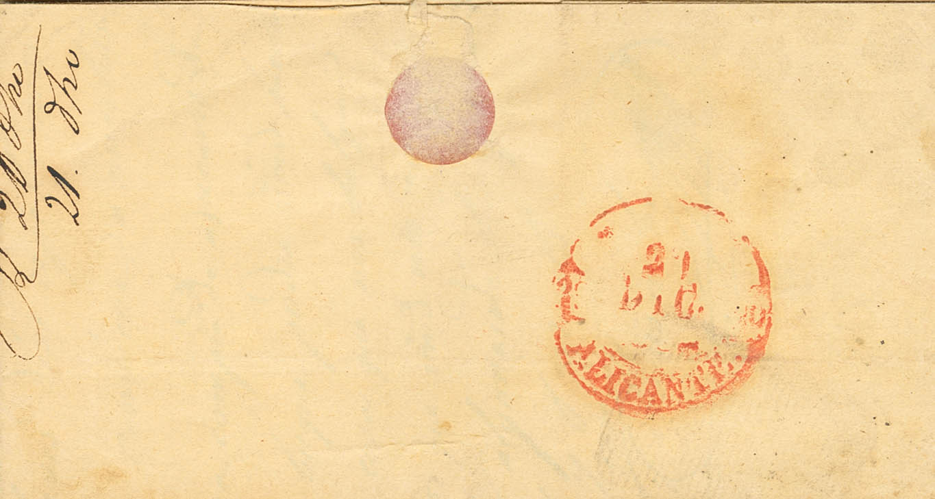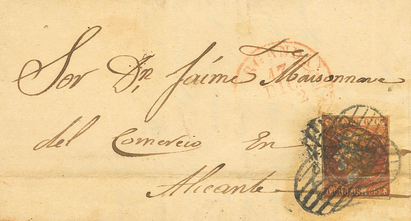 12. 1852. 6 cuartos rosa (doblez de archivo). ARGANDA DEL REY a ALICANTE. Matasello PARRILLA, estampada seis veces creando una composición muy característica. MAGNIFICA E INUSUAL.