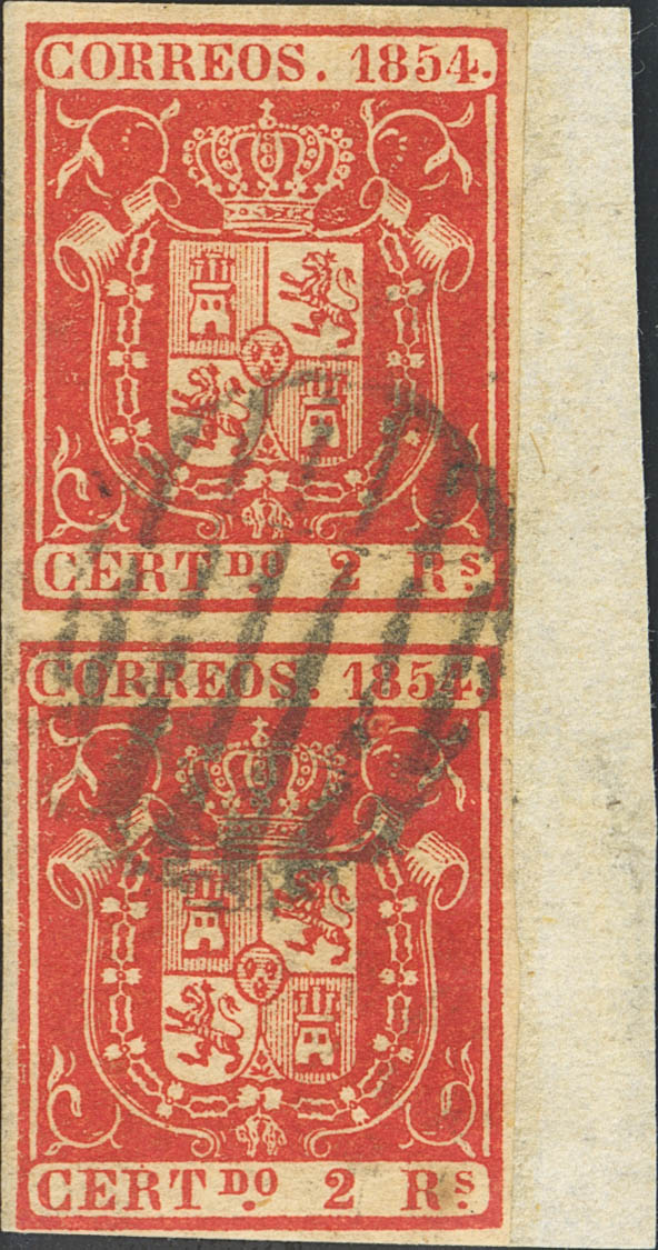 △ 25(2). 1854. 2 reales rojo, en pareja, sobre fragmento. MAGNIFICA. Edifil 2020: 260 Euros