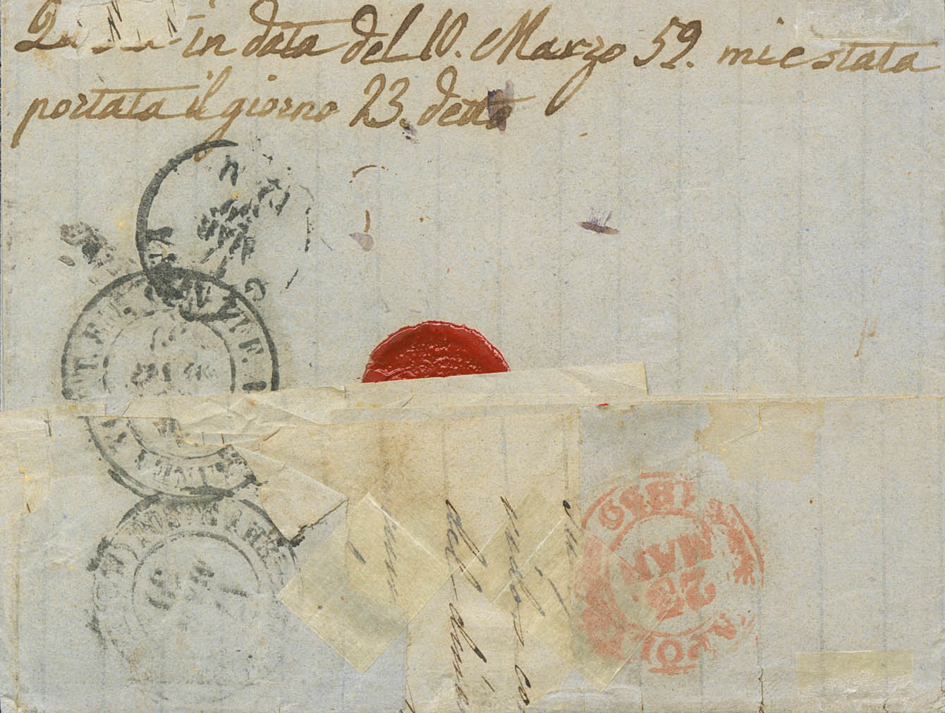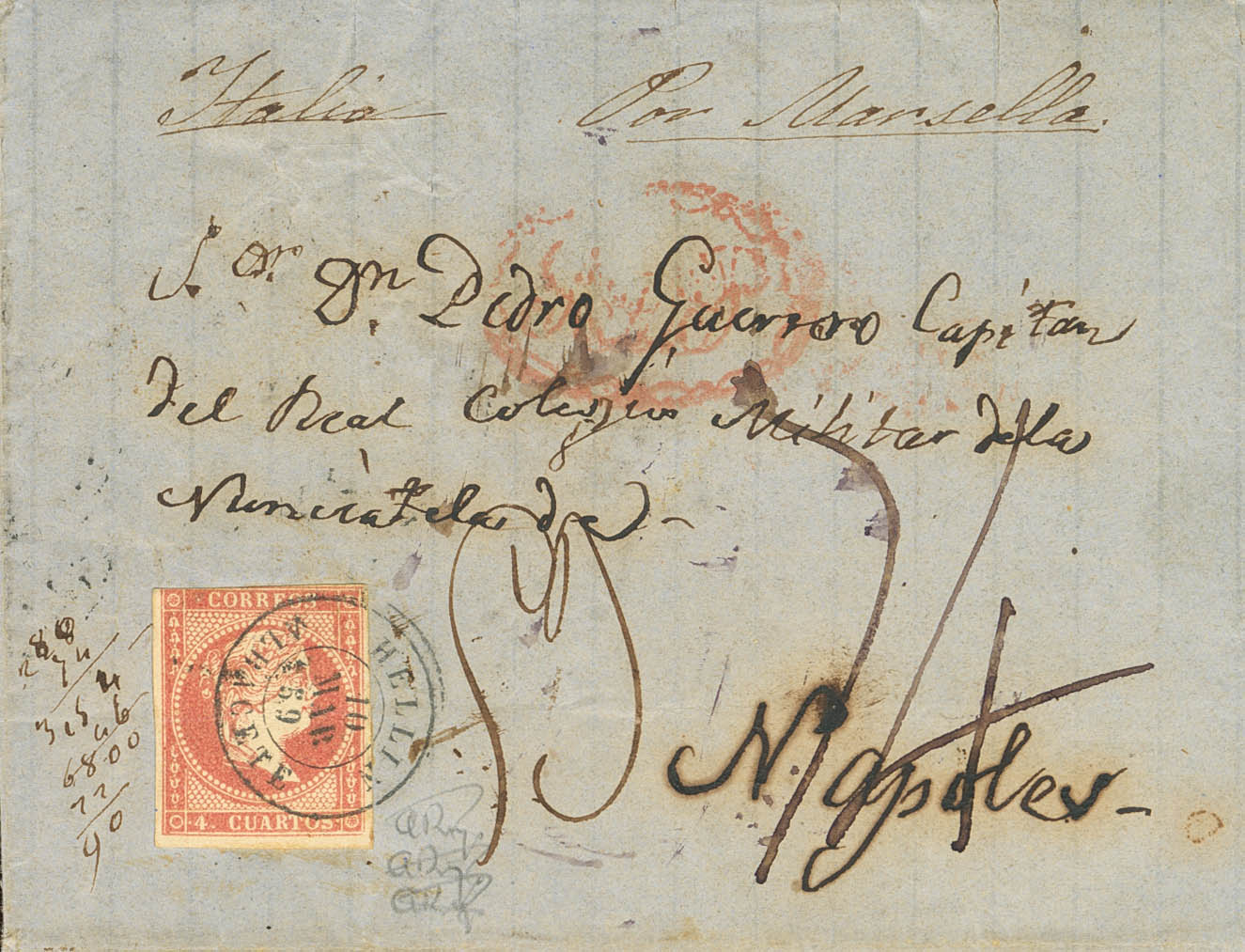 48. 1859. 4 cuartos rojo. HELLIN a NAPOLES (REINO DE NAPOLES). Matasello HELLIN / ALBACETE, marca de tránsito en el frente y diversos porteos. Según el Convenio Postal con Estados de Italia, a partir de Mayo de 1855 no era necesario el franqueo previo en las cartas (hasta entonces era de 4 cuartos únicamente hasta la frontera). MAGNIFICA Y RARA.
