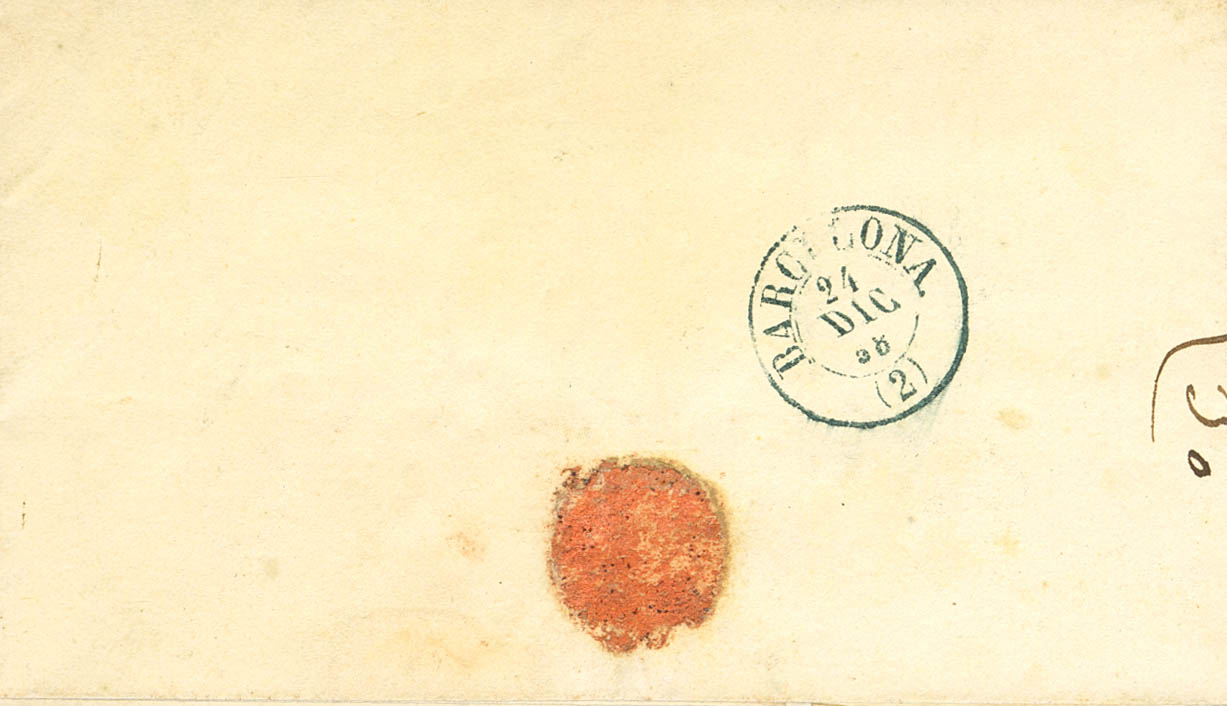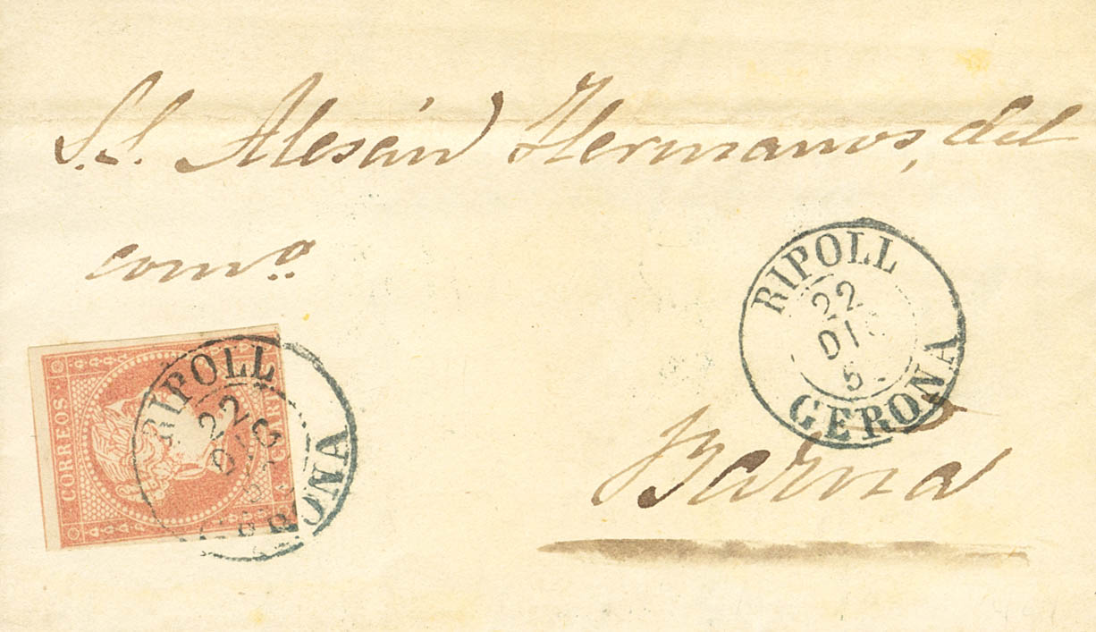 48. 1858. 4 cuartos rojo. RIPOLL (GERONA) a BARCELONA. Matasello RIPOLL / GERONA (Tipo I). MAGNIFICA Y ESPECTACULAR.