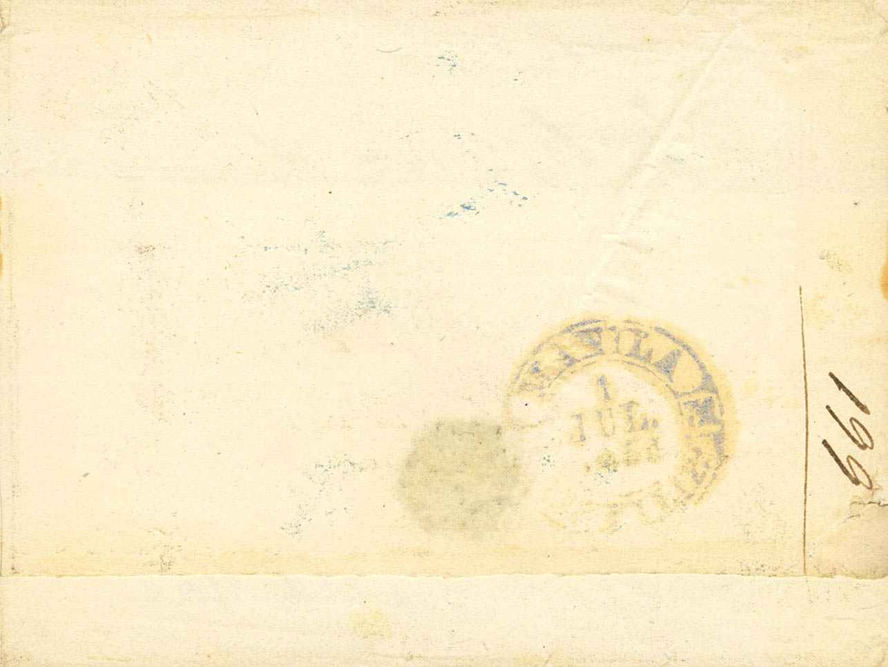 1856. OLIVENZA a MANILA (FILIPINAS). Marca de franquicia JUZGADO DE PRIMERA INST. DE OLIVENZA y fechador OLIVENZA / BADAJOZ, ambos en azul y porteo estampado "2" aplicado en destino y manuscrito "2 Rs". MAGNIFICA Y RARISIMO ORIGEN-DESTINO.