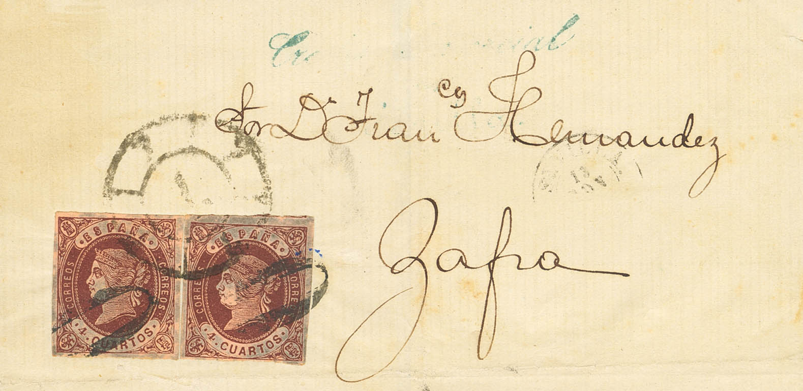58(2). 1862. 4 cuartos castaño, dos sellos. SEVILLA a ZAFRA. Matasello mixto R.CARRETA Nº7 y numeral "O", estampado a la llegada a Zafra. MAGNIFICA Y MUY RARA, ESPECIALMENTE TRATANDOSE DE UN FRANQUEO DE DOBLE PORTE. Cert. GRAUS.