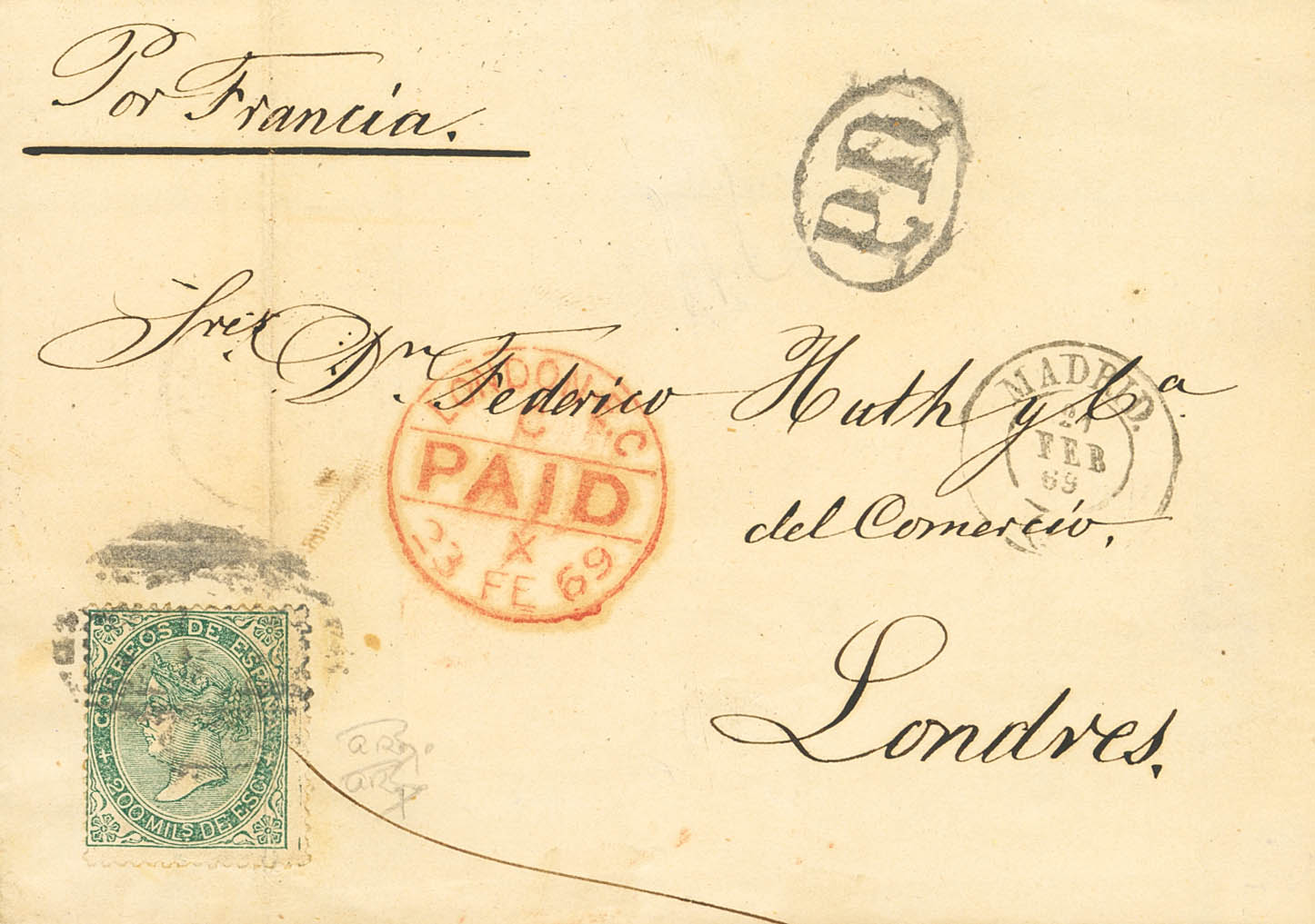 100. 1868. 200 mils verde (doblez de archivo). MADRID a LONDRES (GRAN BRETAÑA). BONITA.