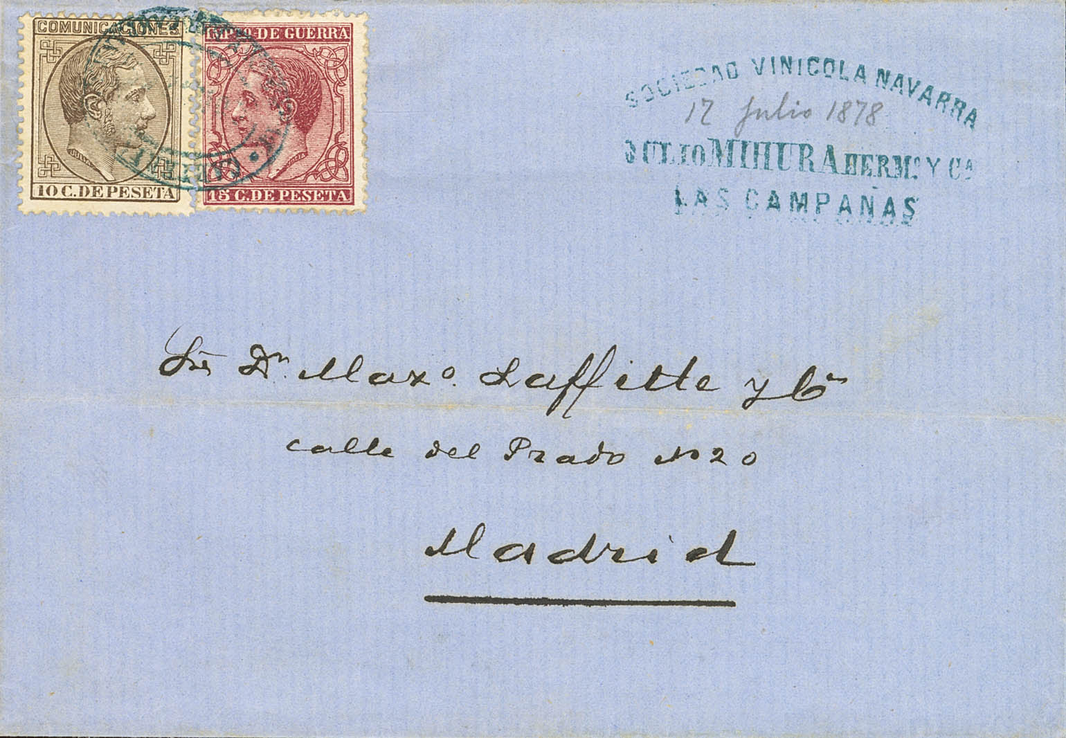 192, 188. 1878. 10 cts castaño y 15 cts carmín. LAS CAMPANAS (NAVARRA) a MADRID. Matasello CARTERIA DE / CORREOS / BIURRUN Y LAS CAMPANAS, en azul. MAGNIFICA Y RARA.