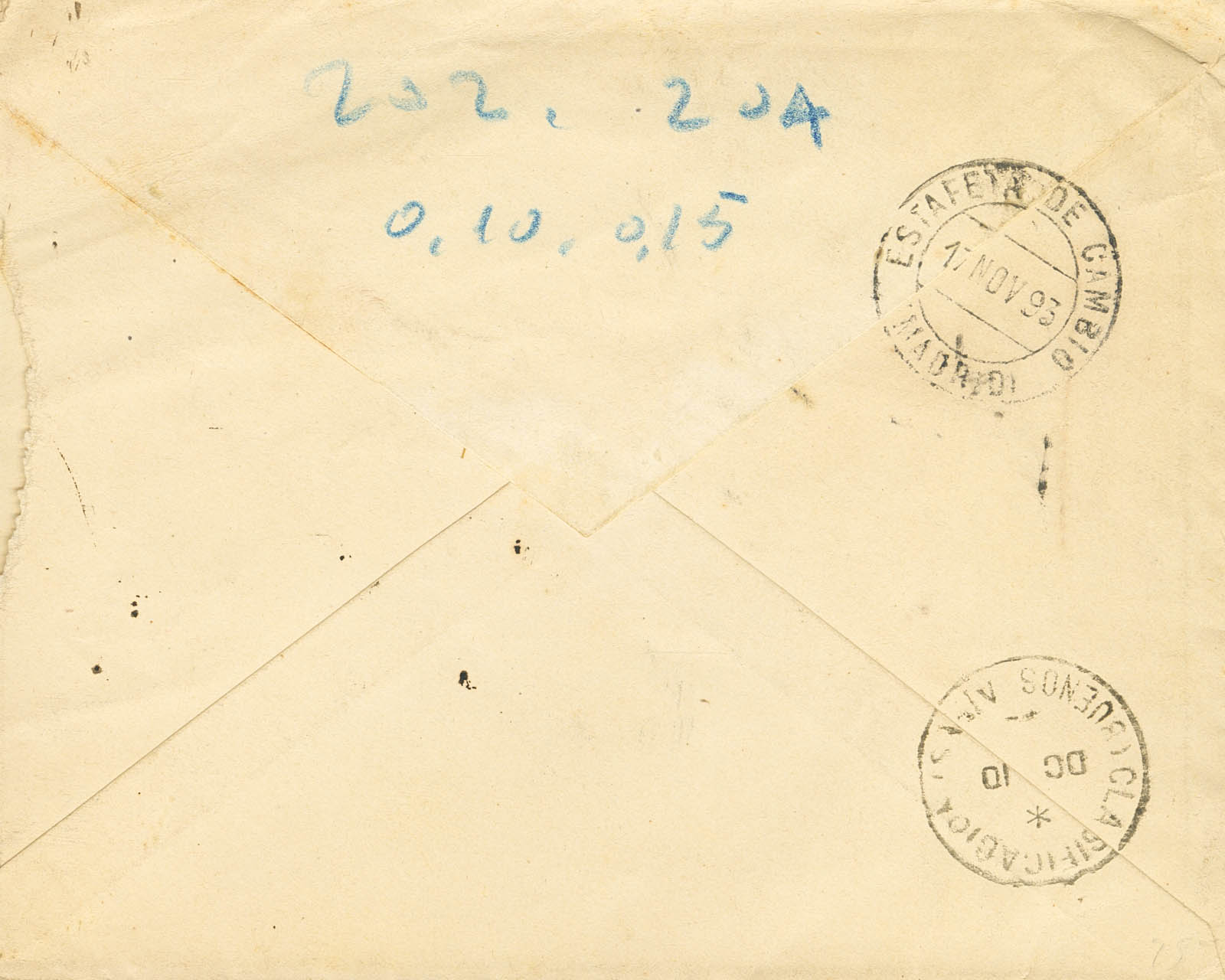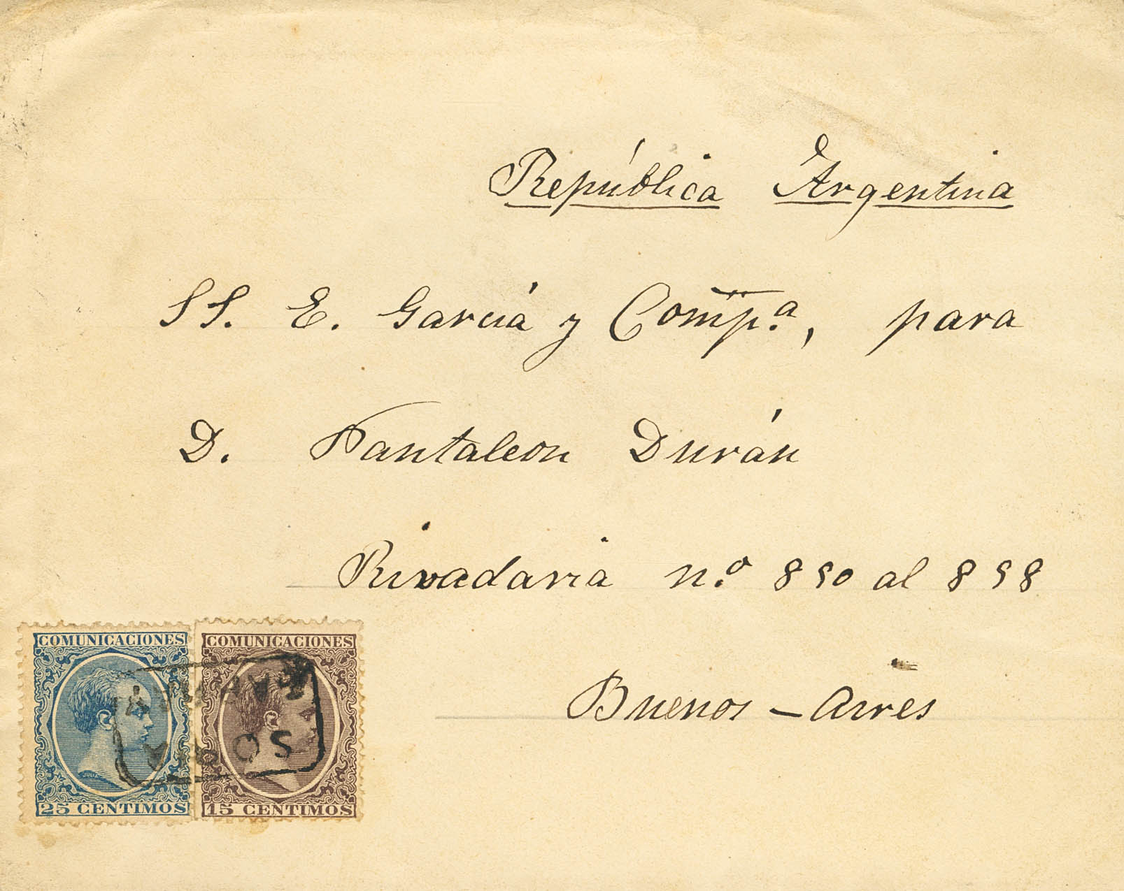 219, 221. 1889. 15 cts violeta y 25 cts azul. GARRAY (SORIA) a BUENOS AIRES (ARGENTINA). Matasello cartería SORIA / GARRAY. MAGNIFICA Y RARA.