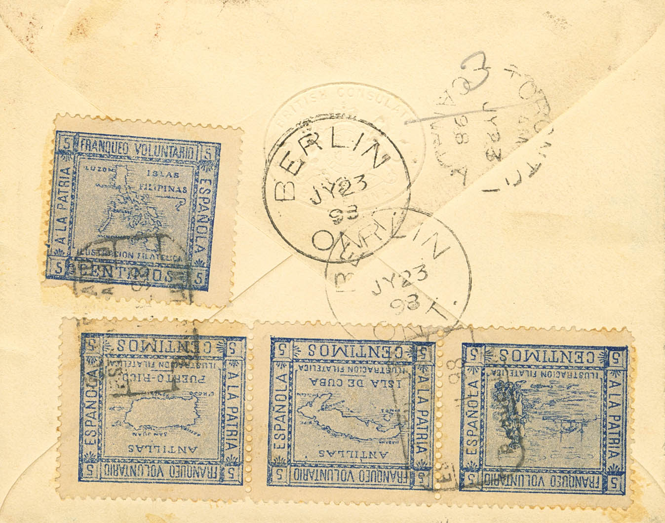 221(2), 23. 1896. 25 cts azul, dos sellos y 5 cts negro y las cinco viñetas (una en el frente y cuatro al dorso de la Ilustración Filatélica). Certificado de BARCELONA a CANADA. Al dorso tránsitos y llegada. MAGNIFICA Y ESPECTACULAR FRANQUEO, PIEZA DE ENORME ESPECTACULARIDAD.