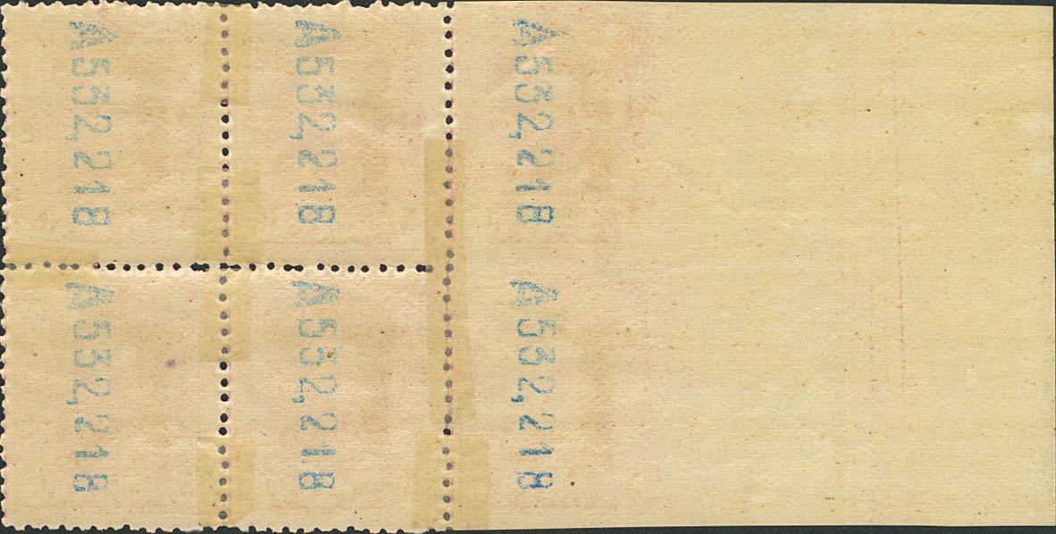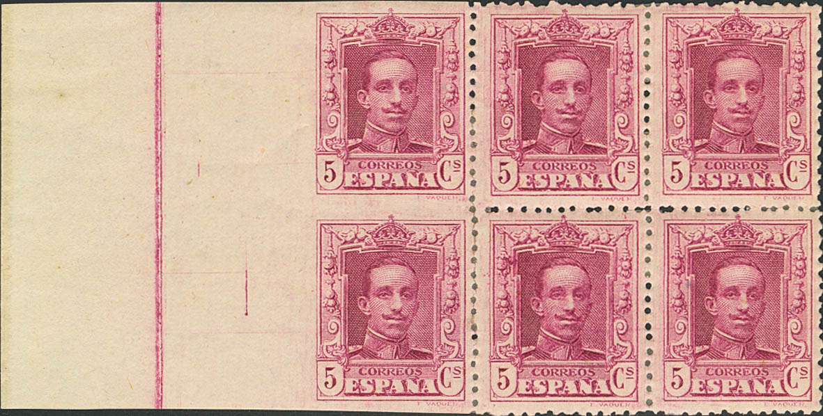 ★ 311dmd(2). 1922. 5 cts lila claro, bloque de seis, borde de hoja. Dos sellos SIN DENTAR EN TRES MARGENES. MAGNIFICO Y RARO. Edifil 2020: +490 Euros