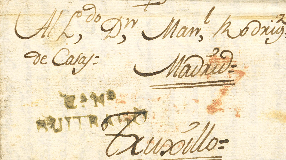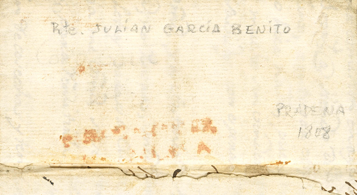 1808. PRADENA DEL RINCON (MADRID) a TRUJILLO, en el interior se menciona "Pues los gavachos los hemos tenido en este pueblo de paso" y "tenemos 150000 hombres de tropa en Segovia, de Infantería y Cavallería, entraron el día 13 y 14". Marca Cª Nª / BUITRAGO, en negro (P.E.2) edición 2004. MAGNIFICA Y MUY RARA CON TEXTO RELATIVO A LA OCUPACION FRANCESA DE 1808.