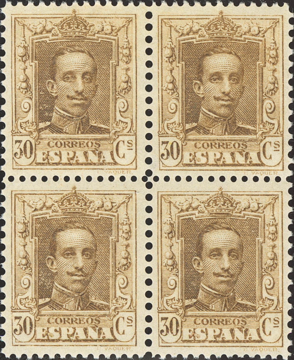 ★★ 318d(4). 1922. 30 cts castaño, bloque de cuatro. DENTADO 12¼ x 11¼. MAGNIFICO. Edifil 2020: 164 Euros
