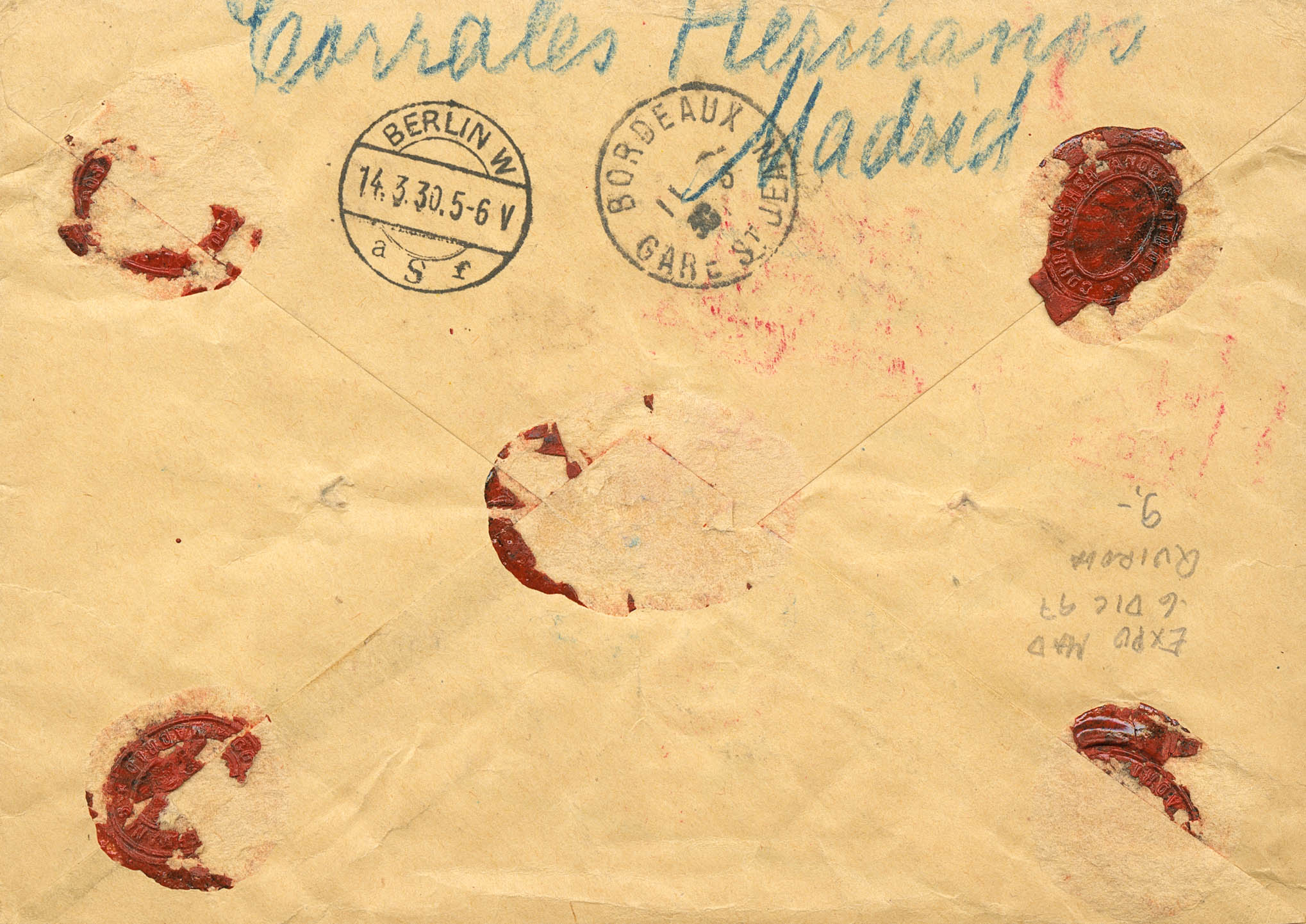 317A, 321(2). 1930. 25 cts rojo y 1 pts pizarra, dos sellos. Valores Declarados de MADRID a BERLIN (ALEMANIA). Al dorso llegada. MAGNIFICA.