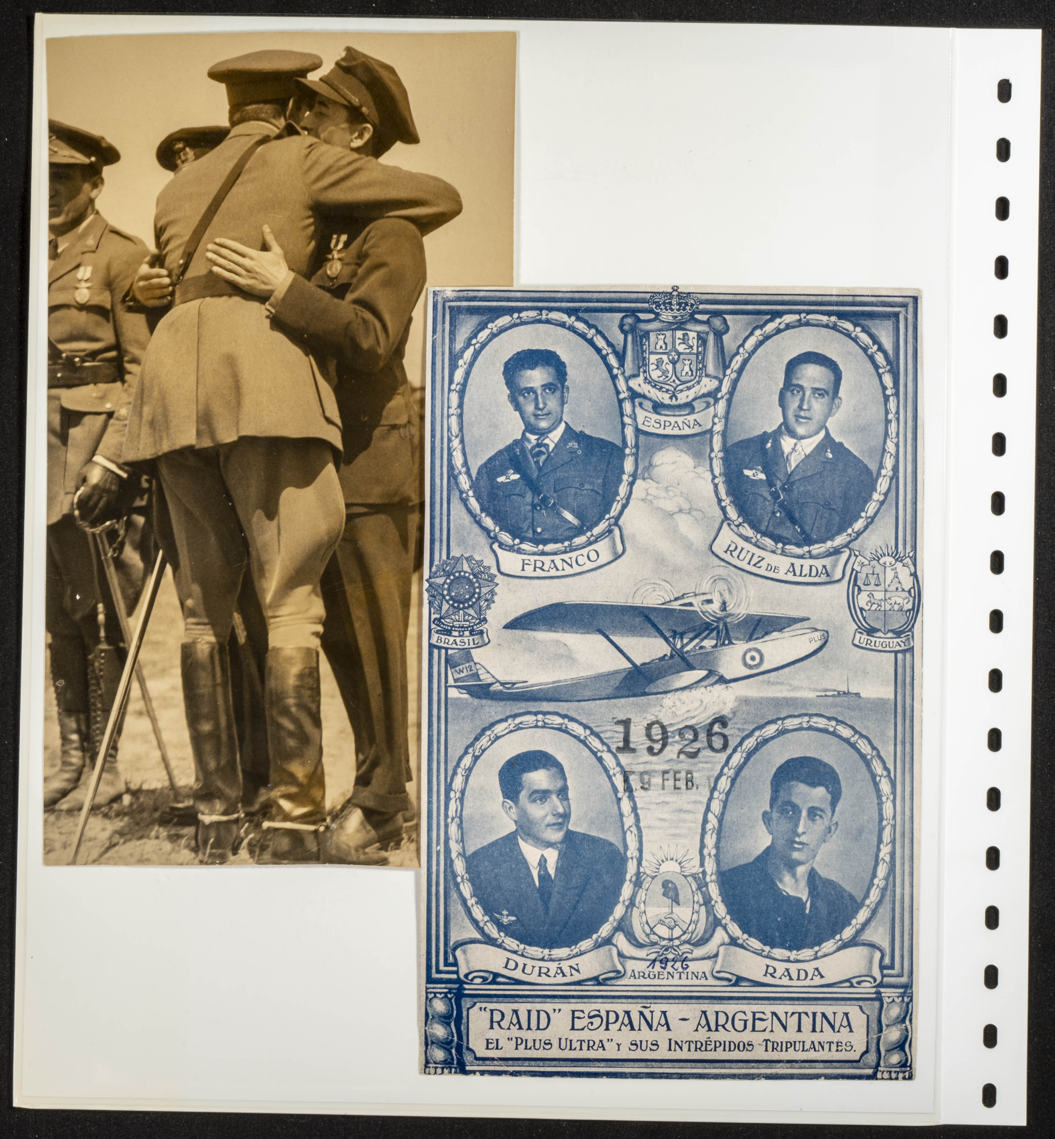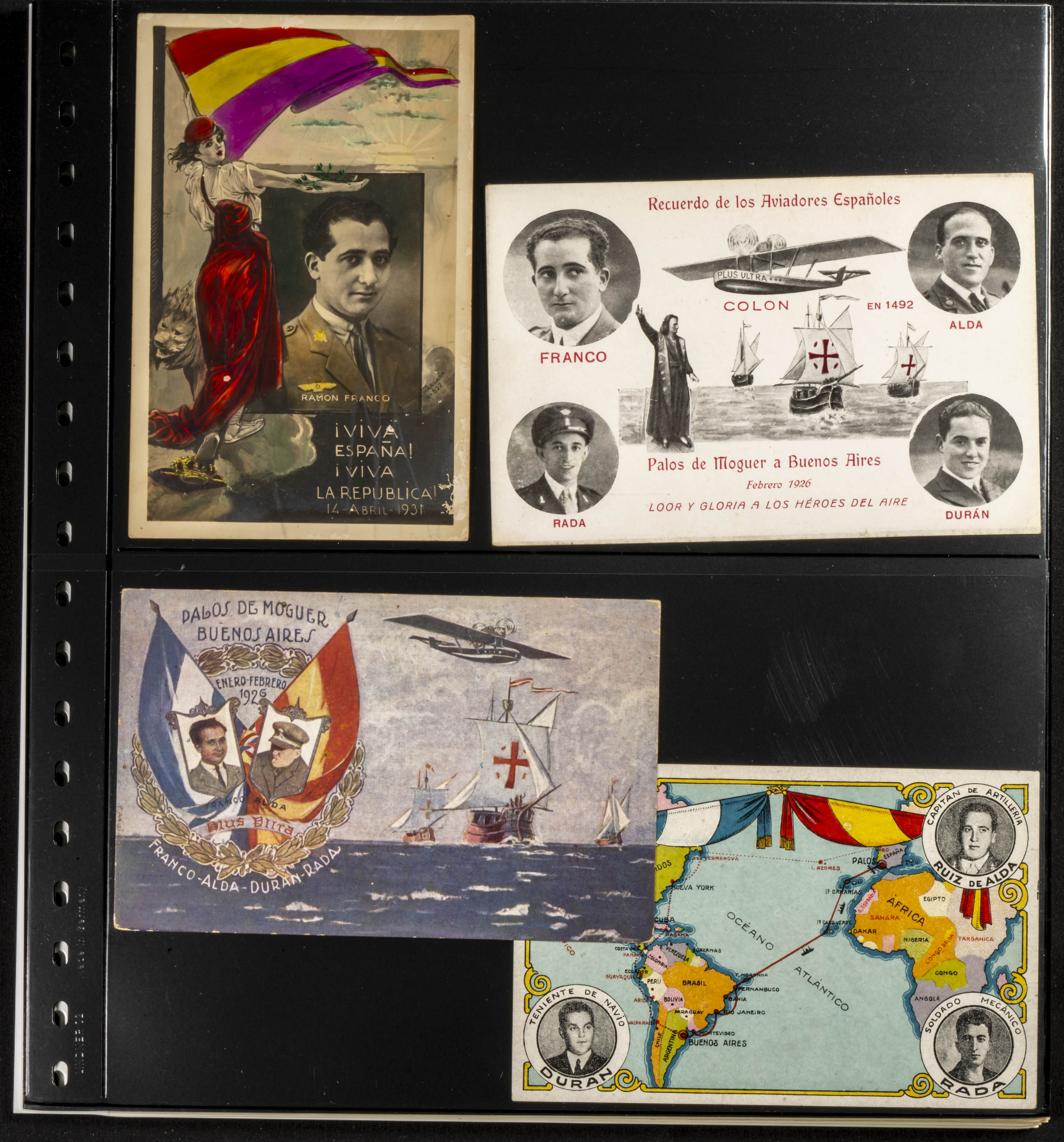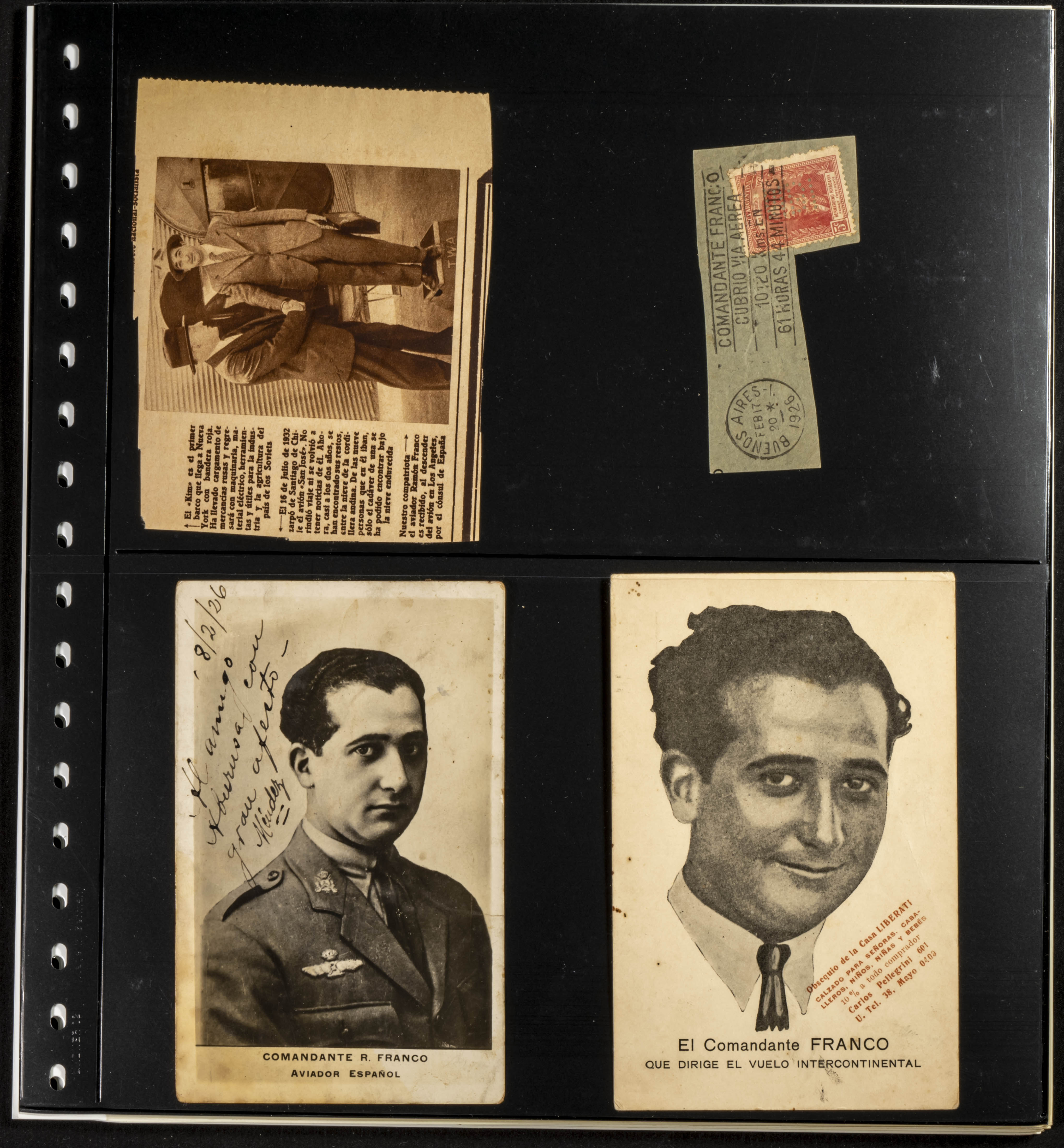△1926. Interesante conjunto de decenas de fotografías, recortes de periódico y tarjetas postales relativas al Raid Aéreo España-Argentina del avión Plus Ultra, con imágenes del Comandante Franco, Juan Manuel Durán, Julio Ruíz de Alda y el mecánico Pablo Rada, además del propio avión (algunas fotos originales) y la mayor parte de los diez años siguientes a la realización de esta gesta de la Aviación Española. MAGNIFICO Y ESPECTACULAR CONJUNTO, PROBABLEMENTE UNICO.
