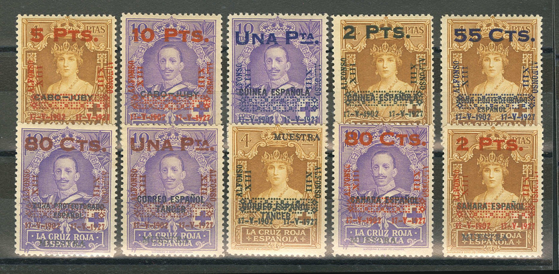 ★ 392/01M. 1927. Serie completa. MUESTRA, en mayúsculas y en negro. MAGNIFICA Y RARA. Edifil 2020: 1.275 Euros