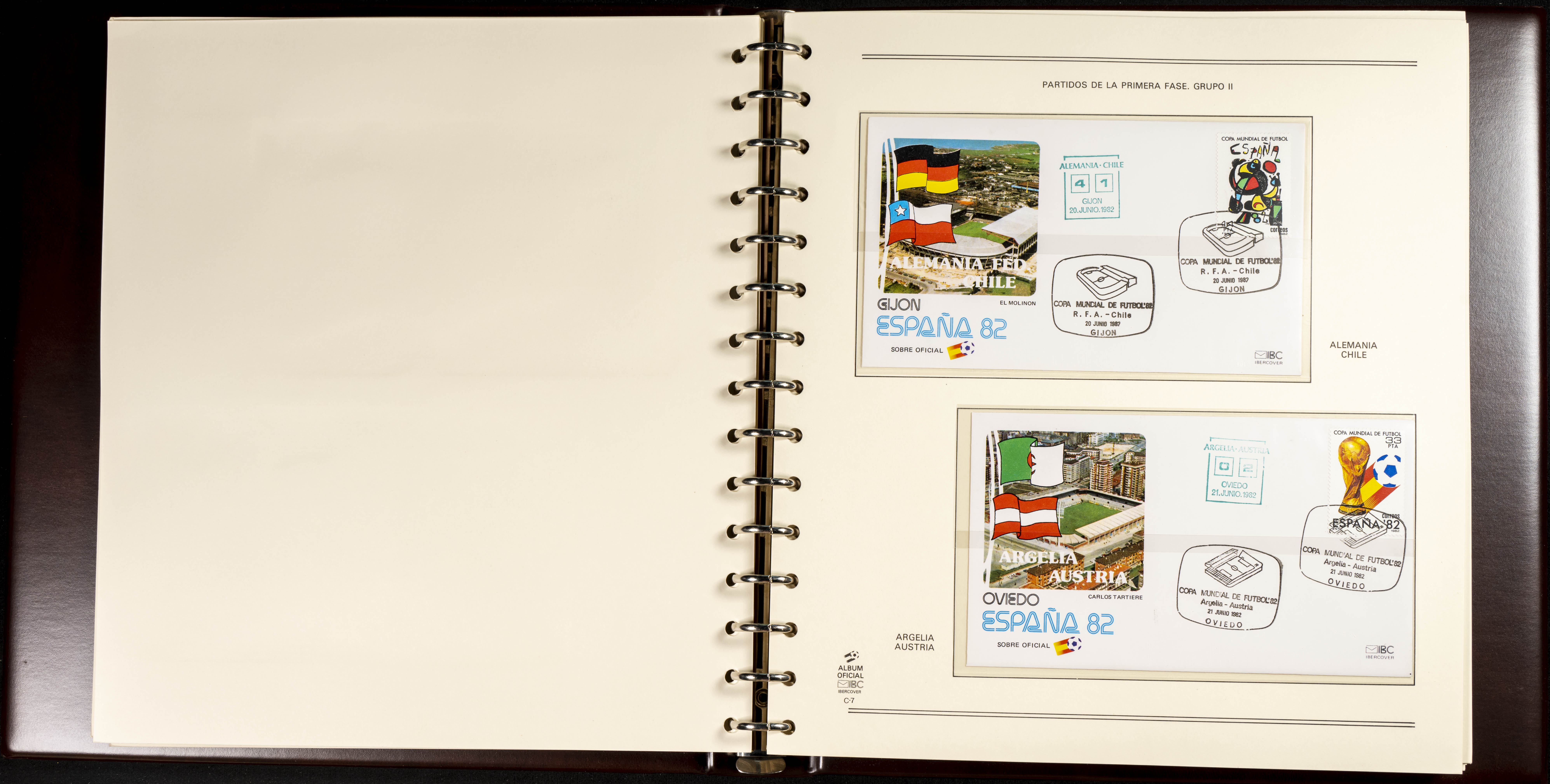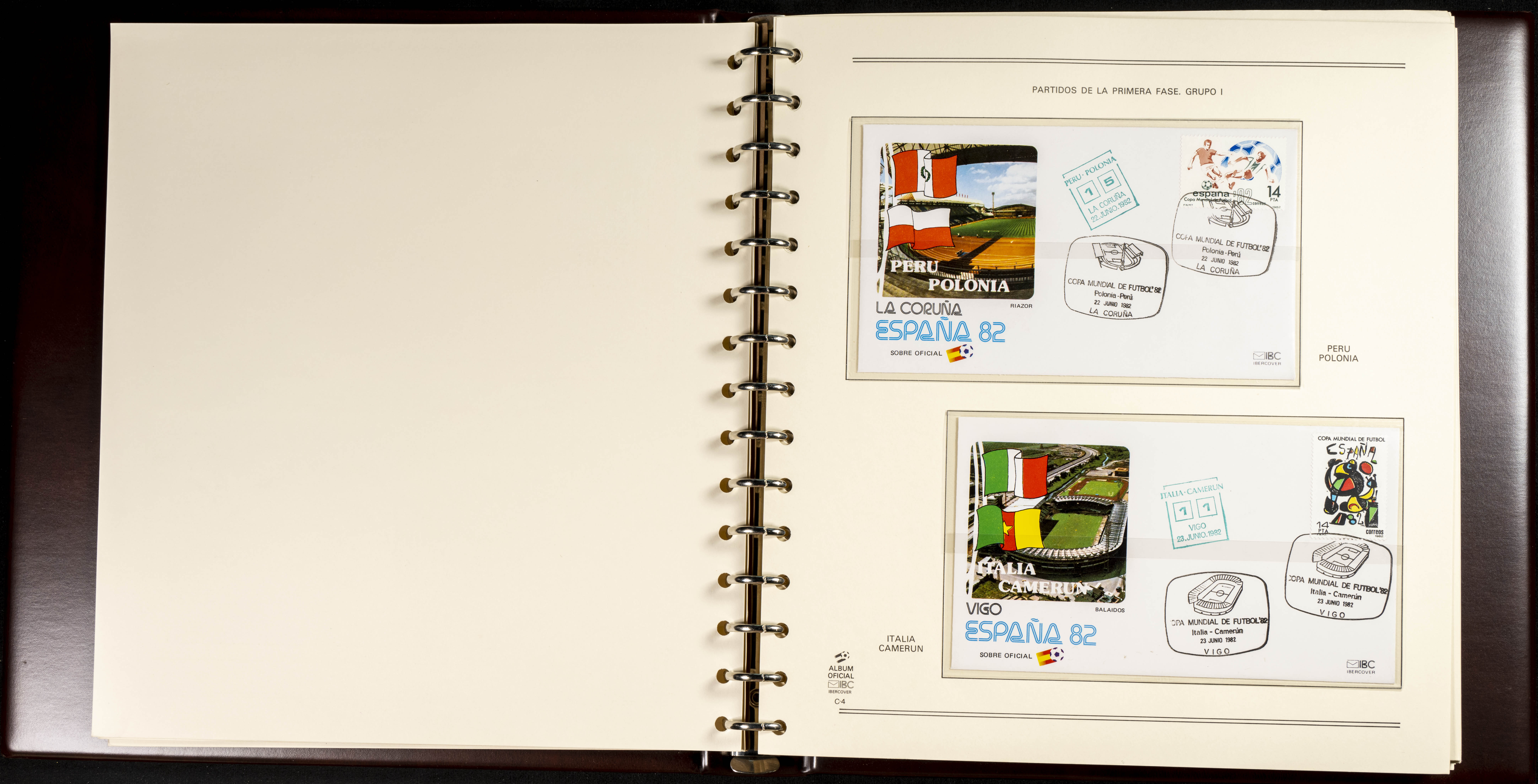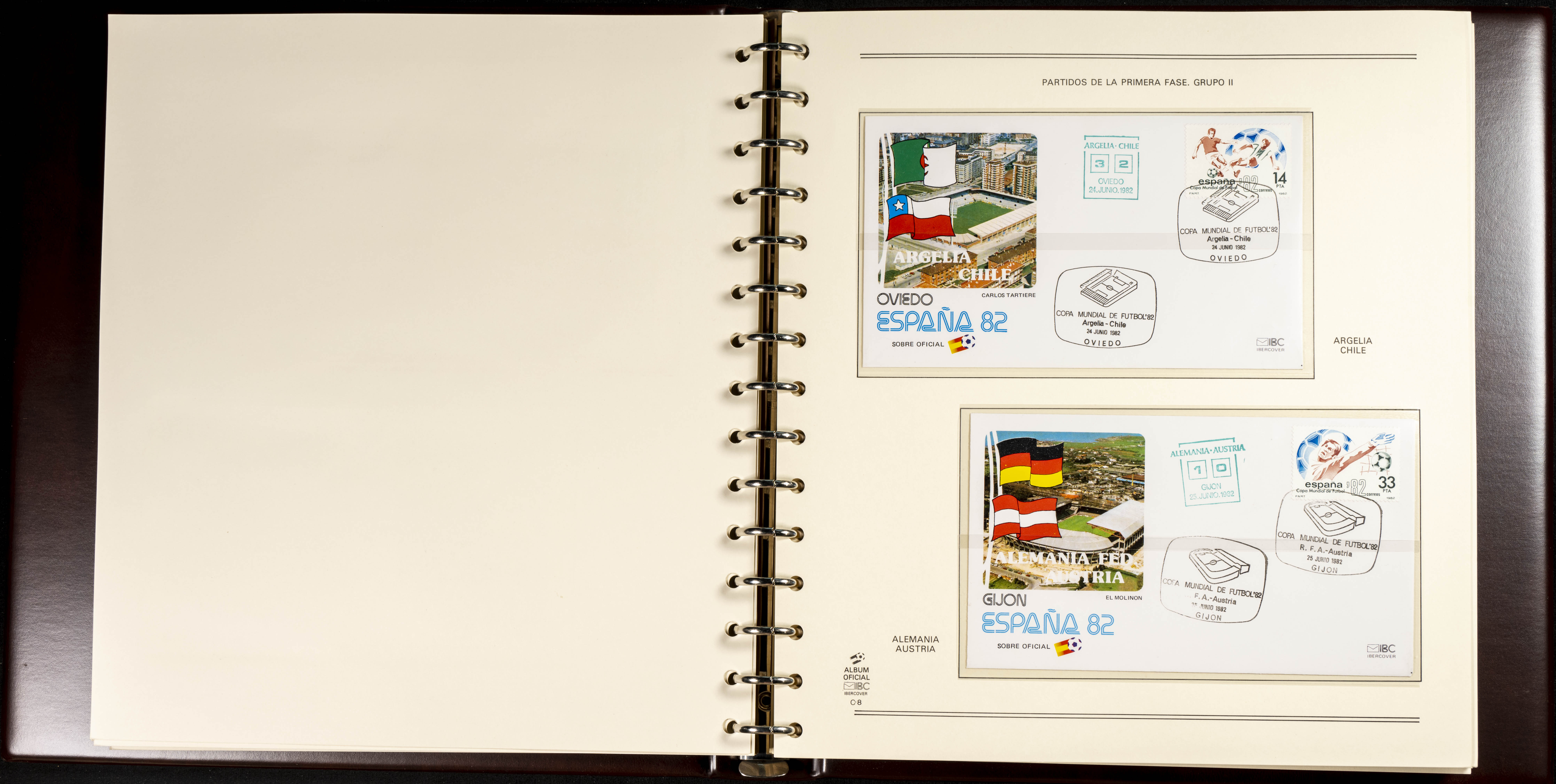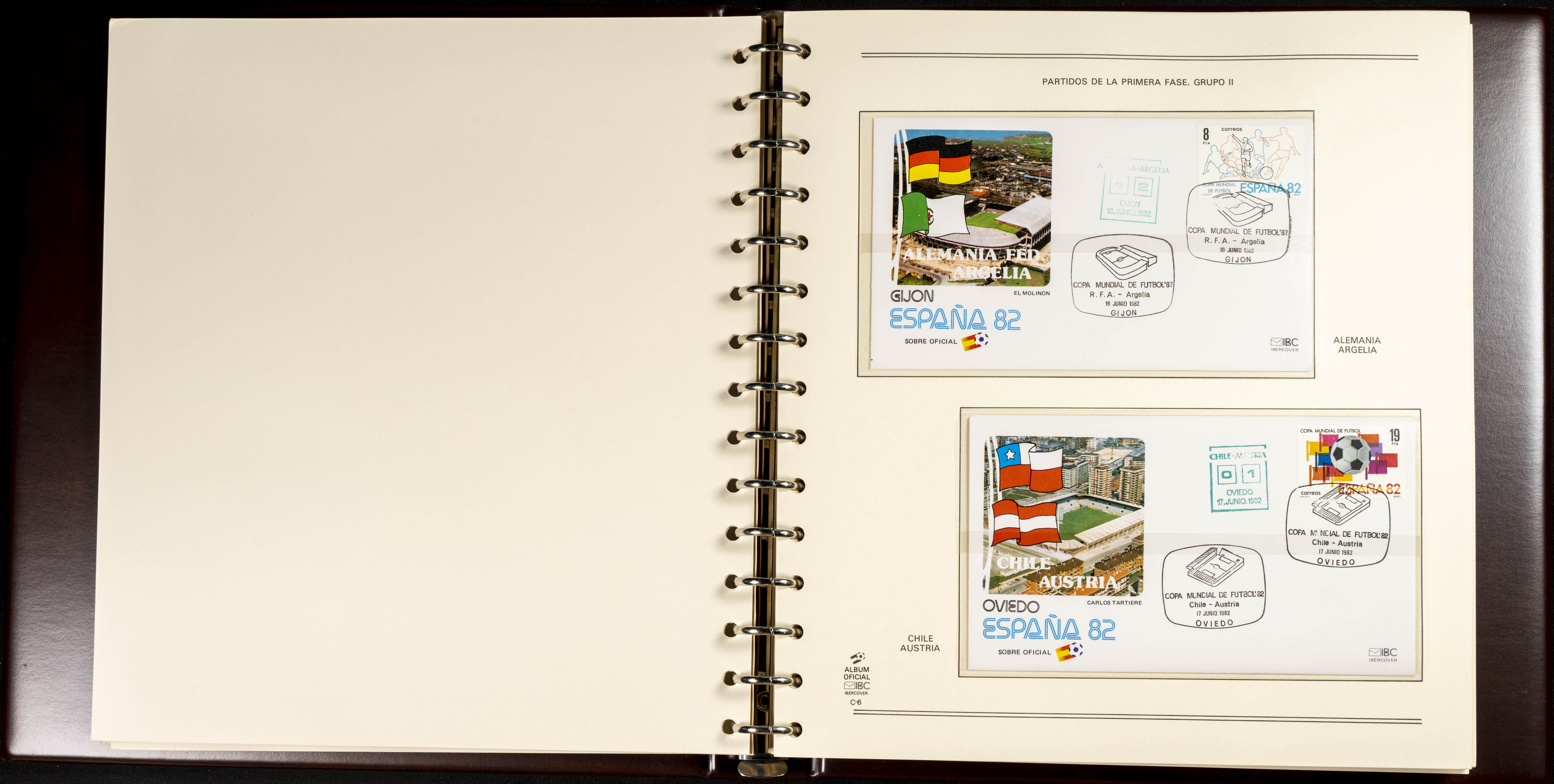 ★★1960. Colección temática muy completa del Mundial 82 montada en álbumes específicos y bien representada, incluyendo series y hojitas sin dentar, Pruebas de Lujo, hojitas individuales y Sobres de Primer Día, entre los que se incluyen los sobres de las fases de grupo. A EXAMINAR.