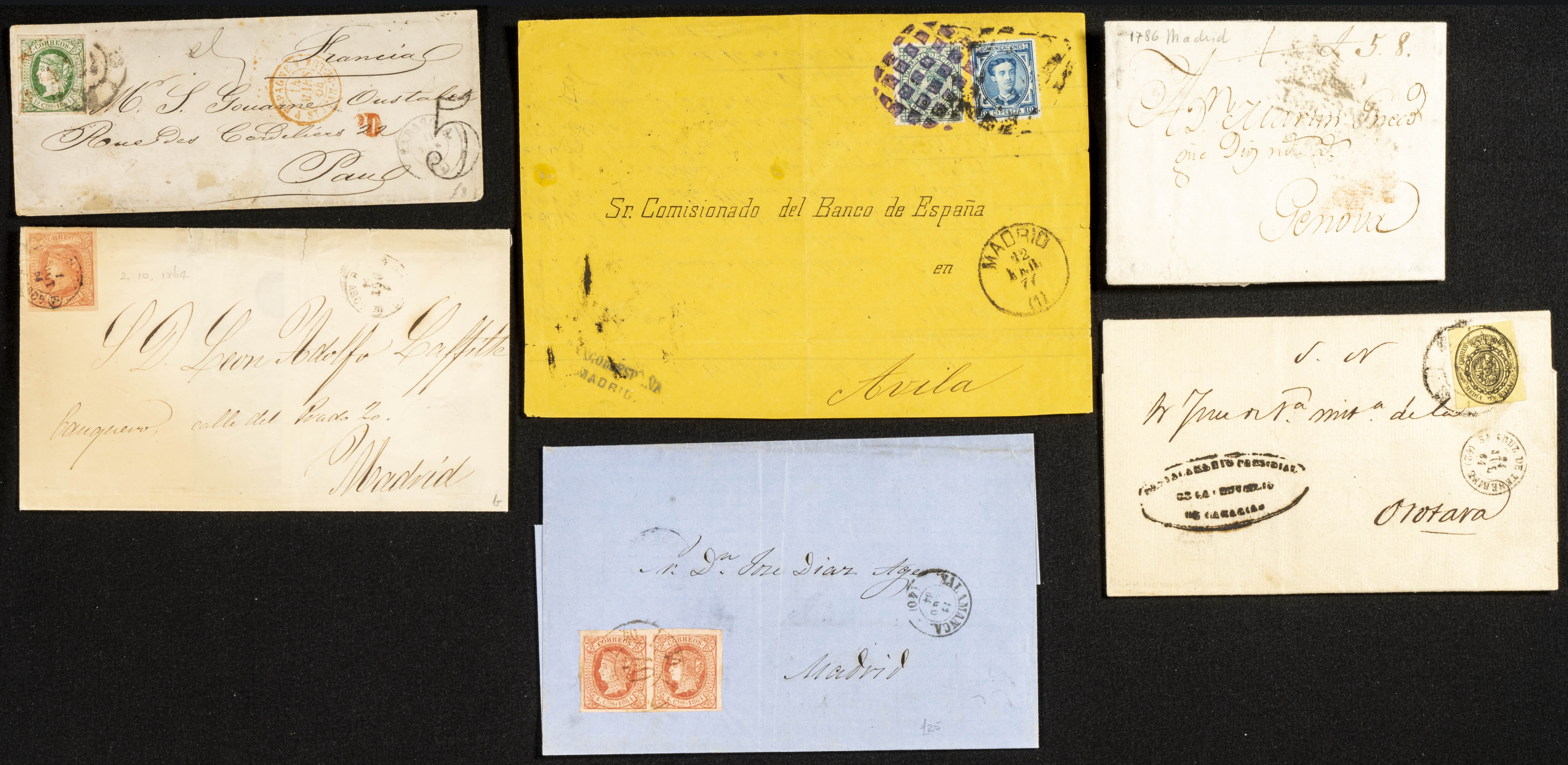 (1864ca). Conjunto de quince cartas circuladas entre 1864 y 1899 con franqueos diversos, algunas dirigidas al extranjero, incluye una carta prefilatélica de 1786 con marca coronada MADRID-1, una carta de 1877 con matasello círculo de puntos sin limar y un justificante de aviso de recibo de Melilla con sello de 10 cts de Pelón, entre otros. A EXAMINAR.