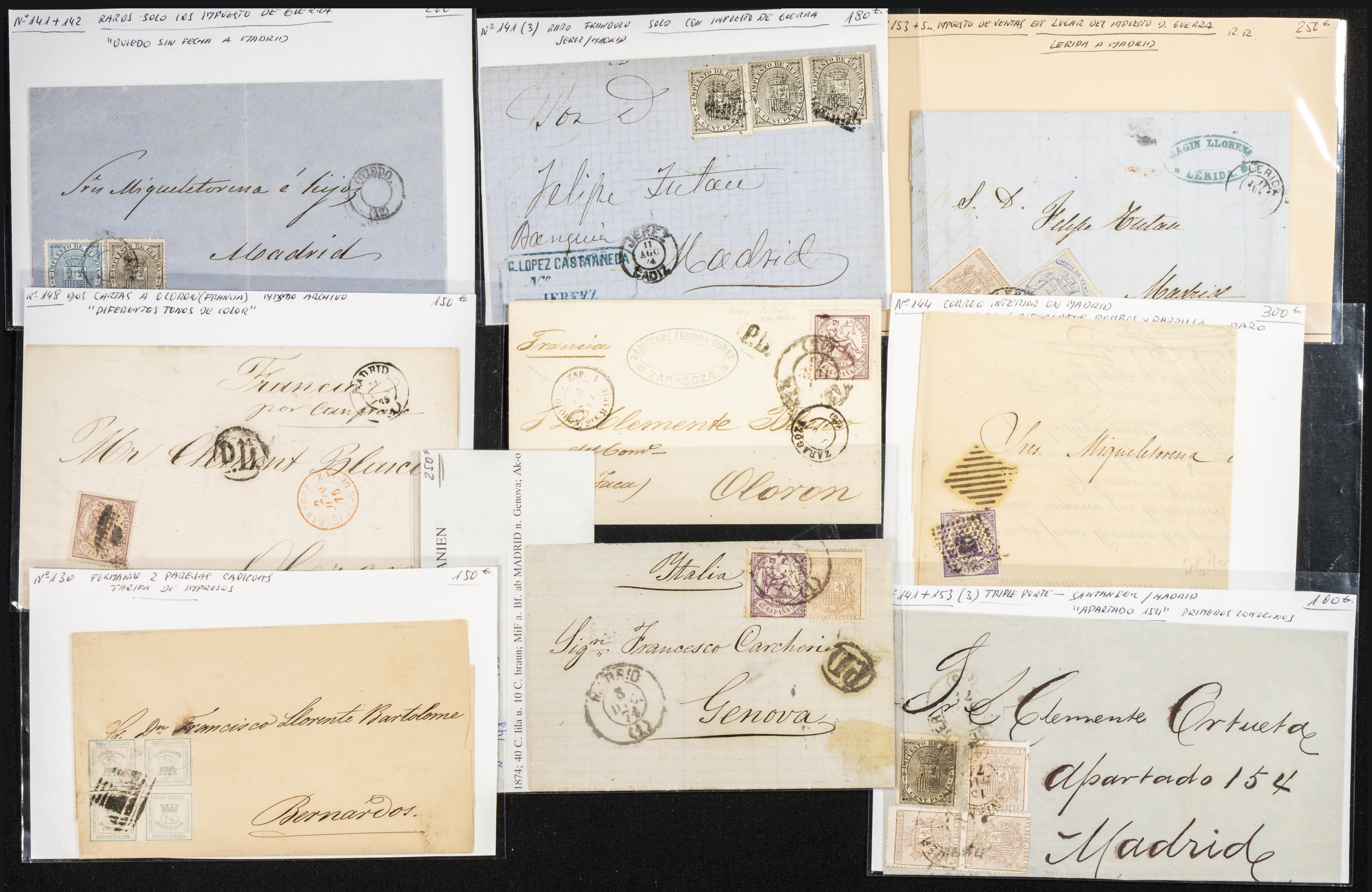 (1873ca). Interesantísimo conjunto de quince cartas circuladas durante el periodo de la I República (1873-1875) con franqueos diversos, destacando una circulada con FALSO POSTAL de 10 cts verde de 1873, tres cartas franqueadas sólo con sellos de Impuesto de Guerra (una con serie completa de 1874) y otra con sello de 5 cts ultramar de Impuesto de Ventas. A EXAMINAR.