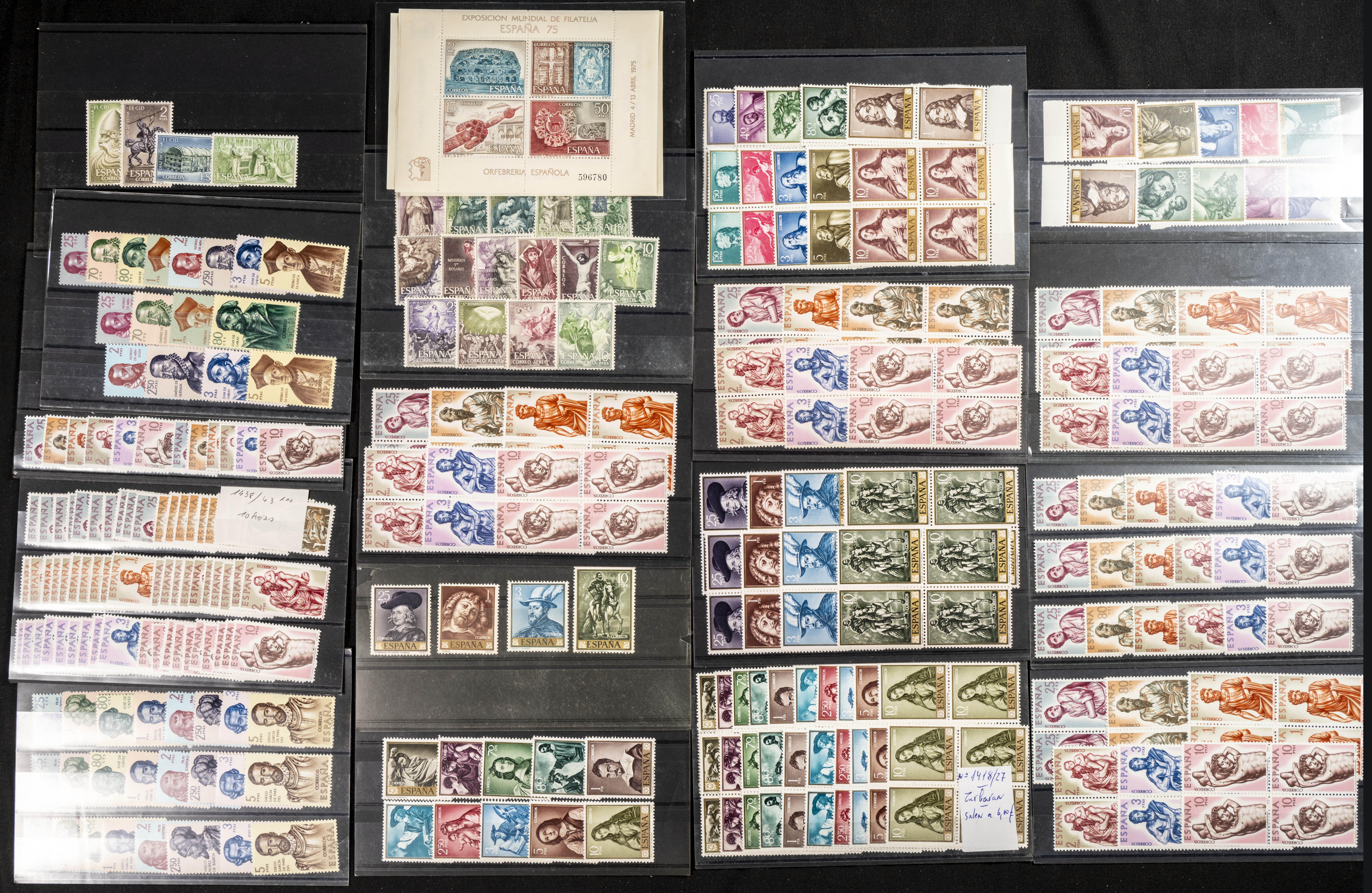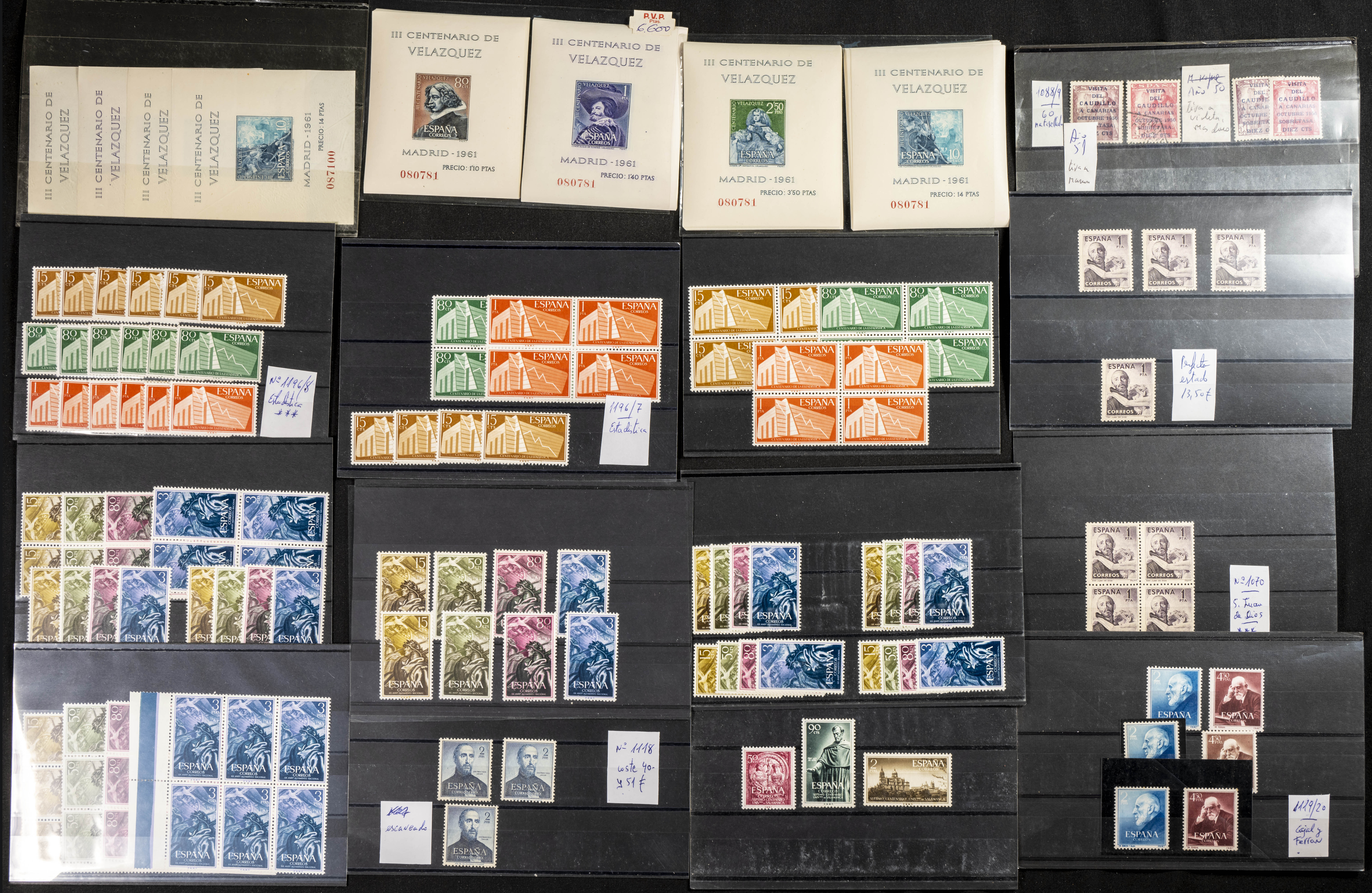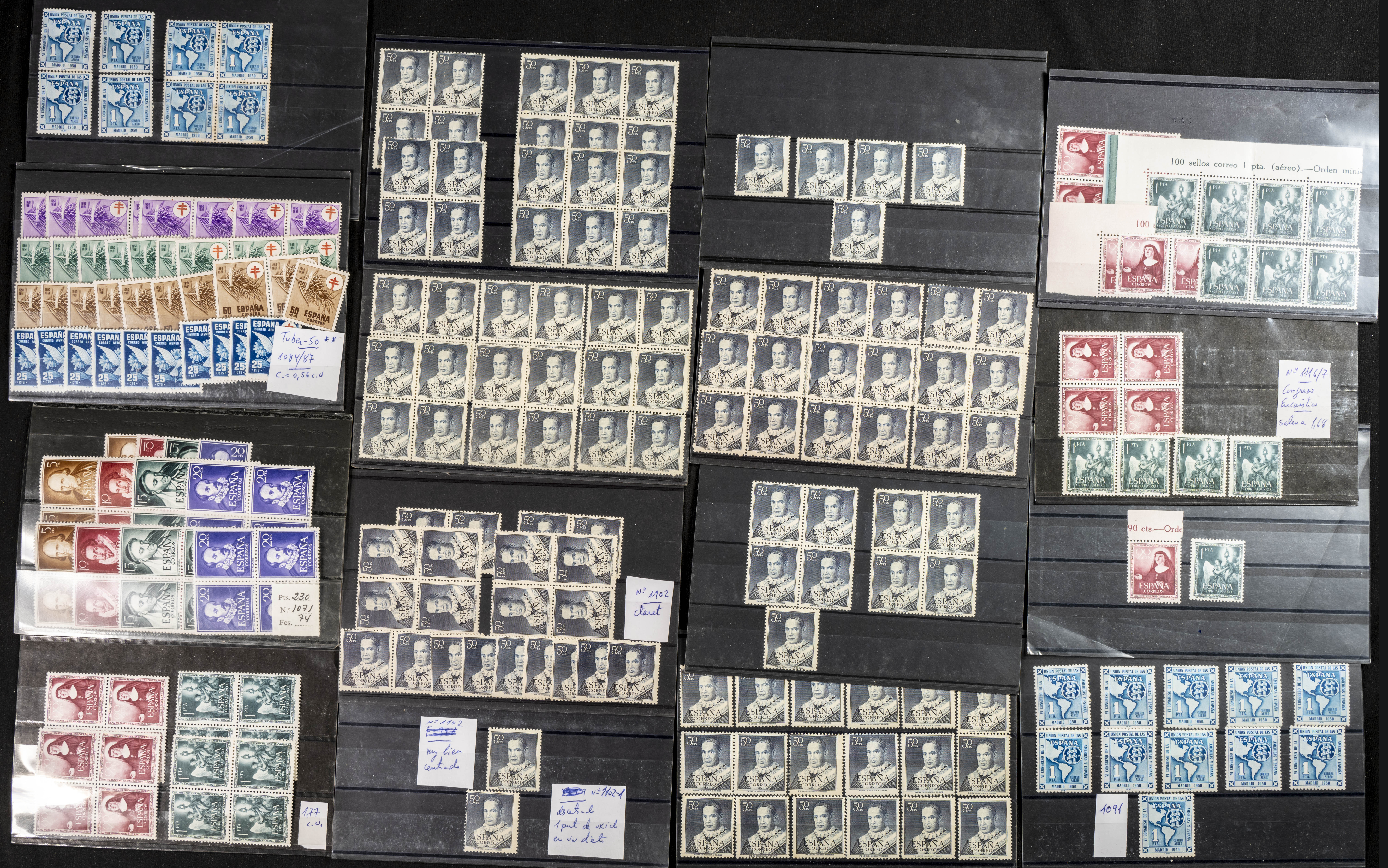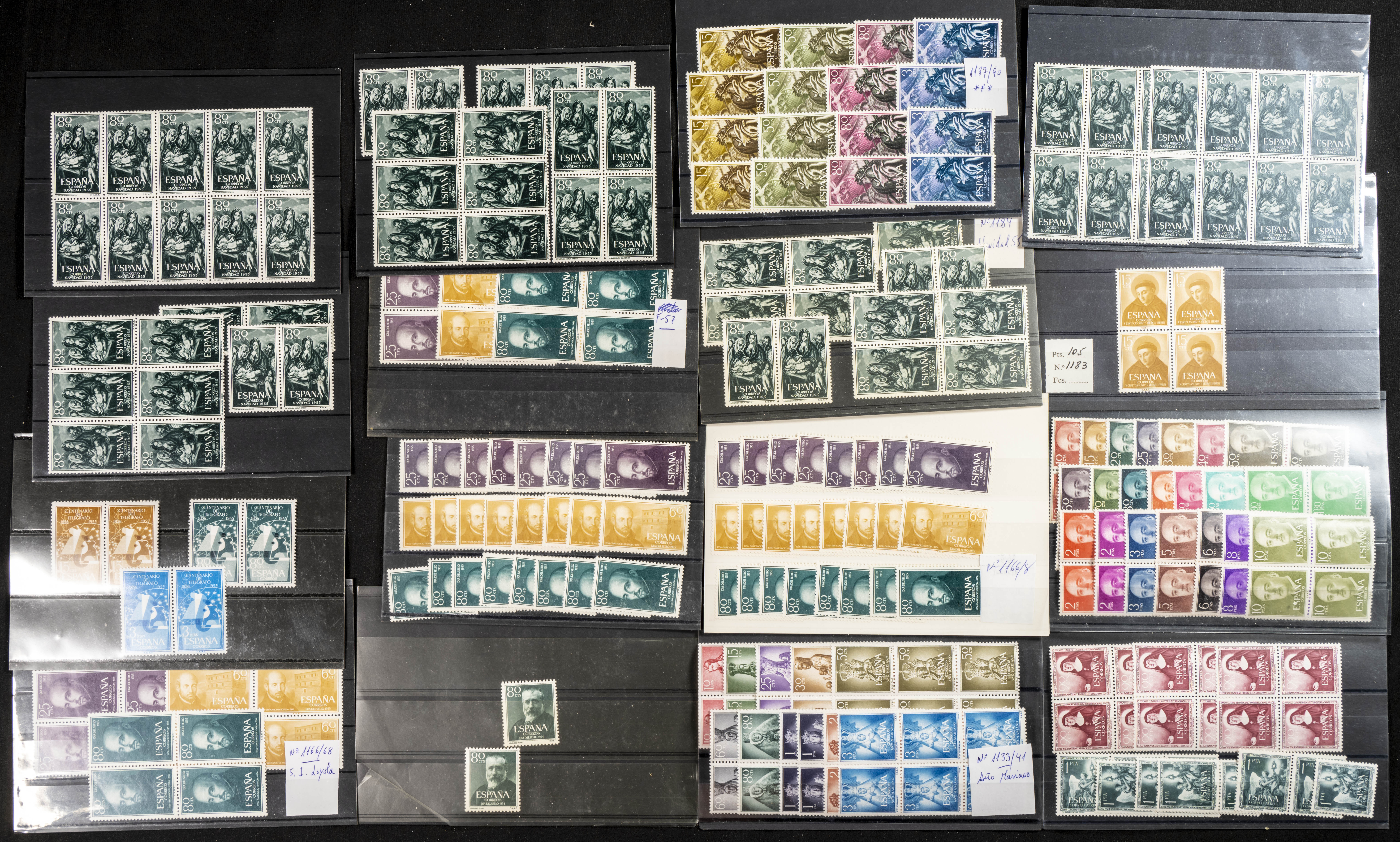 ★★/★(1950ca). Interesante conjunto-stock de cientos de series completas y algún sello suelto entre 1950 y 1964, en nuevo e incluyendo dos series del Caudillo a Canarias terrestre (un sello de 1 pts usado) con fijasellos y veintiocho series completas de C.I.F. 1960 (manchitas del tiempo), tres juegos de Bruselas (dos matasellados), además de un stock de sellos sueltos de Colonias Españolas de Africa entre 1950 y 1970, en nuevo. ALTISIMO VALOR DE CATALOGO. IMPRESCINDIBLE EXAMINAR.