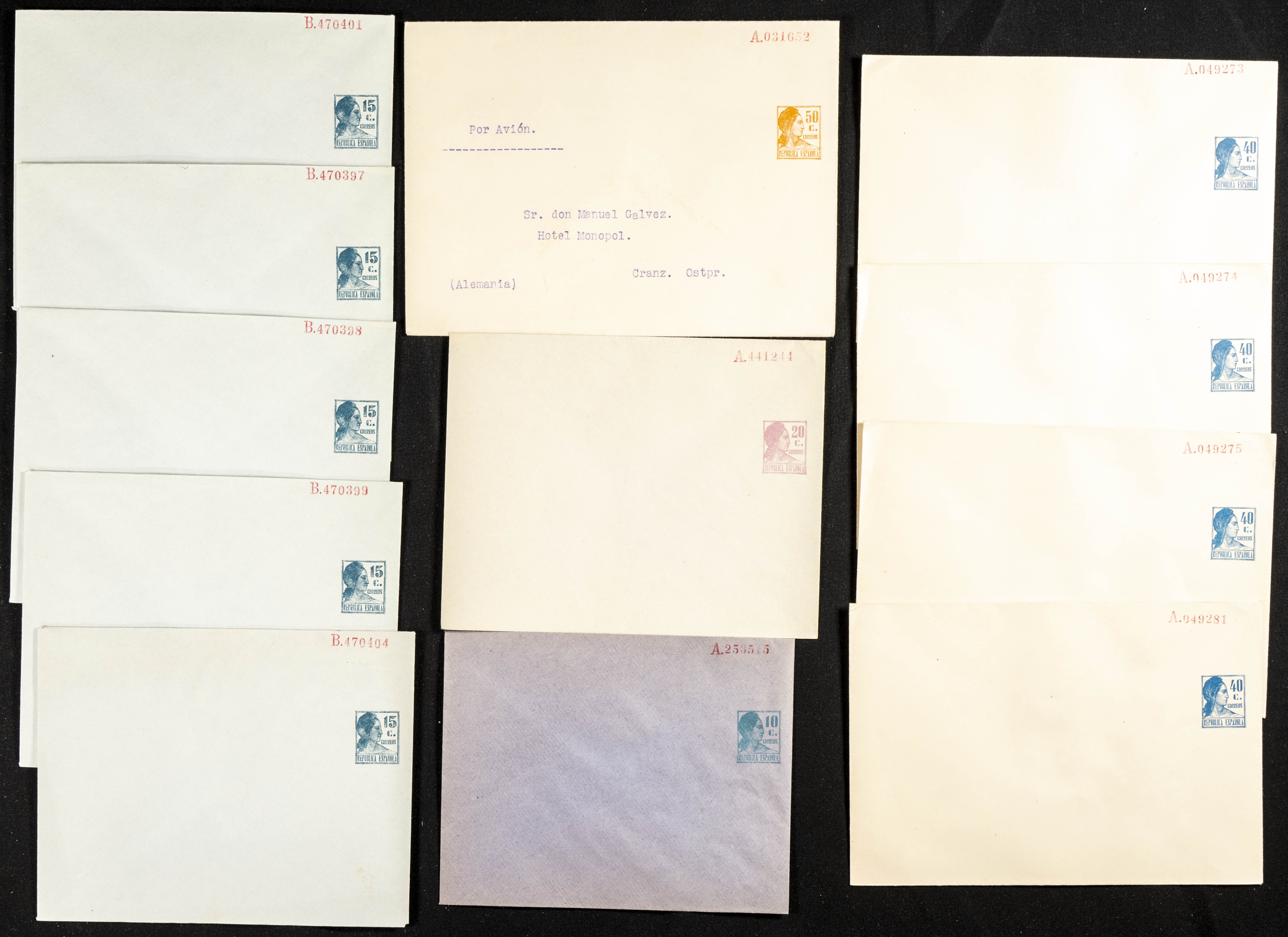 (★) EP1171,EP1183,EP1194,EP1295. (1932ca). Conjunto de doce Sobres Entero Postales Privados de HERALMI de 10 cts, 15 cts (cinco sobres), 20 cts, 40 cts (cuatro sobres) y 50 cts (el 50 cts con destinatario pero sin circular). MAGNIFICO Y RARISIMO CONJUNTO. (Láiz 2006, 10100 Euros)