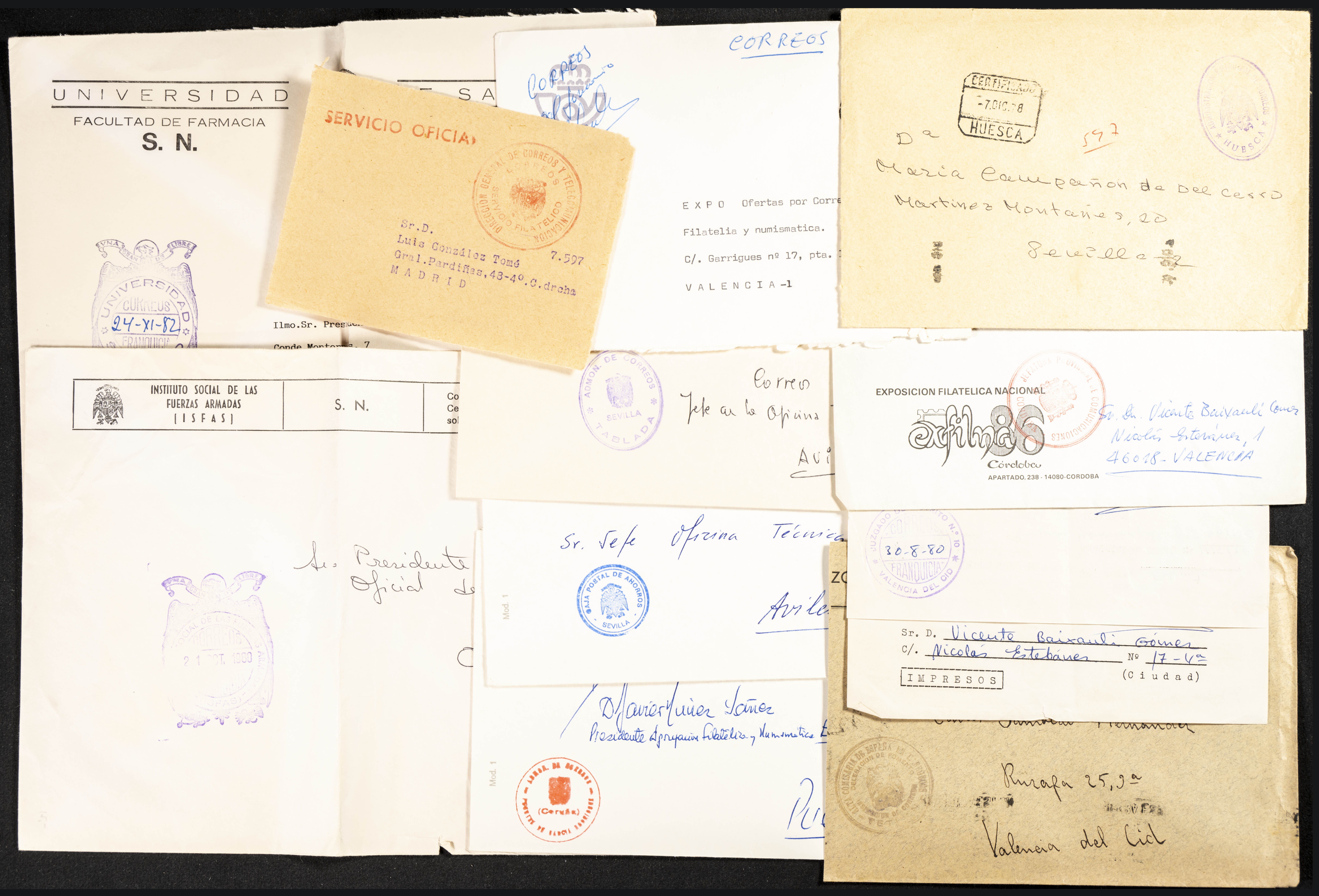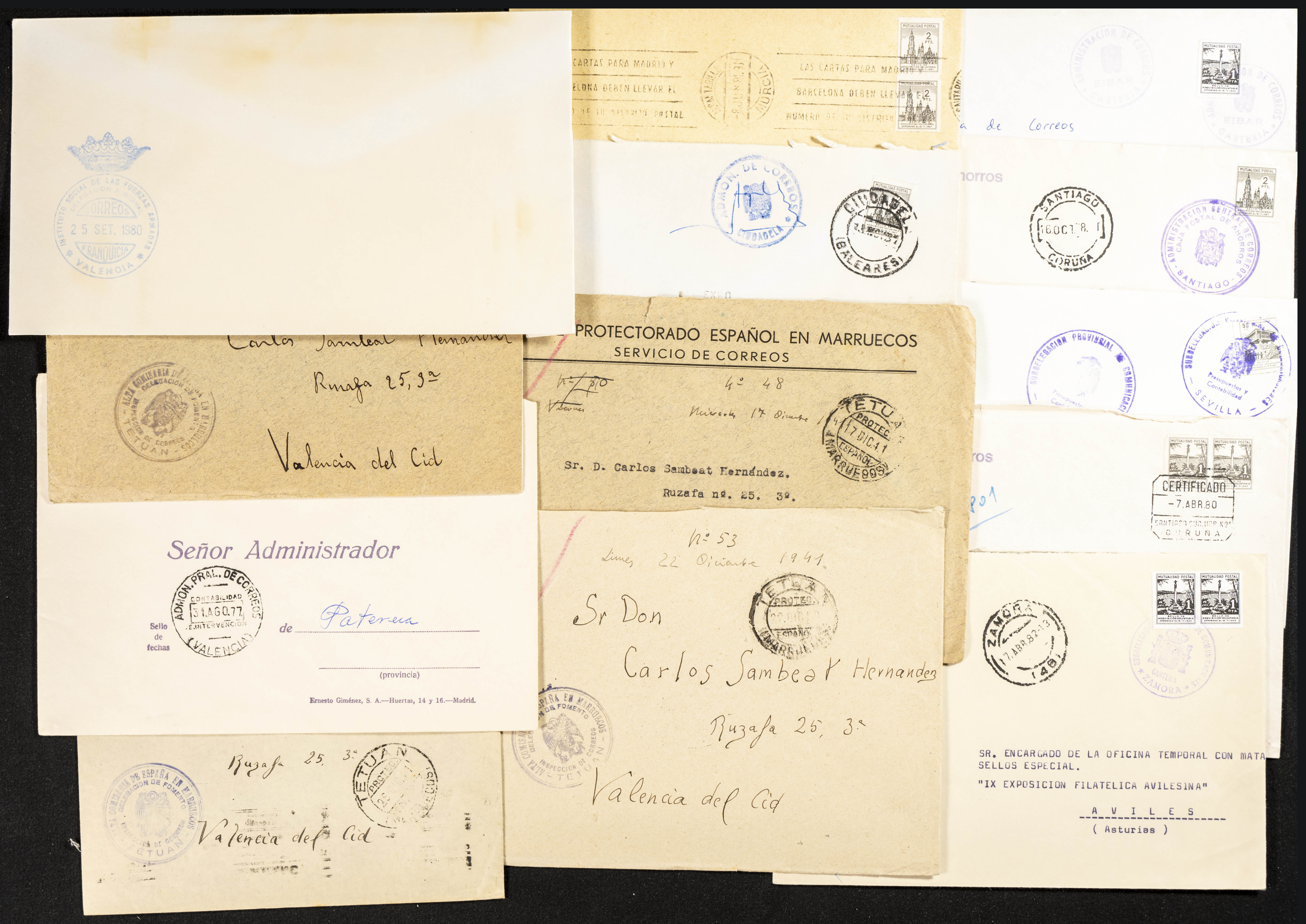 (1941ca). Conjunto de más de veinte cartas circuladas entre 1941 y 1980, siete con sellos de Mutualidad Postal y el resto con marcas de franquicia, incluye cinco sobres con origen en Marruecos. A EXAMINAR.