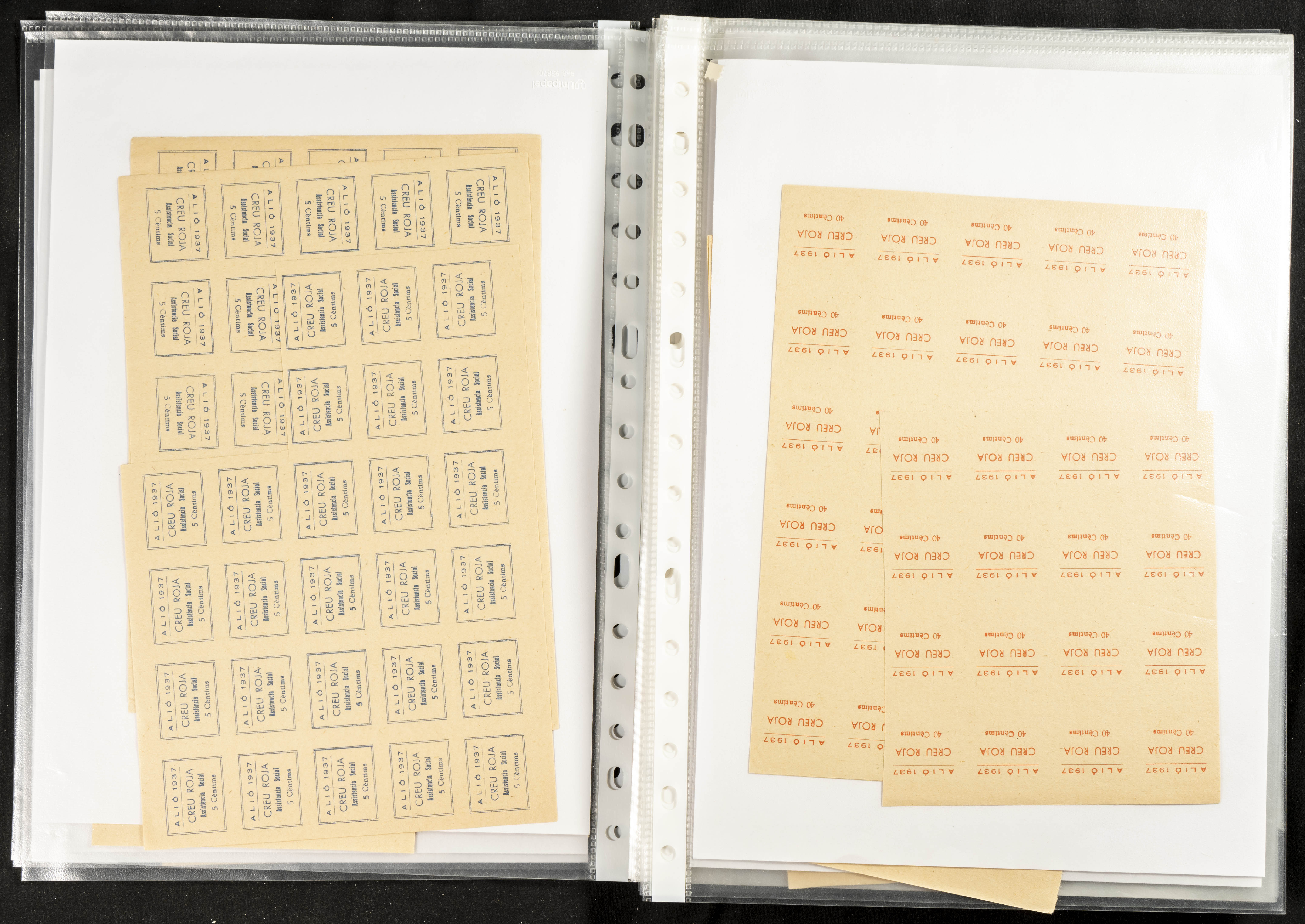★★(1936ca). Interesantísimo conjunto de Emisiones Locales Benéficas de diferentes provincias con sellos sueltos, hojas bloque y series completas, la mayoría nuevas y montadas en clasificadores o fichas con algunas repeticiones. IMPRESCINDIBLE EXAMINAR.