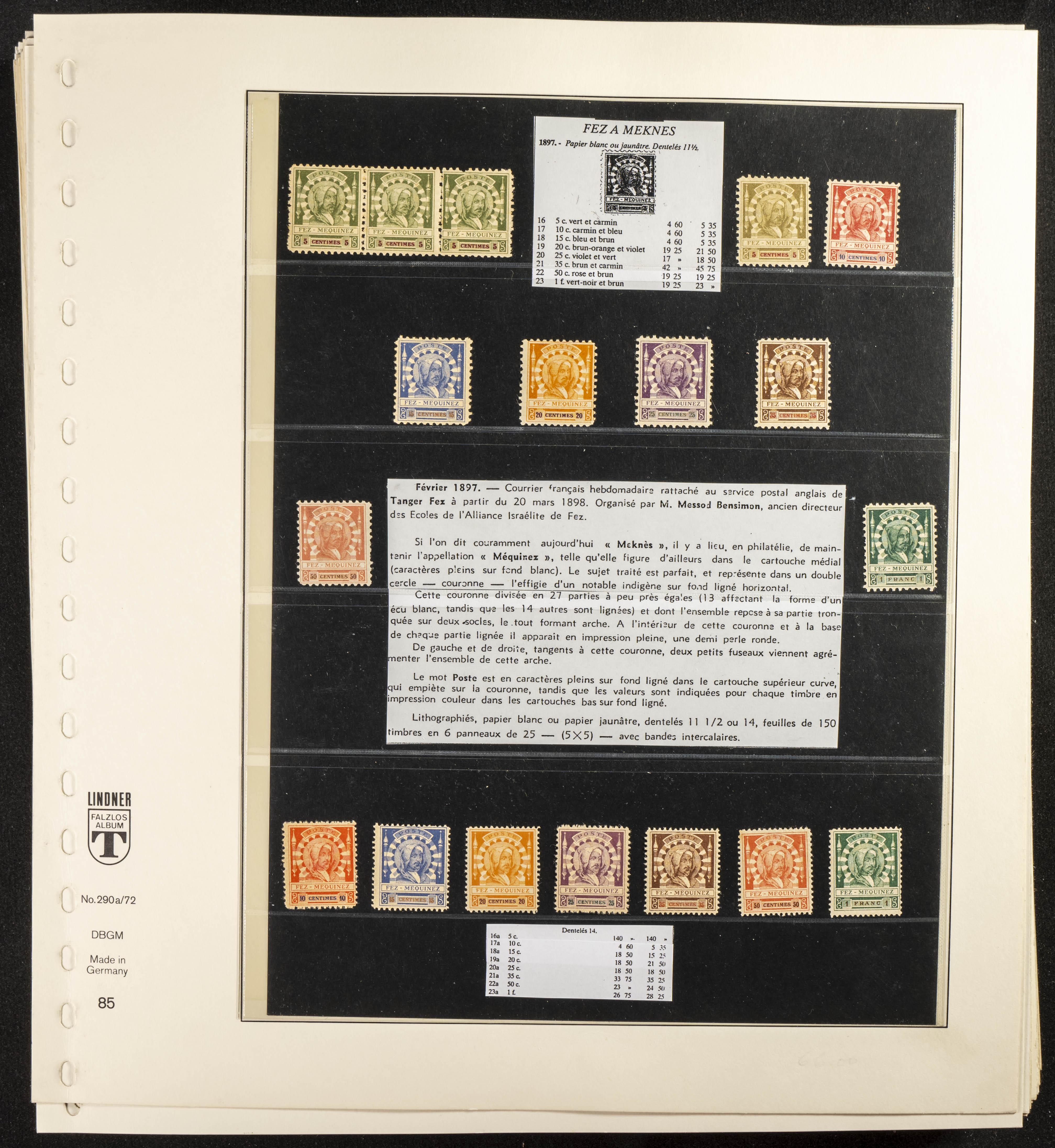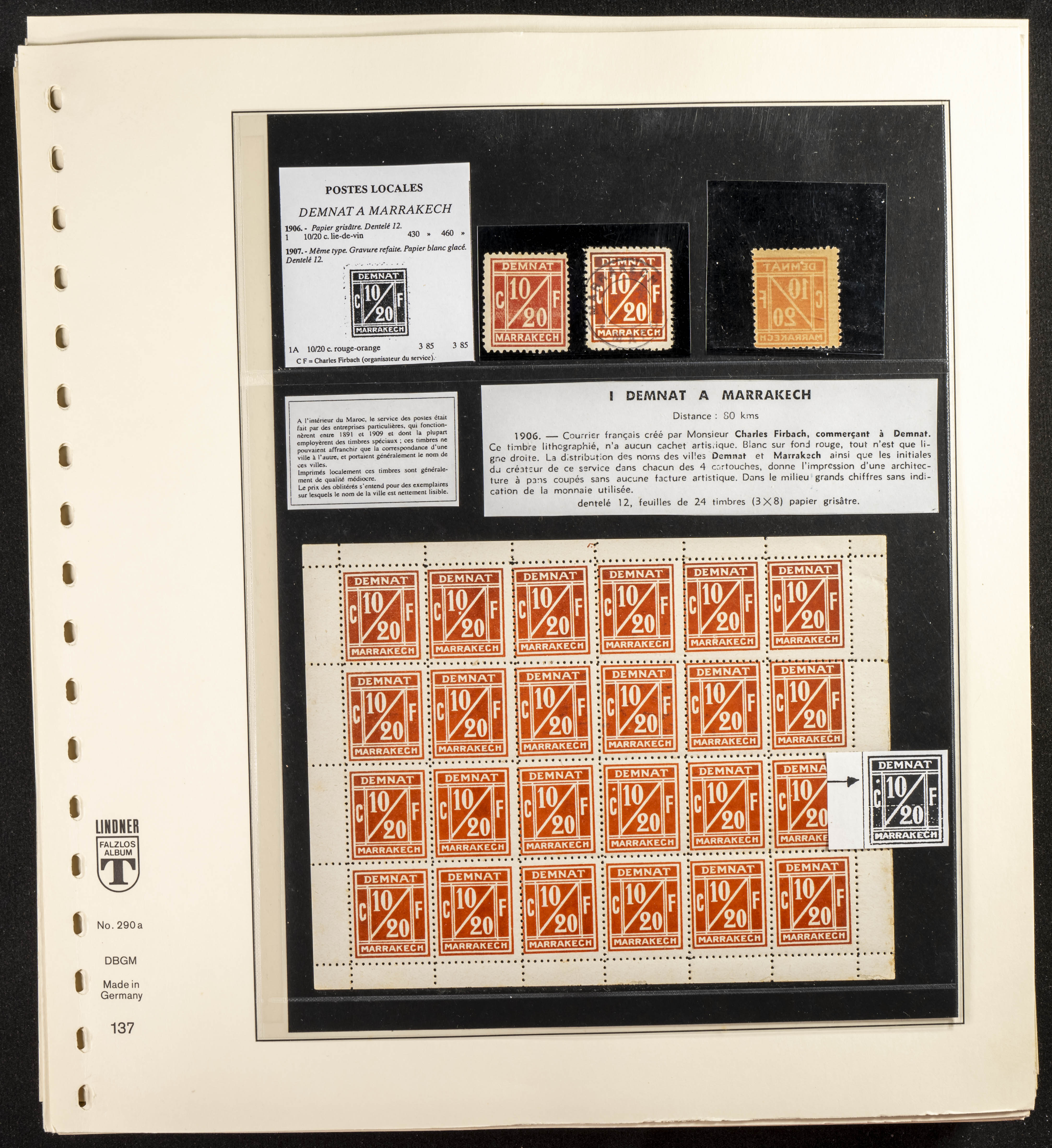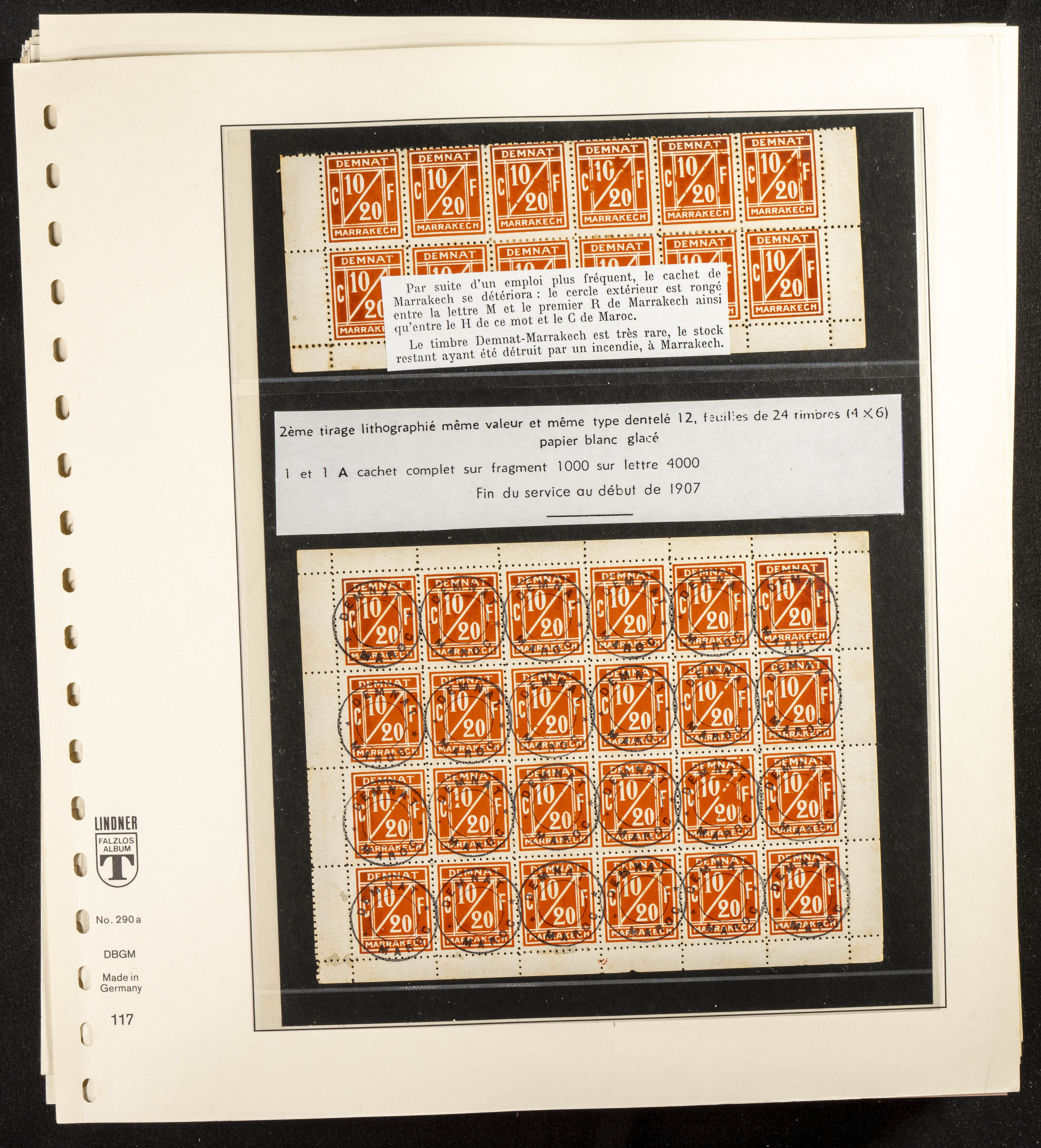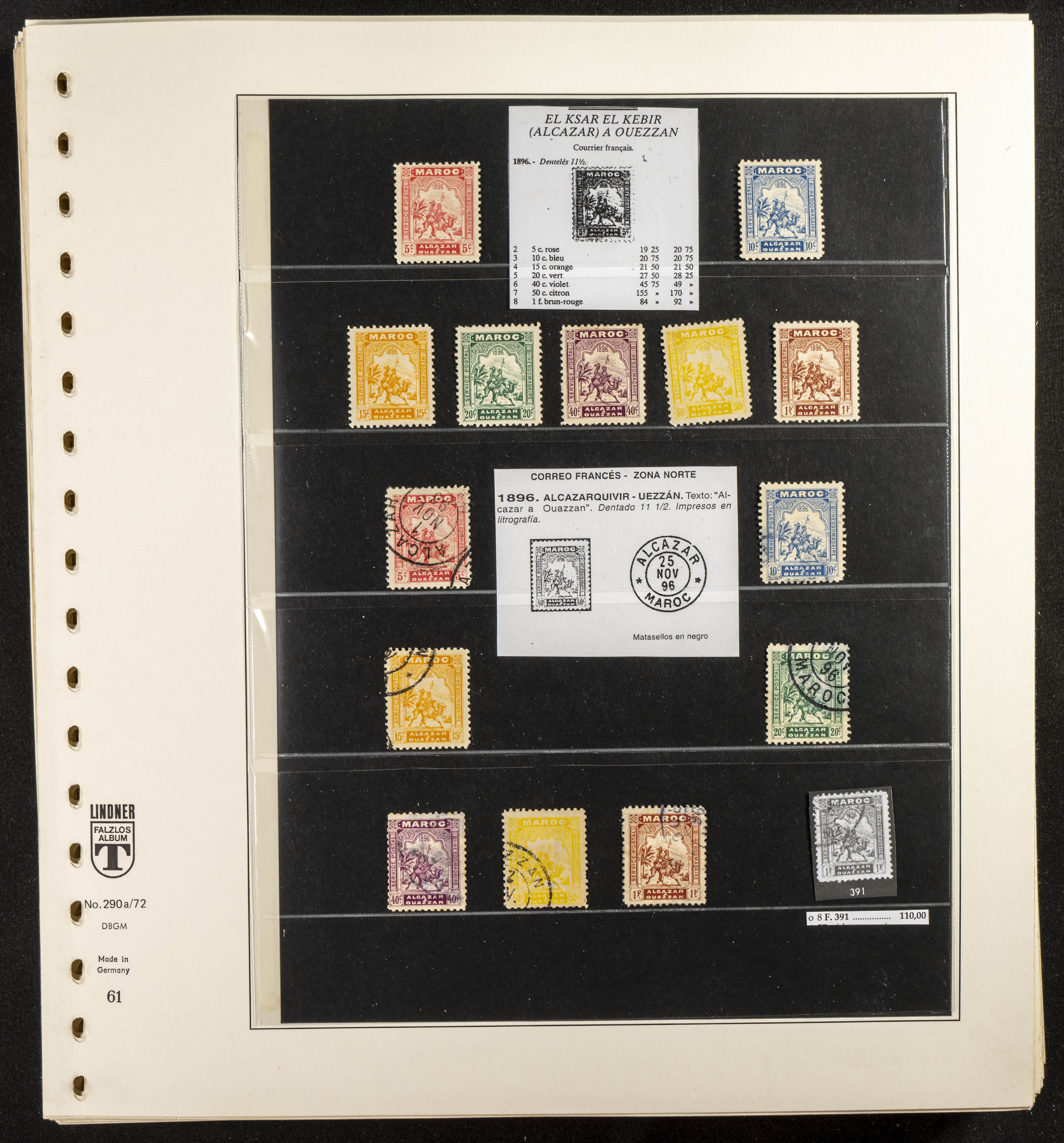 ★/(1892ca). Espectacular y prácticamente completa colección de los Correos Locales de Marruecos entre 1892 y 1900, en nuevo y usado con repeticiones en usado y numerosas variedades, destacando el 1º sello Deminat a Marrakech, serie completa EL KSAR EL KEBIR, dos series nuevas y usadas Mazagan-Azenour más una tira de cinco del 25 cts azul (extraordinariamente rara), serie completa nueva Mogador-Agadir, dos series (nueva y usada) de Tánger-Tetuán, dos series (nueva y usada) de Tetuán-Chechouan, además de algunos ensayos de color y pruebas de la emisión de Mazagan, Enteros Postales y una carta de la misma emisión. MAGNIFICO Y EXCEPCIONAL CONJUNTO, REUNIDO A LO LARGO DE MUCHOS AÑOS Y QUE SE OFRECE INTACTO.