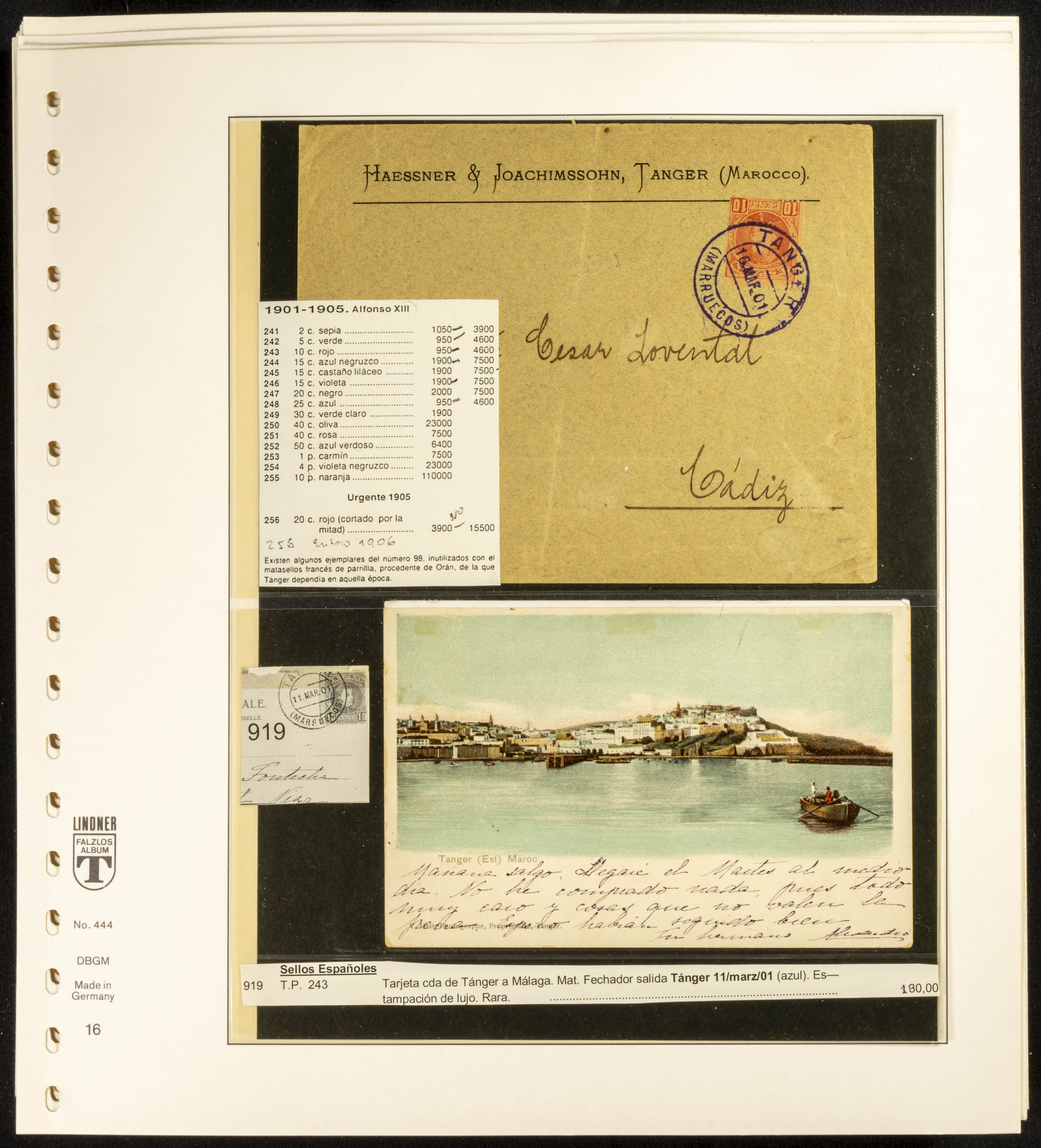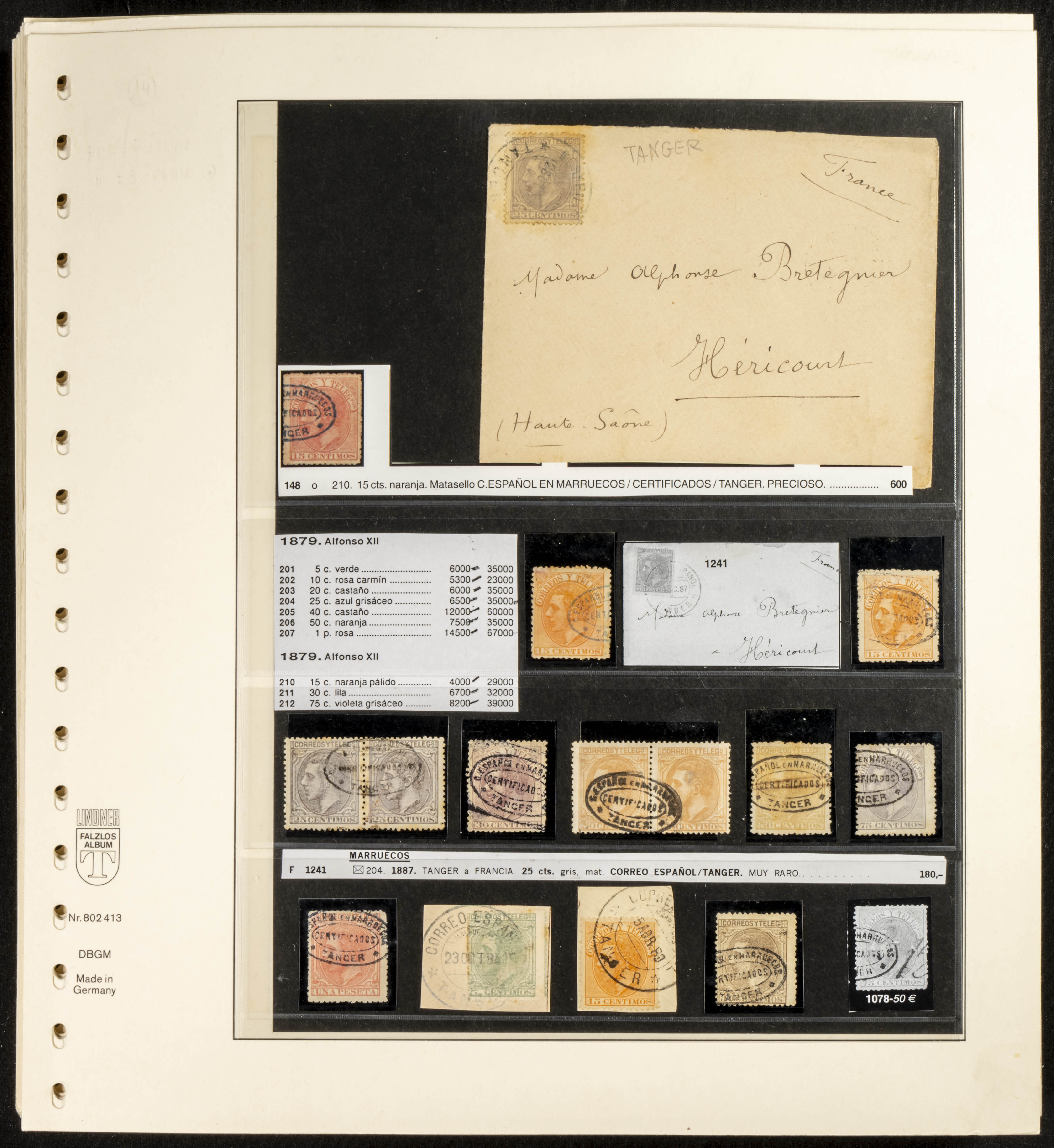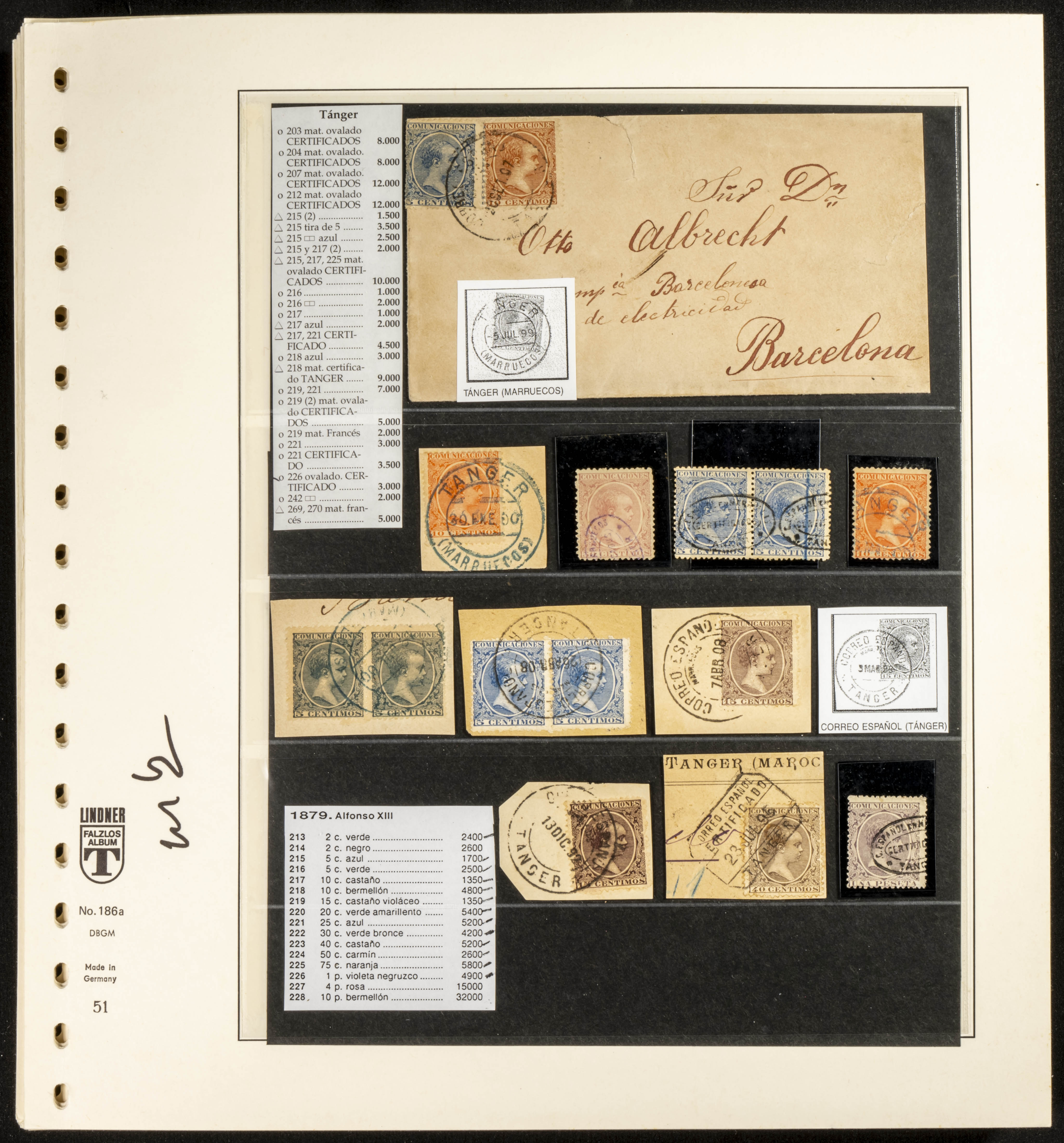 ★/(1876ca). Espectacular colección de Tánger entre 1876 y 1955, en nuevo y usado, destacando el apartado de emisiones de Alfonso XII y Alfonso XIII (Pelón y Cadete) con matasellos especiales del Correo Español en Tánger con alguna carta, series completas, así como numerosas variedades de sobrecarga, color, dentado, etc, fragmentos con matasellos especiales, más de cien cartas y tarjetas postales, la mayoría circuladas, franqueos especiales con sellos de España, etc. MAGNIFICO Y MUY COMPLETO Y ESPECIALIZADO CONJUNTO.