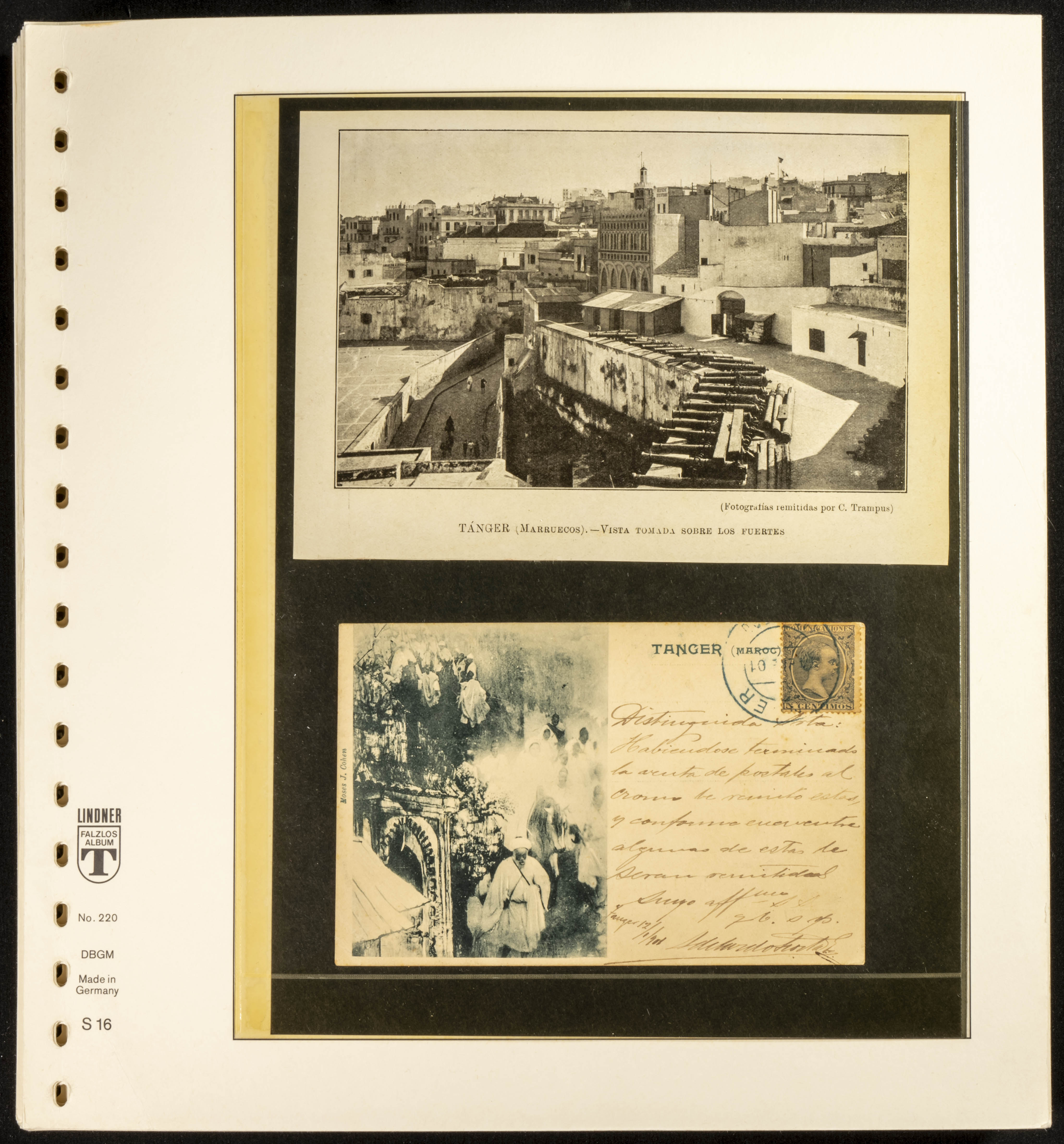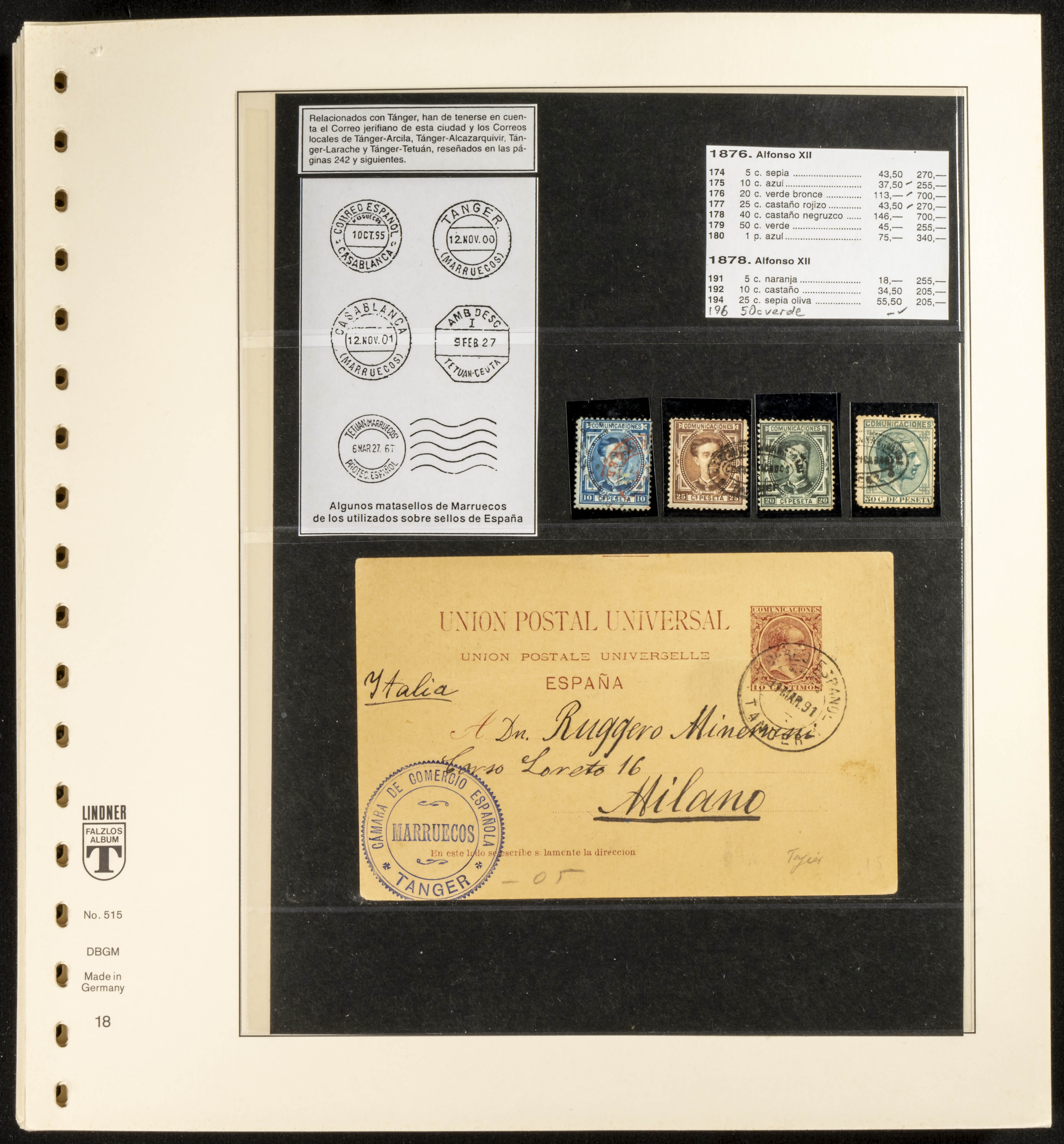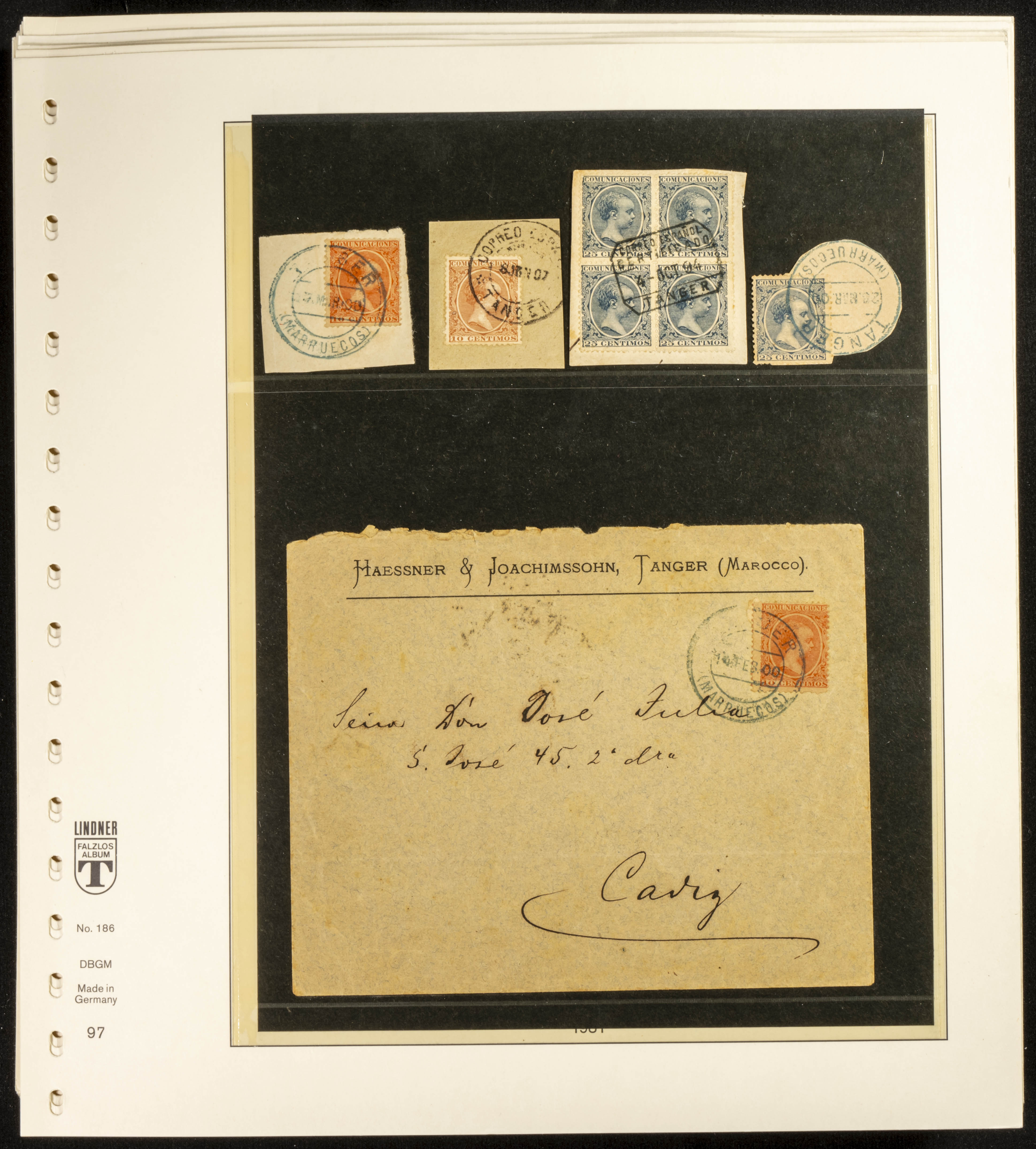★/(1876ca). Espectacular colección de Tánger entre 1876 y 1955, en nuevo y usado, destacando el apartado de emisiones de Alfonso XII y Alfonso XIII (Pelón y Cadete) con matasellos especiales del Correo Español en Tánger con alguna carta, series completas, así como numerosas variedades de sobrecarga, color, dentado, etc, fragmentos con matasellos especiales, más de cien cartas y tarjetas postales, la mayoría circuladas, franqueos especiales con sellos de España, etc. MAGNIFICO Y MUY COMPLETO Y ESPECIALIZADO CONJUNTO.
