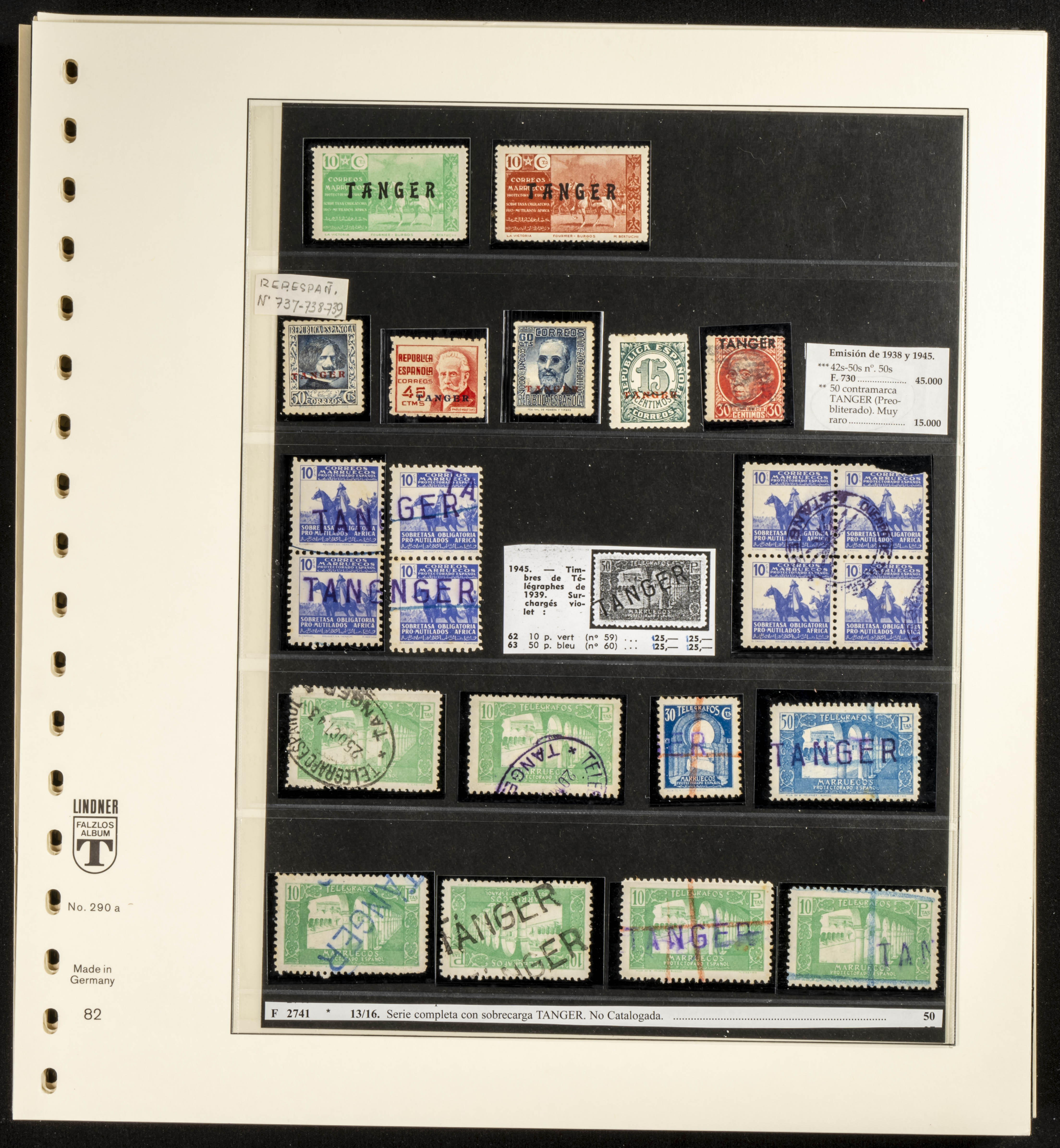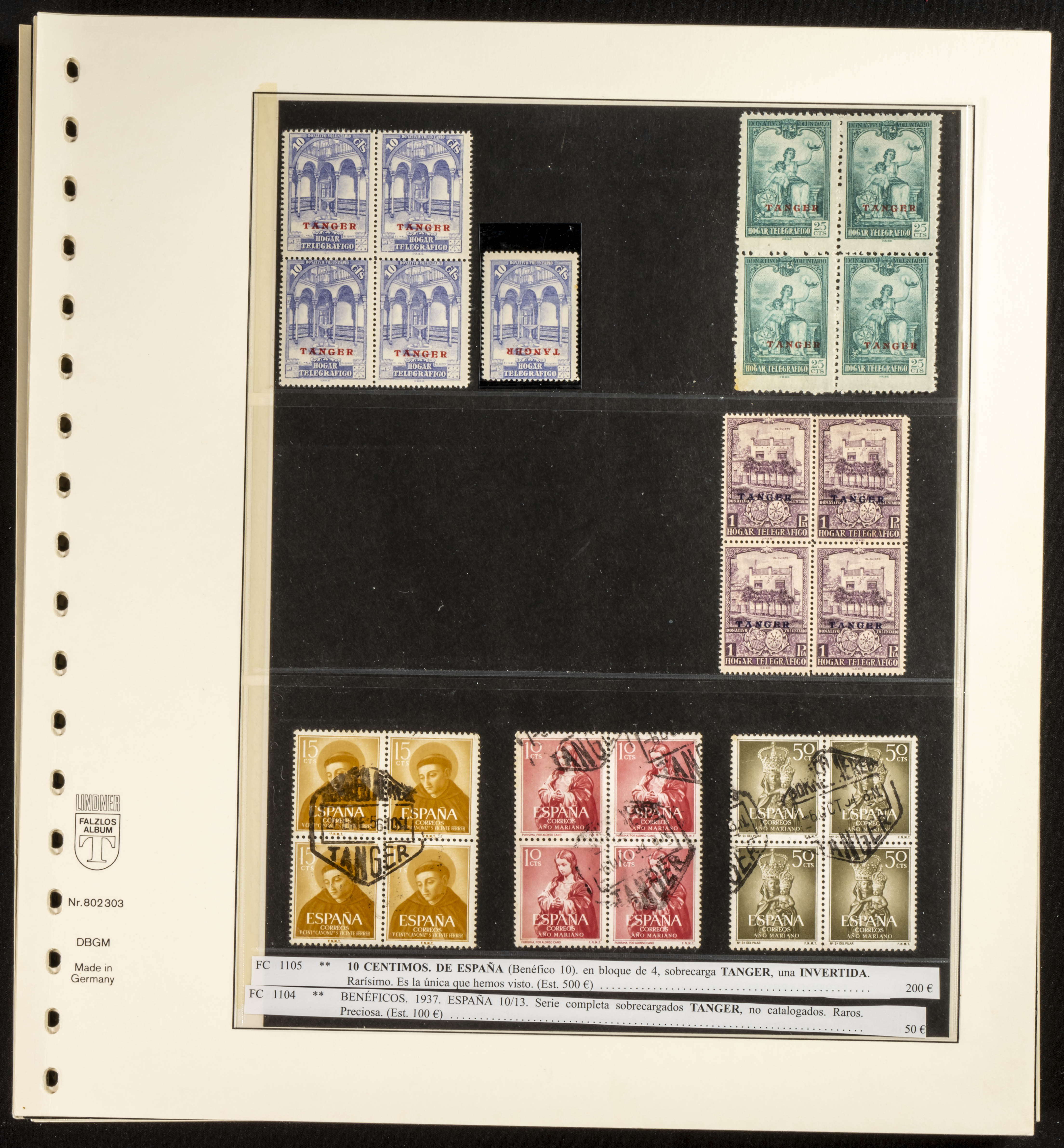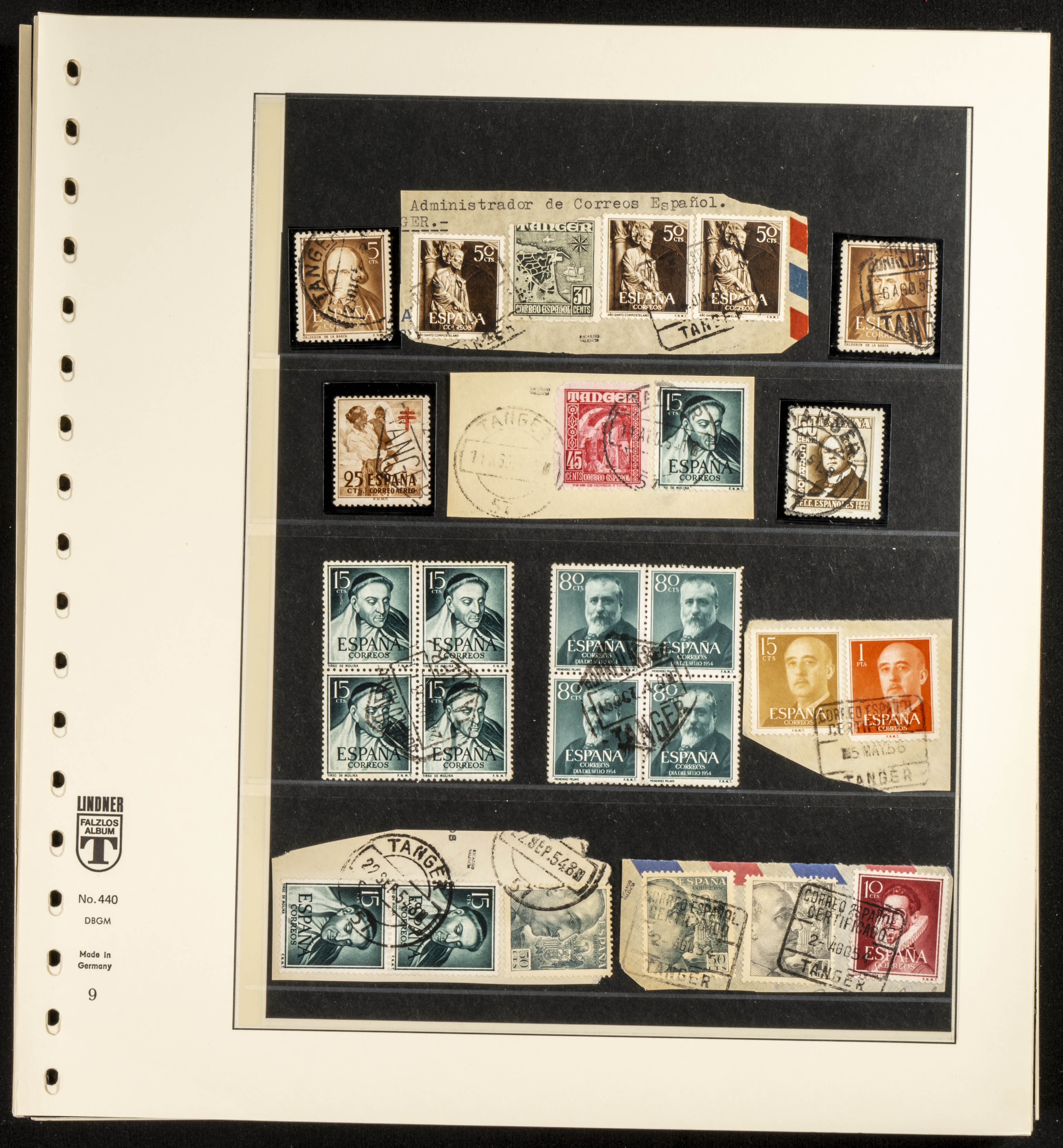 (1946ca). Interesante conjunto-colección de más de setenta cartas y tarjetas postales franqueadas con sellos de España y circuladas entre 1946 y 1956, algunas con franqueos mixtos Tánger-España, incluye decenas de sellos sueltos, fragmentos y bloques con matasellos TANGER, así como algunos sellos anteriores con sobrecargas TANGER diversas, poco usuales y varios matasellos especiales. A EXAMINAR.