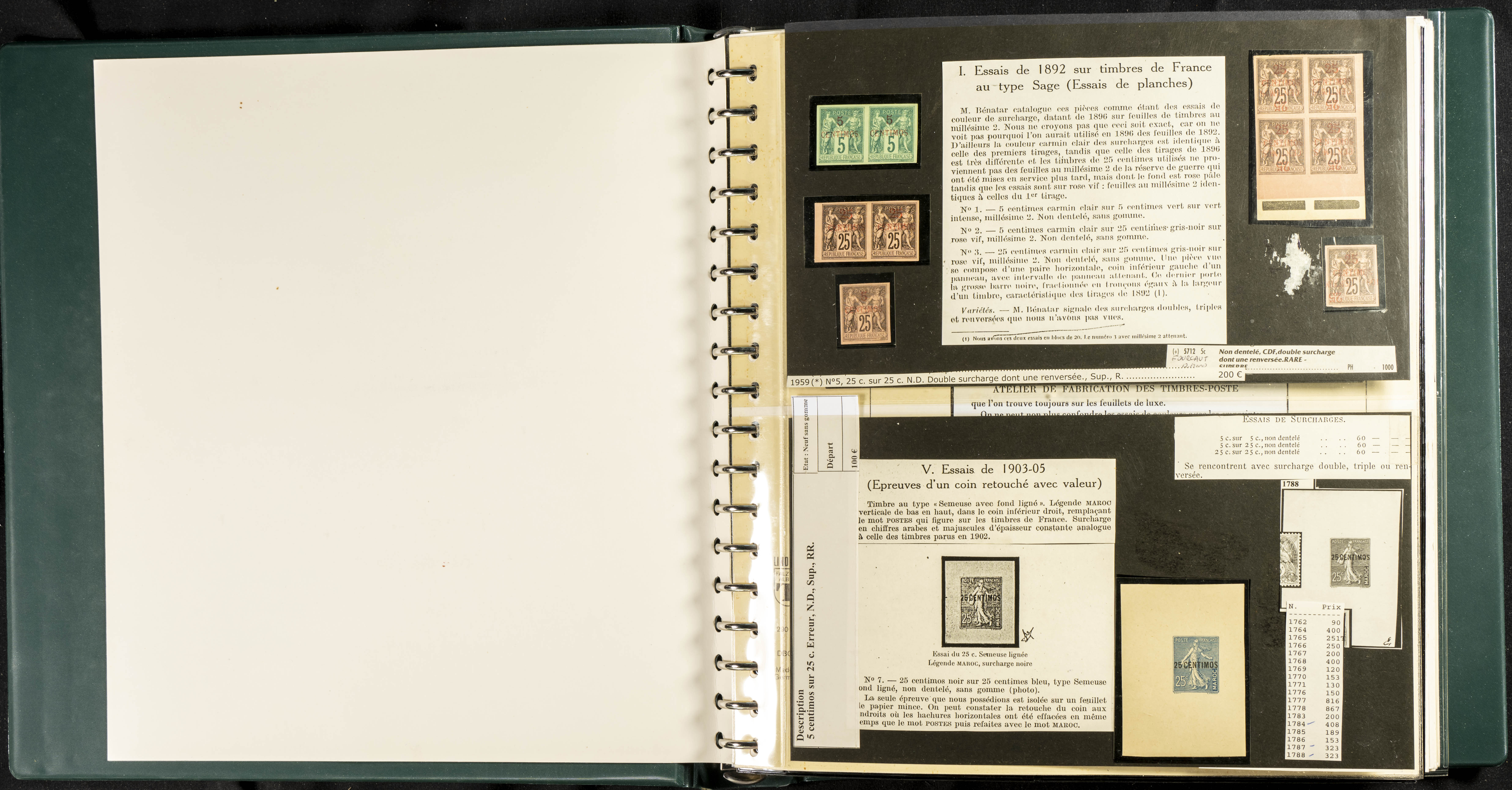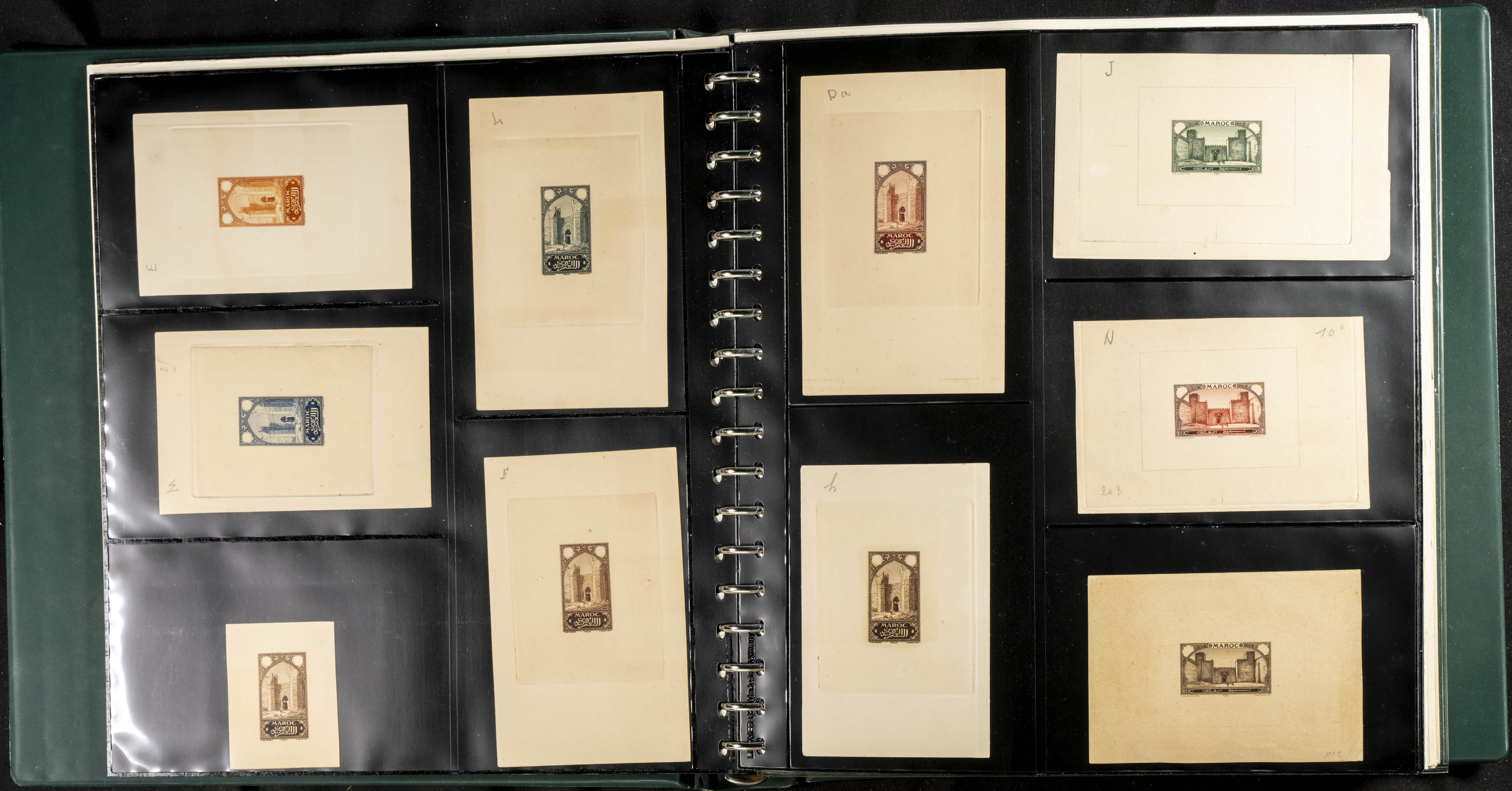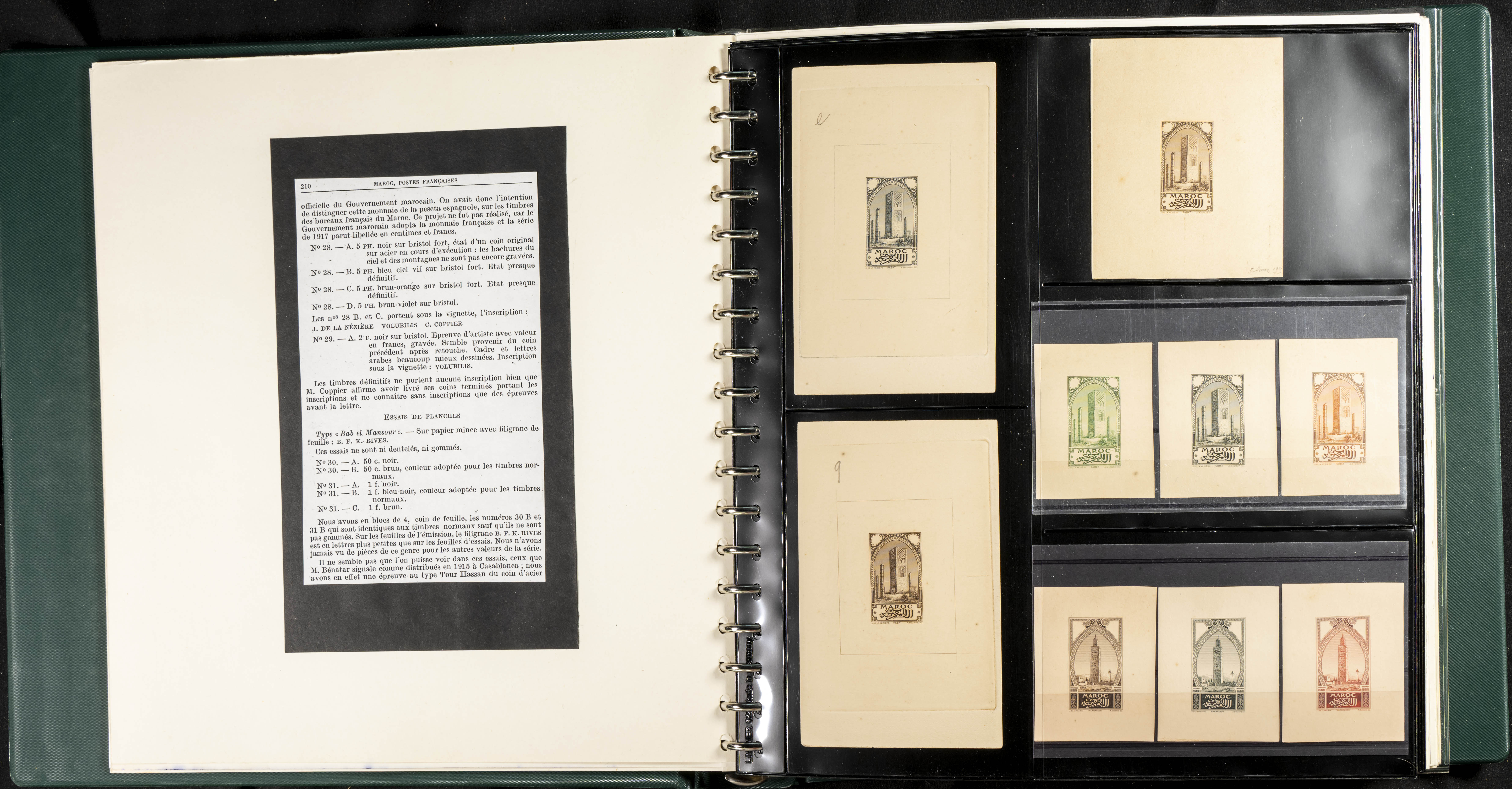 (★)(1892ca). Espectacular y muy completa colección de pruebas de Marruecos Francés entre 1892 y 1956, incluye PRUEBAS DE ARTISTA (muchas firmadas), Pruebas de Estado (con indicaciones), Ensayos de Color, Pruebas de Color (con numeración del color), Pruebas No Adoptadas, Pruebas de Grabado, carpetas u hojas de presentación, destacando seis pruebas fotográficas de la emisión de Monumentos de 1917, más de cuarenta pruebas de artista y de color de las emisiones de Monumentos de 1917 y 1923, Pruebas Colectivas de Flandria no emitidas de 1946, prueba colectiva de 1945 de Lyautey no aprobada, varias pruebas colectivas de color y en negro, cuatro pruebas colectivas no emitidas de Lyautey de 1935, etc. MAGNIFICA Y OFRECIDA INTACTA. IMPRESCINDIBLE EXAMINAR.